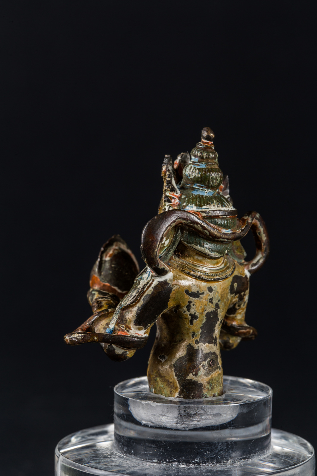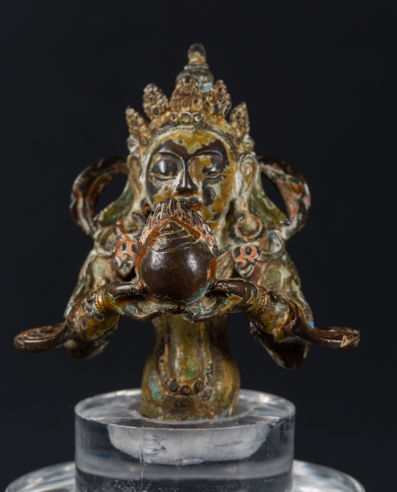Nepal, periodo Thakuri, XIV secolo . -. Cm 6,00 x 7,00. Piccolo busto ritraente un personaggio non identificato abbellito da vesti svolazzanti, gioielli e corona a cinque punte. La figura offre con entrambe le mani la pietra preziosa del pensiero cintamani. Sulla superficie sono presenti cospicue tracce di colore. Da notare una spiccata influenza dello stile cinese.