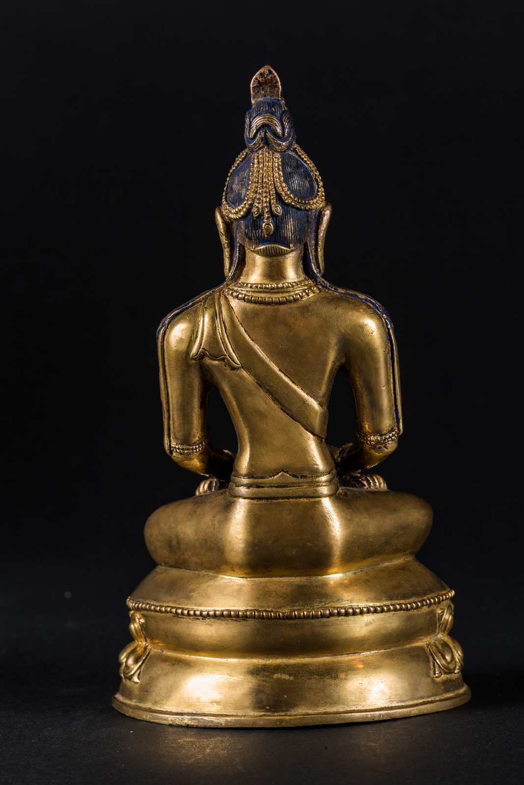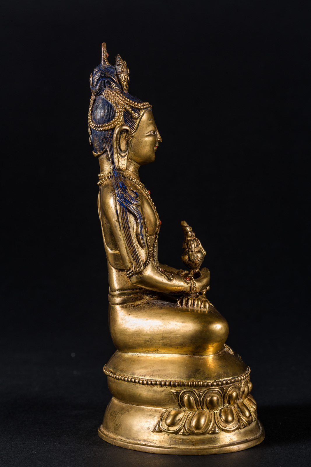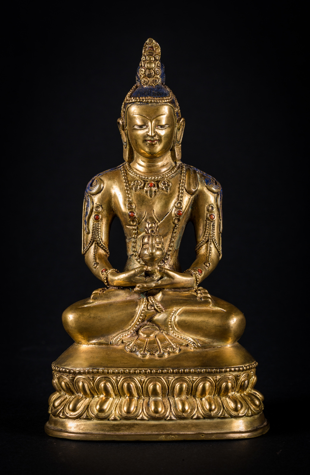Cina, dinastia Qing in stile Qianlong . -. Cm 10,30 x 18,00. Fusione raffigurante Amitayus seduto in padmasana su una base a doppio fiore di loto, le mani giunte in grembo in posizione dhyanamudra accolgono la kalasa. La figura è ornata con ricchi gioielli abbelliti da pietre preziose. La capigliatura, dall'inteso colore blu, è sciolta fino alle spalle. Sono presenti pigmenti policromi sul volto.