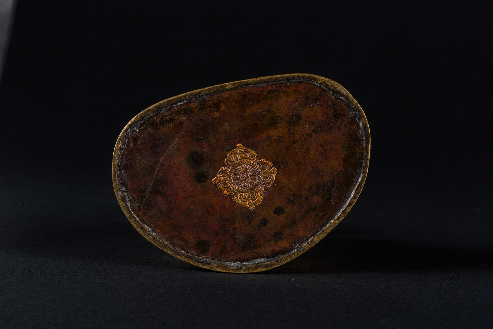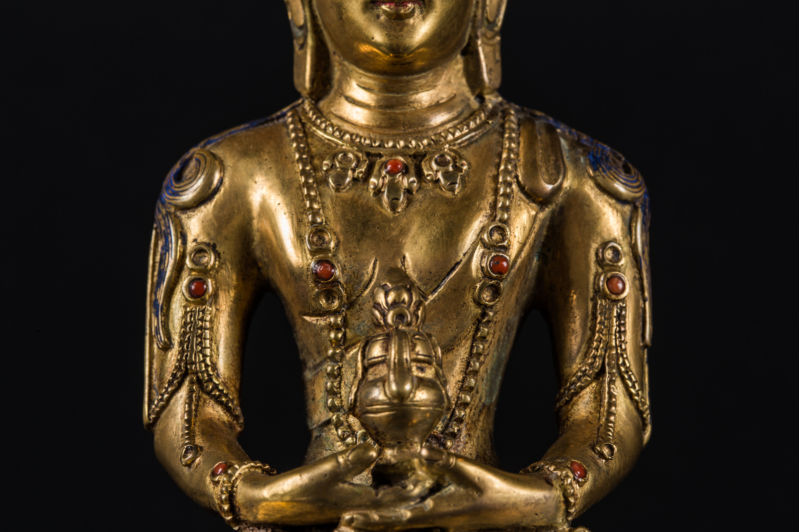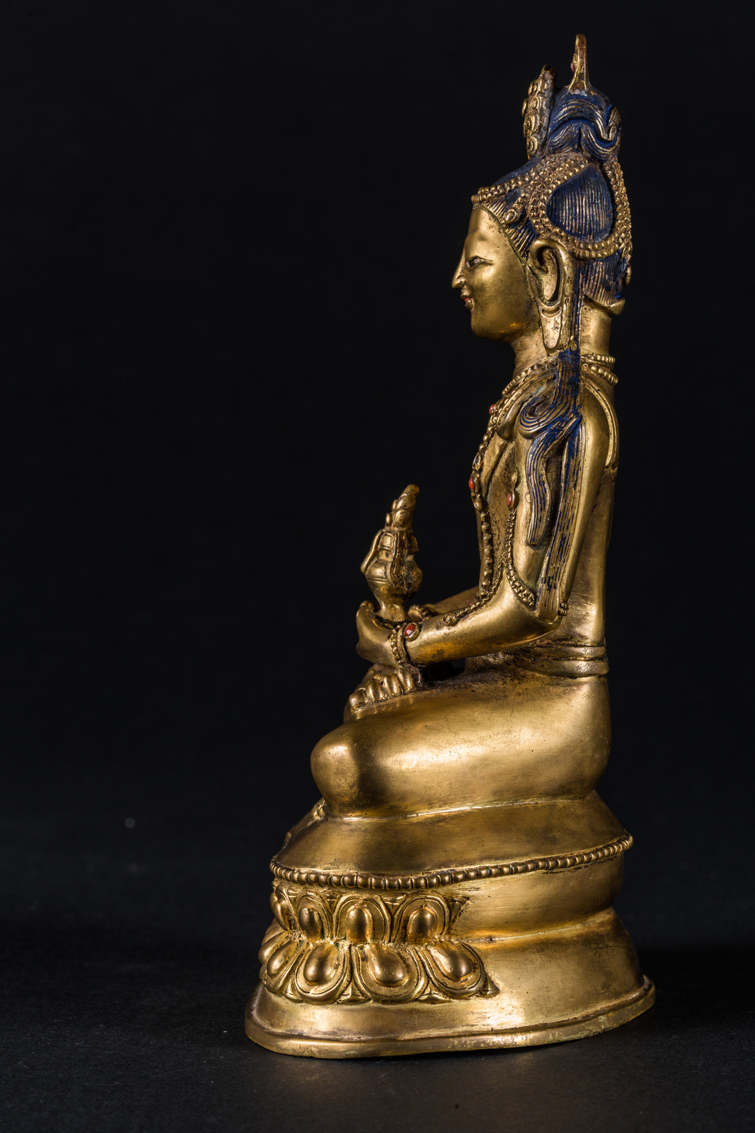 Cina, dinastia Qing in stile Qianlong . -. Cm 10,30 x 18,00. Fusione raffigurante Amitayus seduto in padmasana su una base a doppio fiore di loto, le mani giunte in grembo in posizione dhyanamudra accolgono la kalasa. La figura è ornata con ricchi gioielli abbelliti da pietre preziose. La capigliatura, dall'inteso colore blu, è sciolta fino alle spalle. Sono presenti pigmenti policromi sul volto.