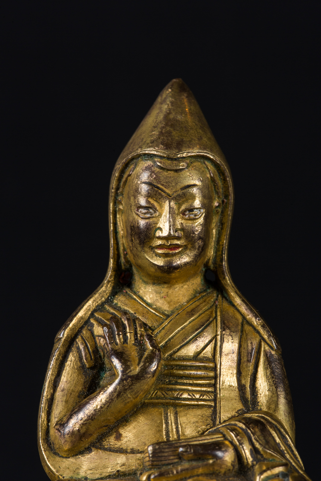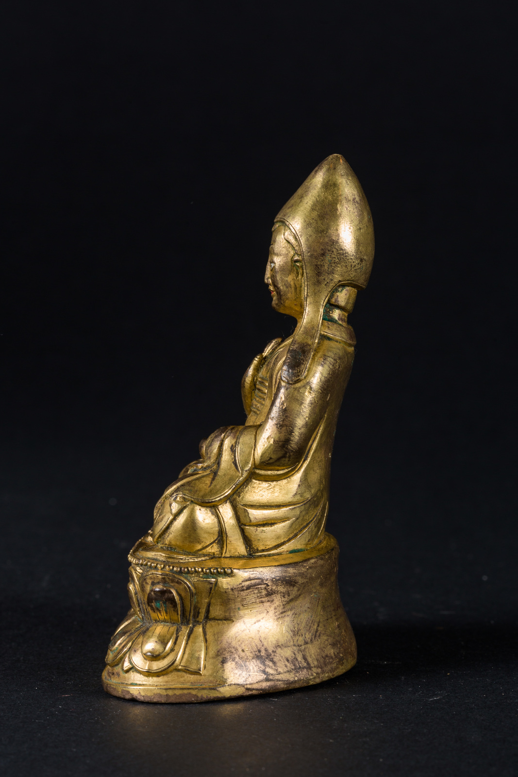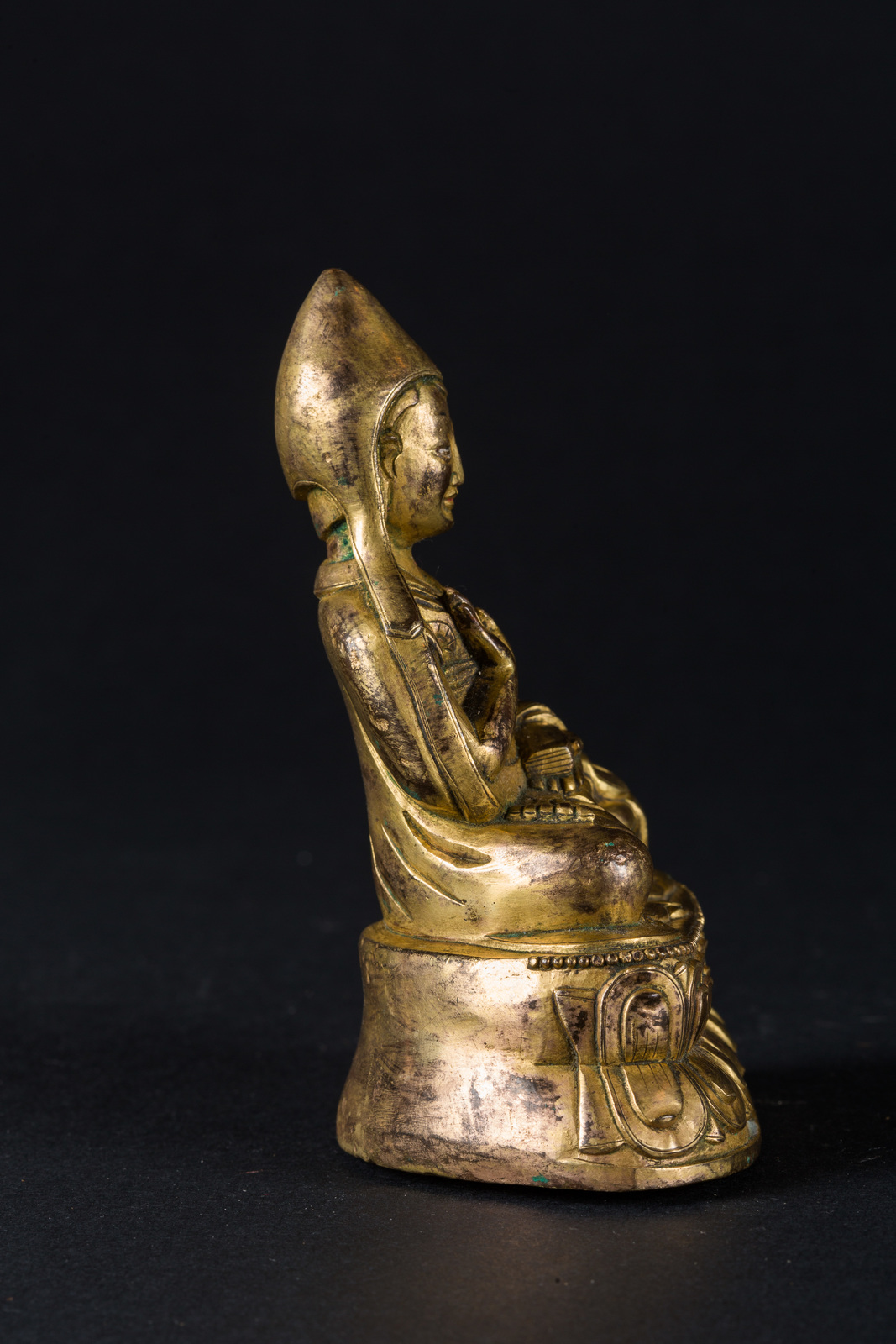 Tibet, XVII secolo . -. Cm 8,20 x 13,00. Seduto in padmasana su una base a doppio fiore di loto, la mano destra nel gesto di incoraggiamento abhayamudra, la sinistra, in avakasamudra, regge un libro. La figura veste abiti monacali e porta il copricapo a punta caratteristico della scuola Gelug-pa. Presenti pigmenti ed argento sul volto.