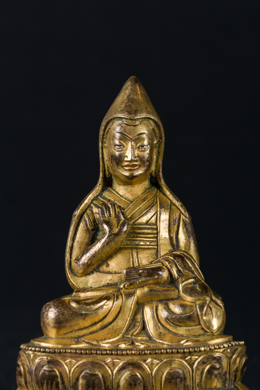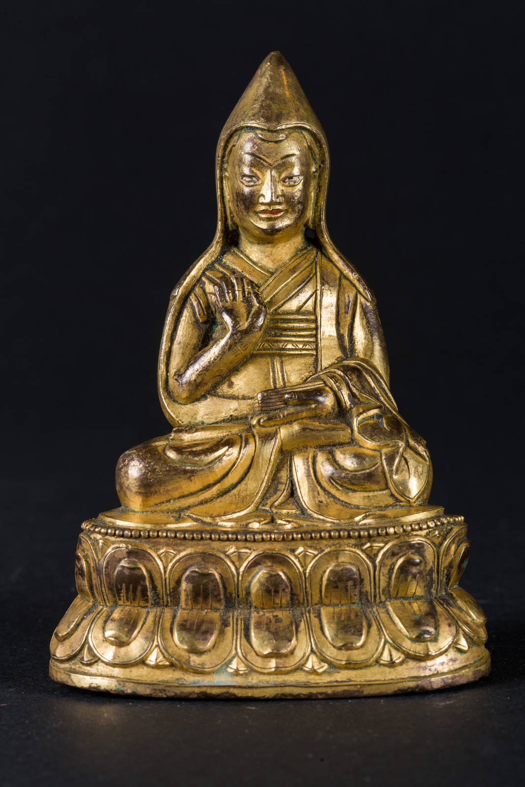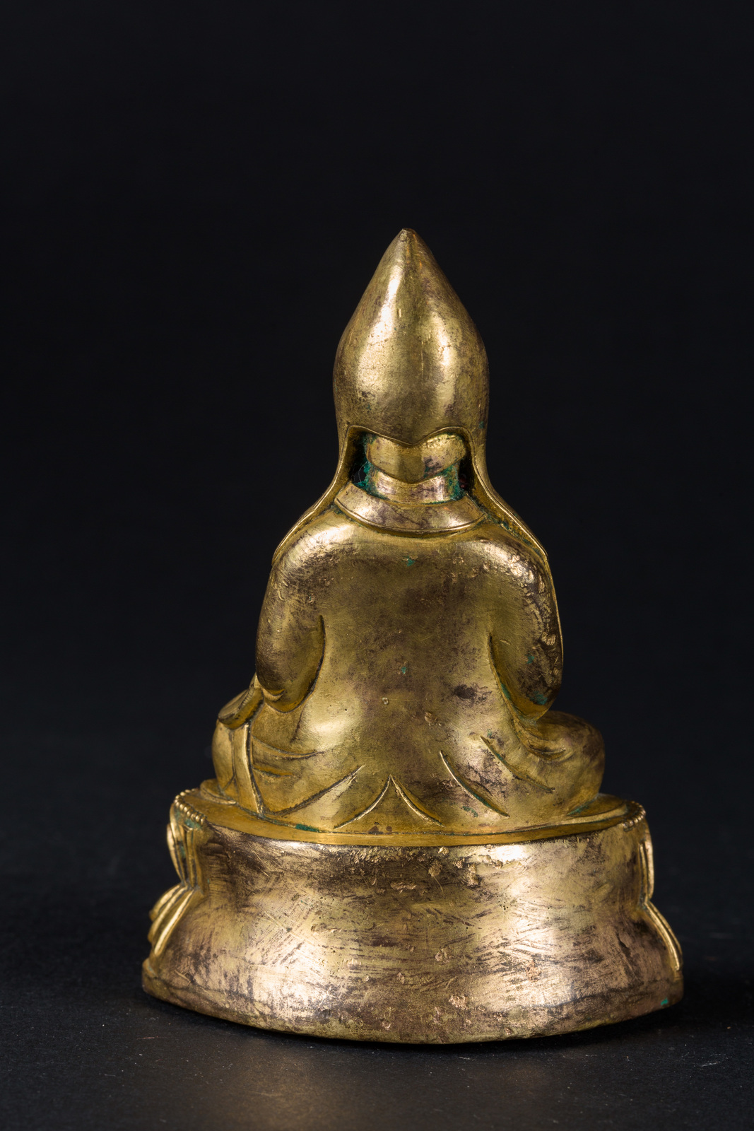 Tibet, XVII secolo . -. Cm 8,20 x 13,00. Seduto in padmasana su una base a doppio fiore di loto, la mano destra nel gesto di incoraggiamento abhayamudra, la sinistra, in avakasamudra, regge un libro. La figura veste abiti monacali e porta il copricapo a punta caratteristico della scuola Gelug-pa. Presenti pigmenti ed argento sul volto.