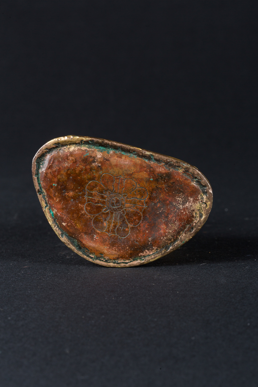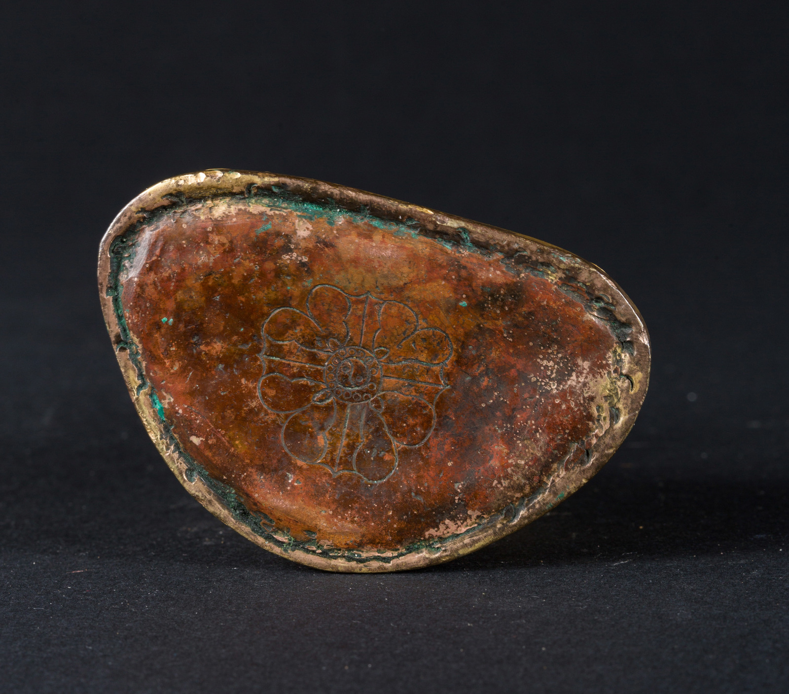 Tibet, 17th century . . Cm 8,20 x 13,00. The character sits in the padmasana position on a double lotus flower base. The right hand performs the abhayamudra gesture while the left, in the avakasamudra, holds a book. The character wears monastic robes and the typical headdress of the Gelug-pa school. Traces of silver and pigments are visible on the face.