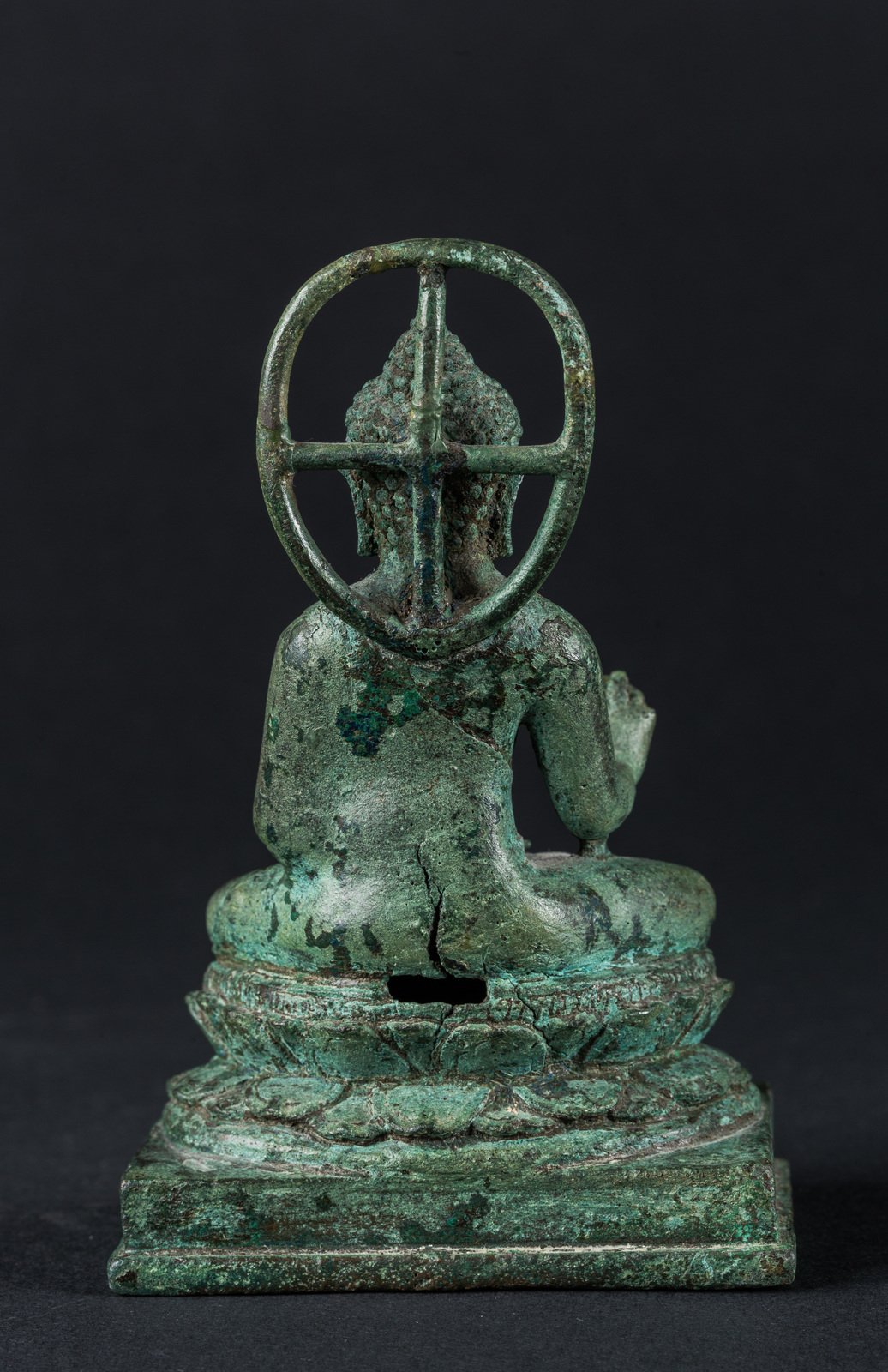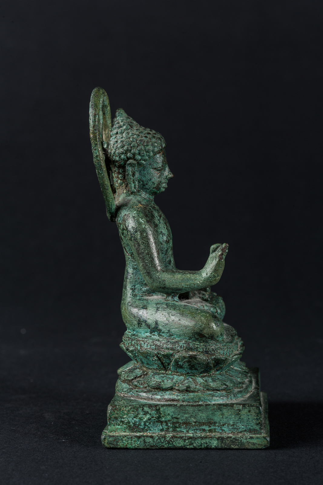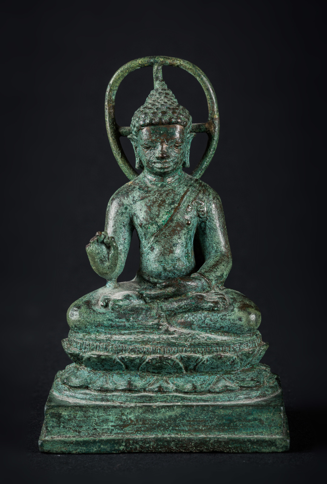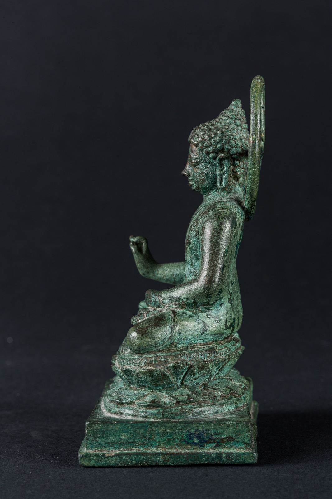 Indonesia, XIV-XV secolo . -. Cm 9,00 x 14,00. Fusione in bronzo raffigurante Vairocana seduto in padmasana su una base a fiore di loto poggiante su un supporto squadrato. La mano sinistra adagiata in grembo in avakasamudra e la destra nel gesto di esposizione della dottrina vitarkamudra. Sul retro della testa aureola circolare. L'intera figura è coperta da una spessa patina verde.