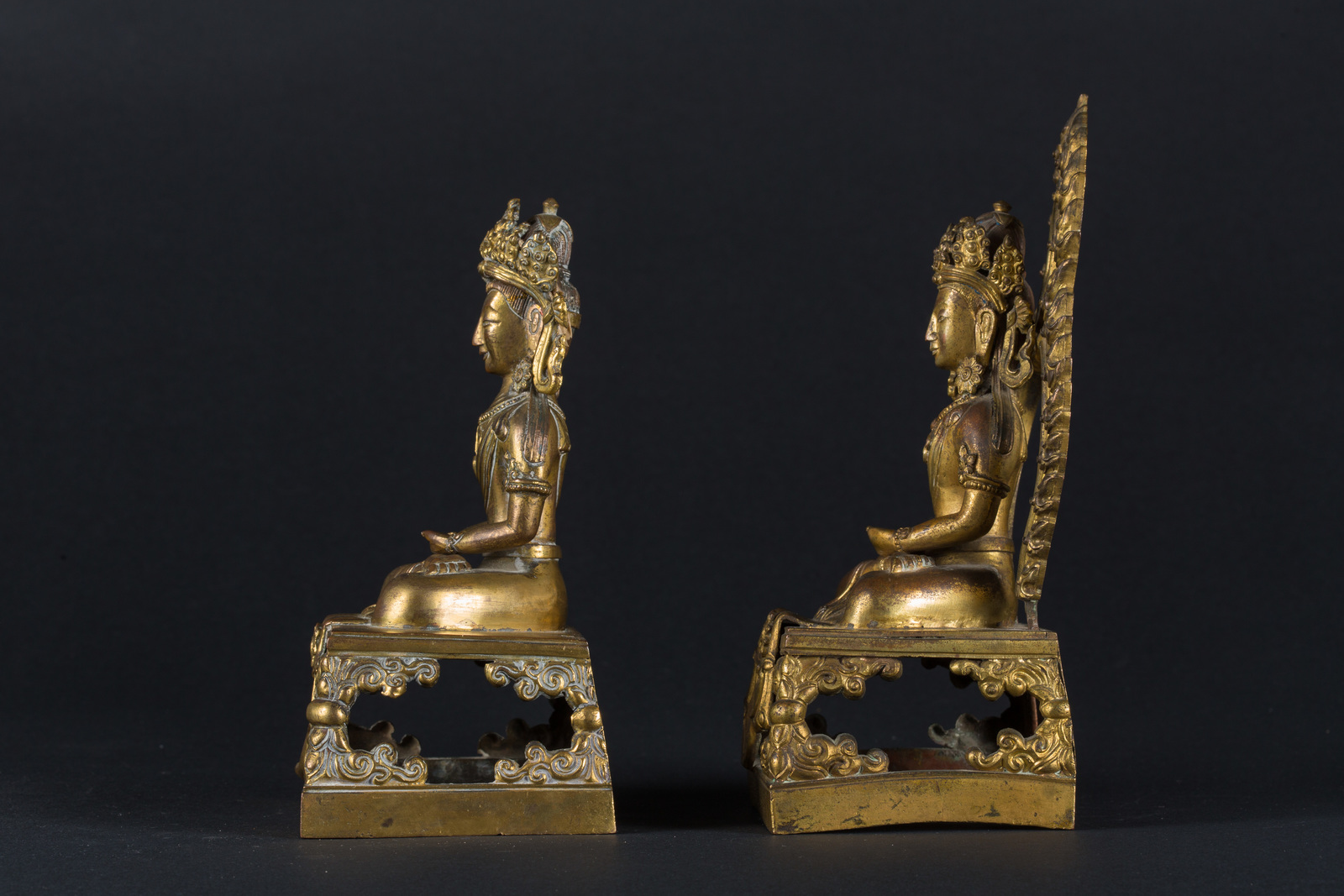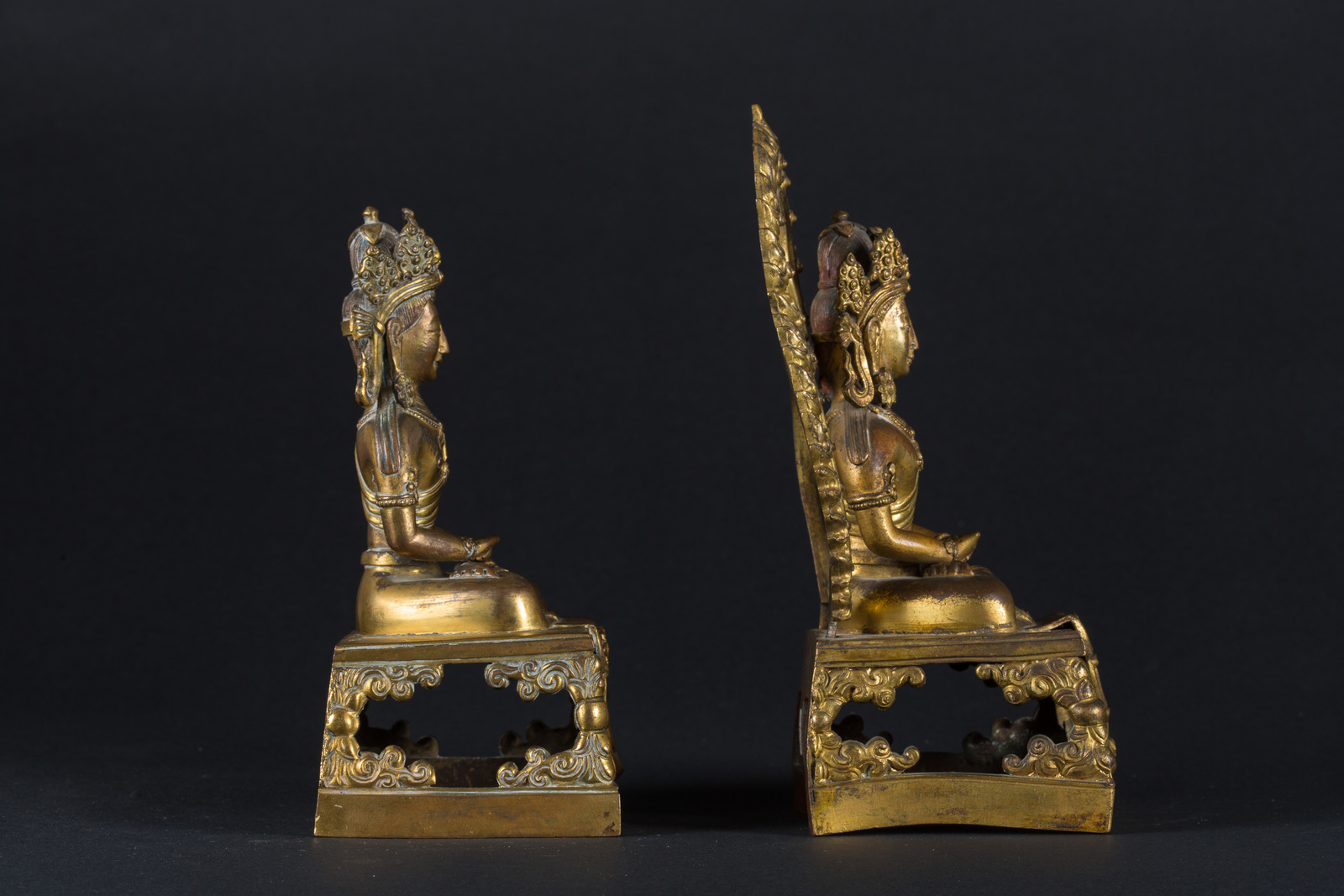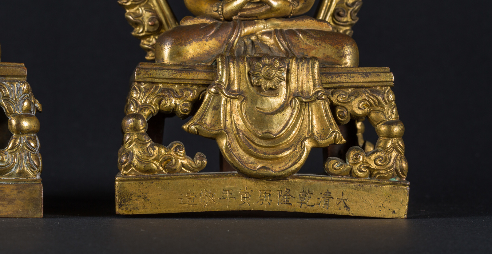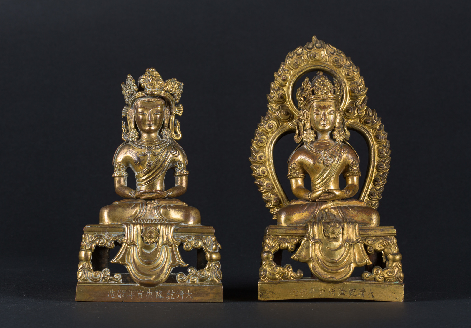 Cina, periodo Qianlong, XVIII secolo . -. Cm 11,50 x 21,00 x 8,80. Fusioni raffiguranti il Buddha trascendente Amitayus seduto in padmasana su un piedistallo rialzato e traforato, ricoperto con un drappo decorato con motivi fitomorfi. Le mani giunte in grembo in dhyanamudra e porta corona e gioielli caratteristici della sua classe. Entrambe le basi recano un'iscrizione che recita"fatto nell'anno Qianlong 1770", mentre all'interno mostrano la numerazione tipica di questa tipologia di manufatti.