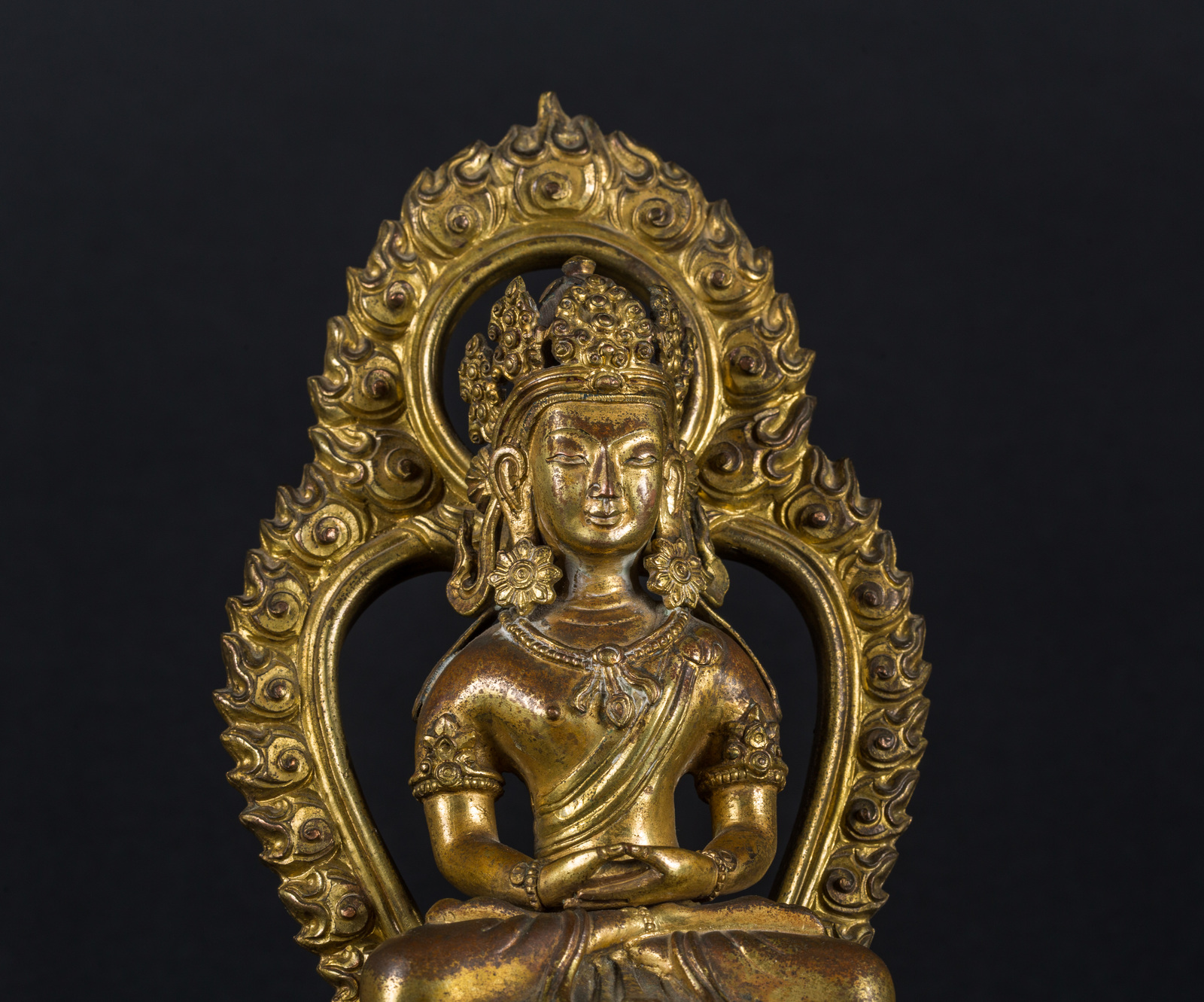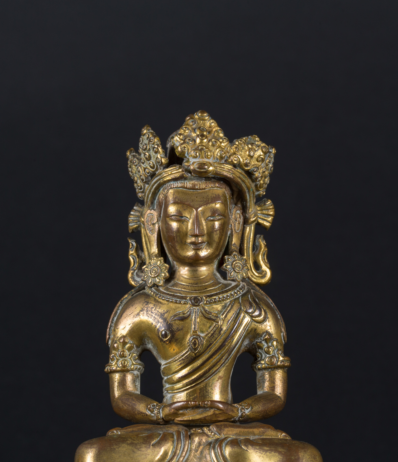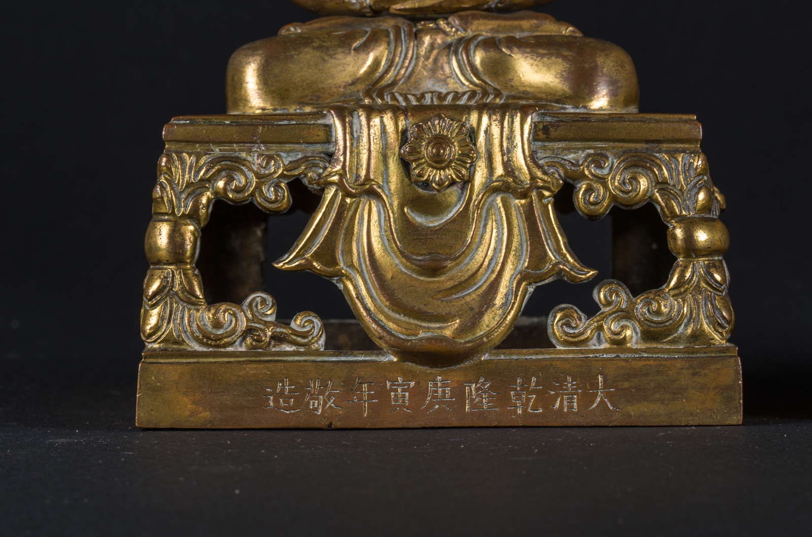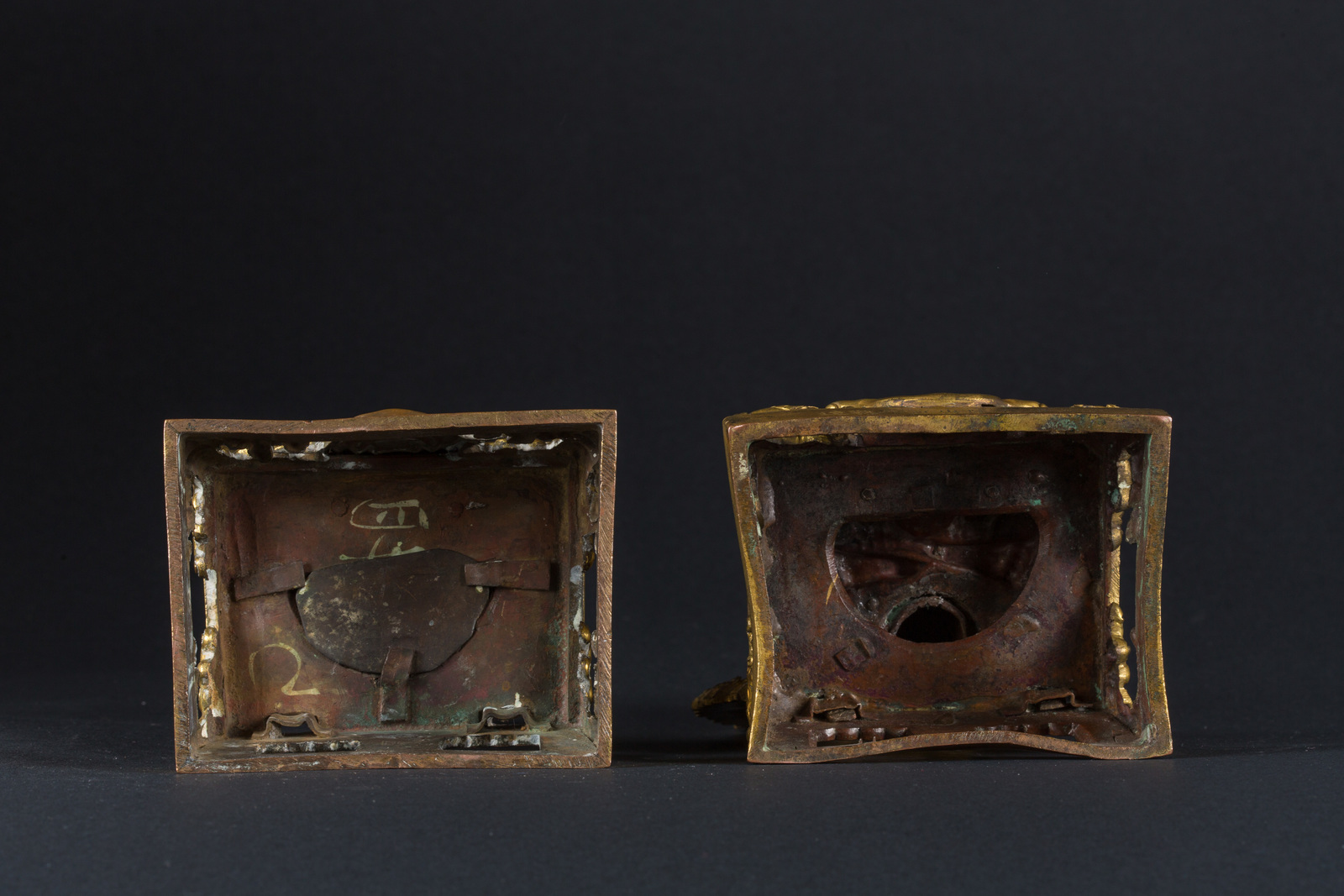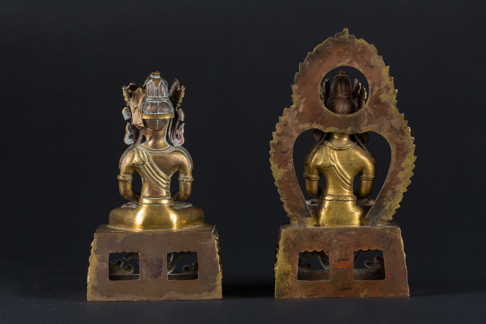 Cina, periodo Qianlong, XVIII secolo . -. Cm 11,50 x 21,00 x 8,80. Fusioni raffiguranti il Buddha trascendente Amitayus seduto in padmasana su un piedistallo rialzato e traforato, ricoperto con un drappo decorato con motivi fitomorfi. Le mani giunte in grembo in dhyanamudra e porta corona e gioielli caratteristici della sua classe. Entrambe le basi recano un'iscrizione che recita"fatto nell'anno Qianlong 1770", mentre all'interno mostrano la numerazione tipica di questa tipologia di manufatti.