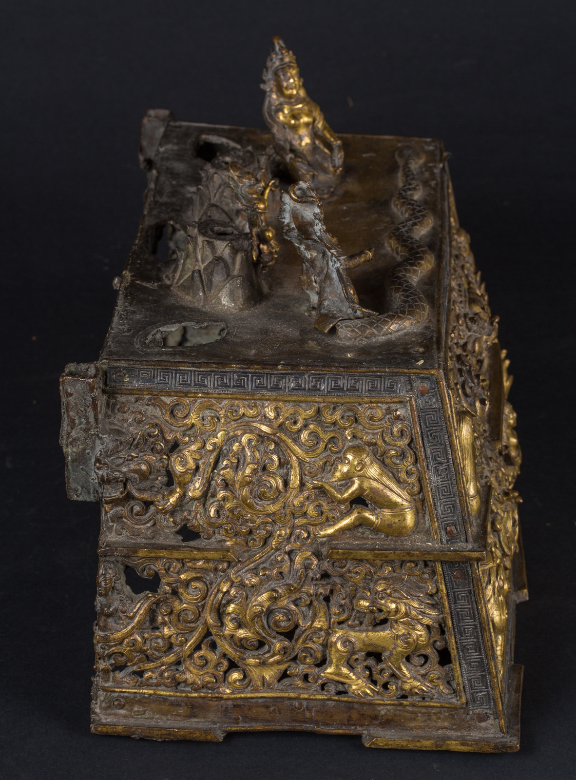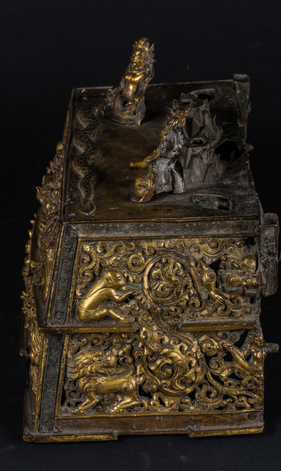 . -. Cm 35,00 x 26,50 x 19,00. di forma rettangolare, lavorata a traforo con motivi fitomorfi circolari e cornici a greche. Sulla parte frontale è possibile distinguere il mostro benevolo cheppu, affiancato da due gyalpo, due makara ed una nagini. Lateralmente il decoro prosegue con gli stessi motivi, ritraendo inoltre dei leoni delle nevi. La parte superiore reca due fiori di loto capovolti, atti ad ospitare i piedi di una statua ormai persa, e tre figure: un bodhisattva, una nagini con lunga coda rettile ed ua piccola figura probabilmente identificabile con la dakini simhamukha in posizione centrale.