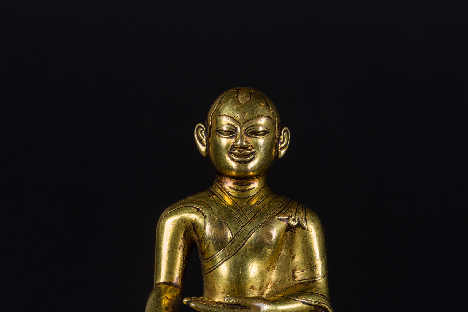 Arte Himalayana A copper alloy figure of a guru Tibet, 15th century . . Cm 11,00 x 13,50. Provenance: Günter Heil Collection (1938-2014) Berlin.