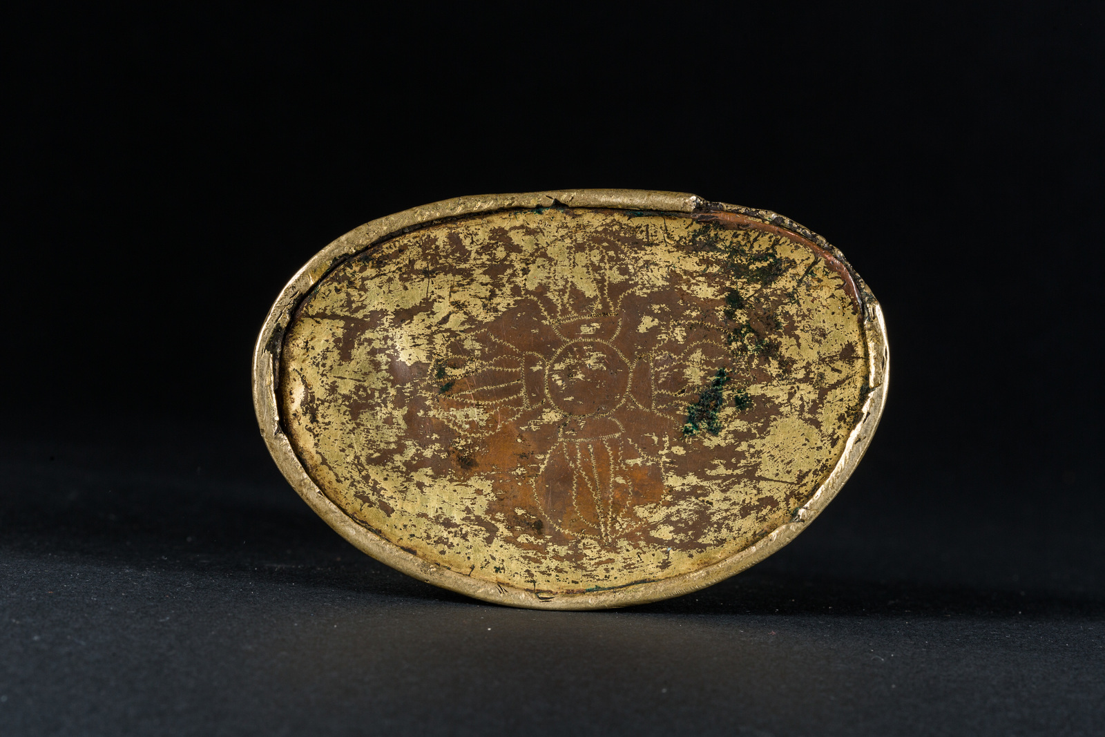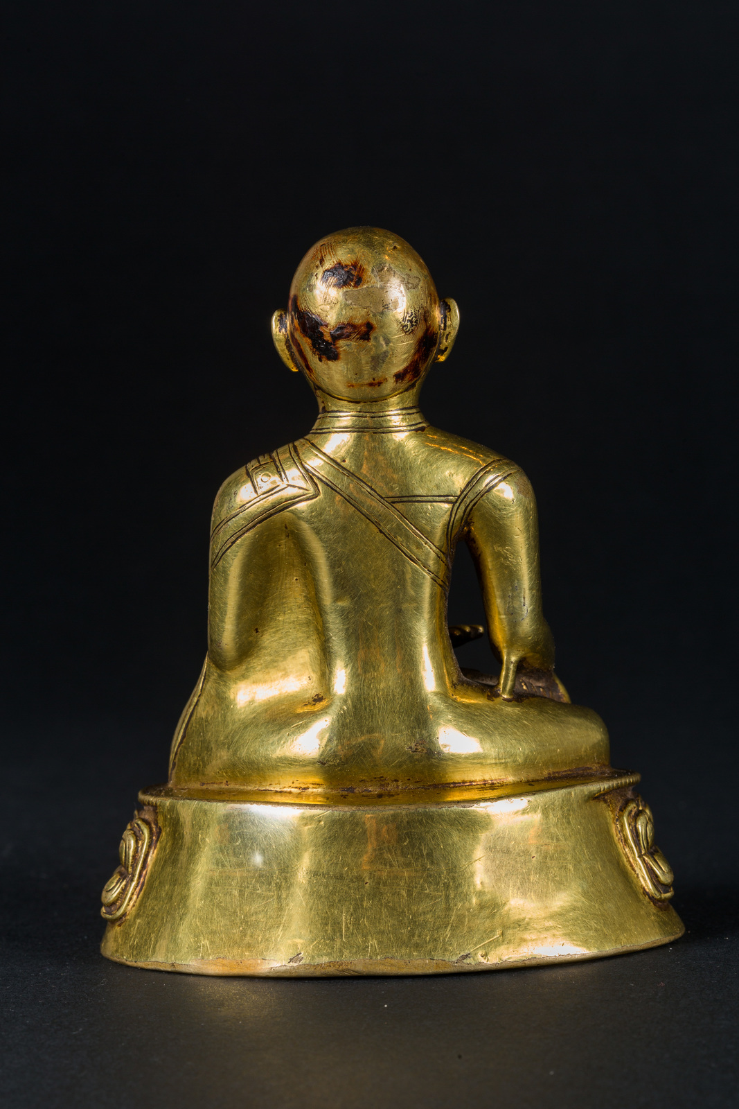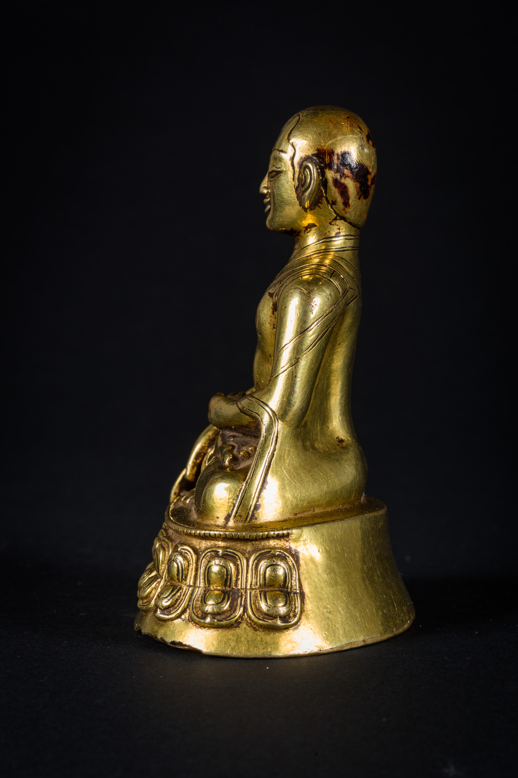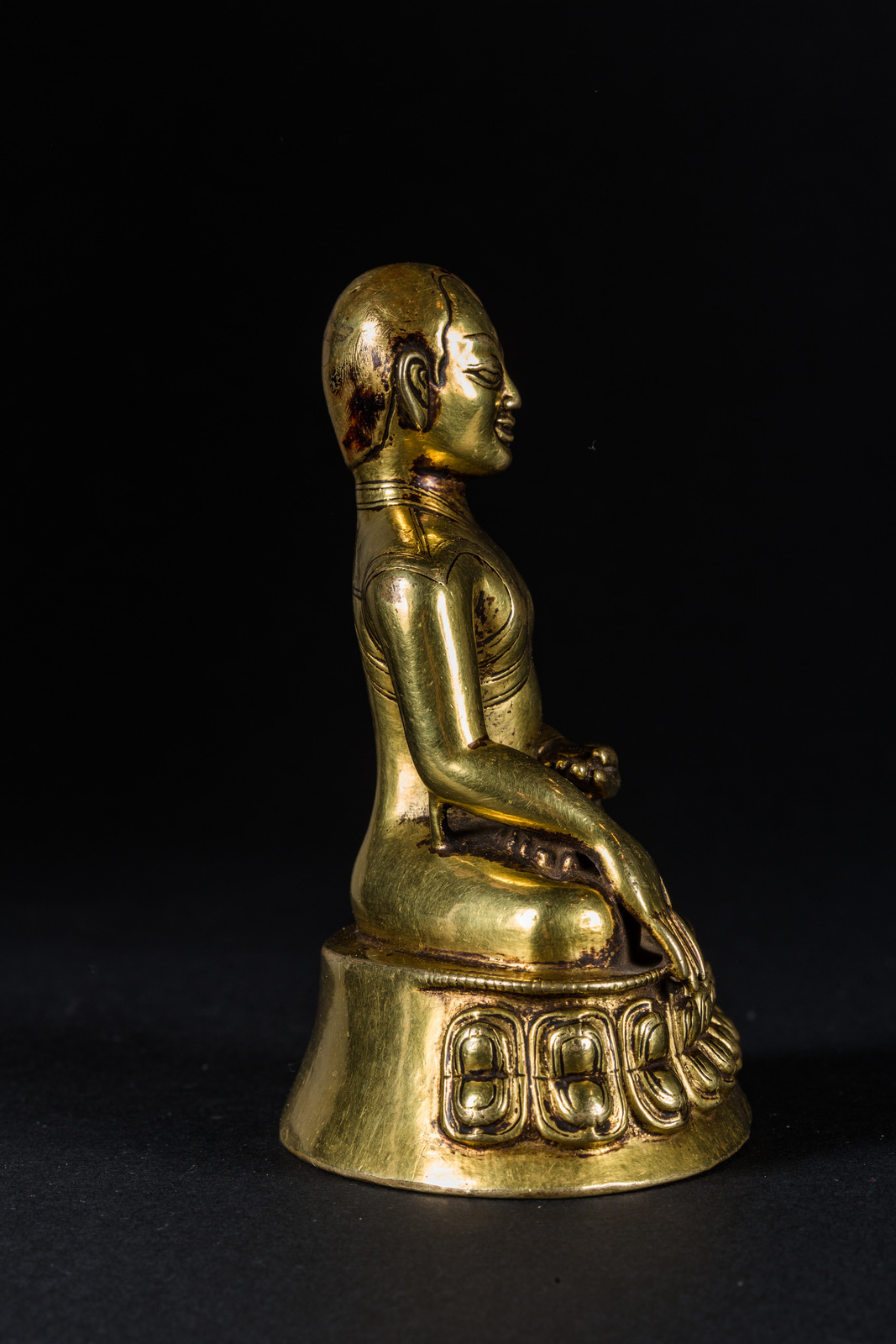 Arte Himalayana Fusione in lega di rame raffigurante maestro Tibet, XV secolo . -. Cm 11,00 x 13,50. Fusione laminata in oro raffigurante un maestro della scuola Kagyu. Seduto in posizione padmasana su una base a doppio fior di loto con un piccolo vajra inciso nella porzione inferiore, tiene la mano sinistra in grembo in posizione avakasamudra, e la destra nel gesto di contatto con la terra bhumisparsamudra. Veste abiti monacali. Base ancora sigillata e incisa con un visvavajra. Difficilmente identificabile, il personaggio qui ritratto potrebbe essere uno dei seguenti maestri: Zhangton Konchok Pel (1250-1317), Gyergom Tshulthrim Sengge (1144-1204), Gyergom Chenpo Shonnu Dragpa (1090-1171). Provenienza: Collezione Günter Heil (1938-2014) Berlino