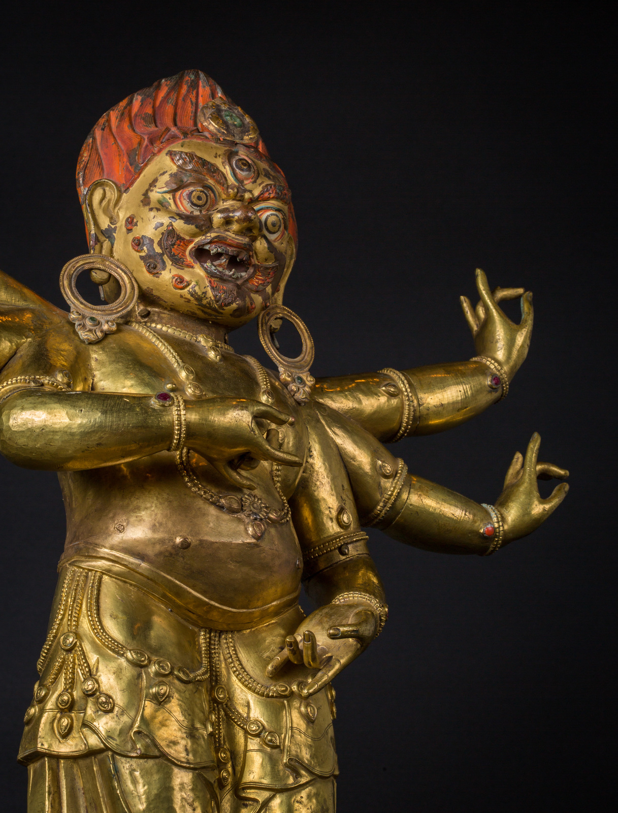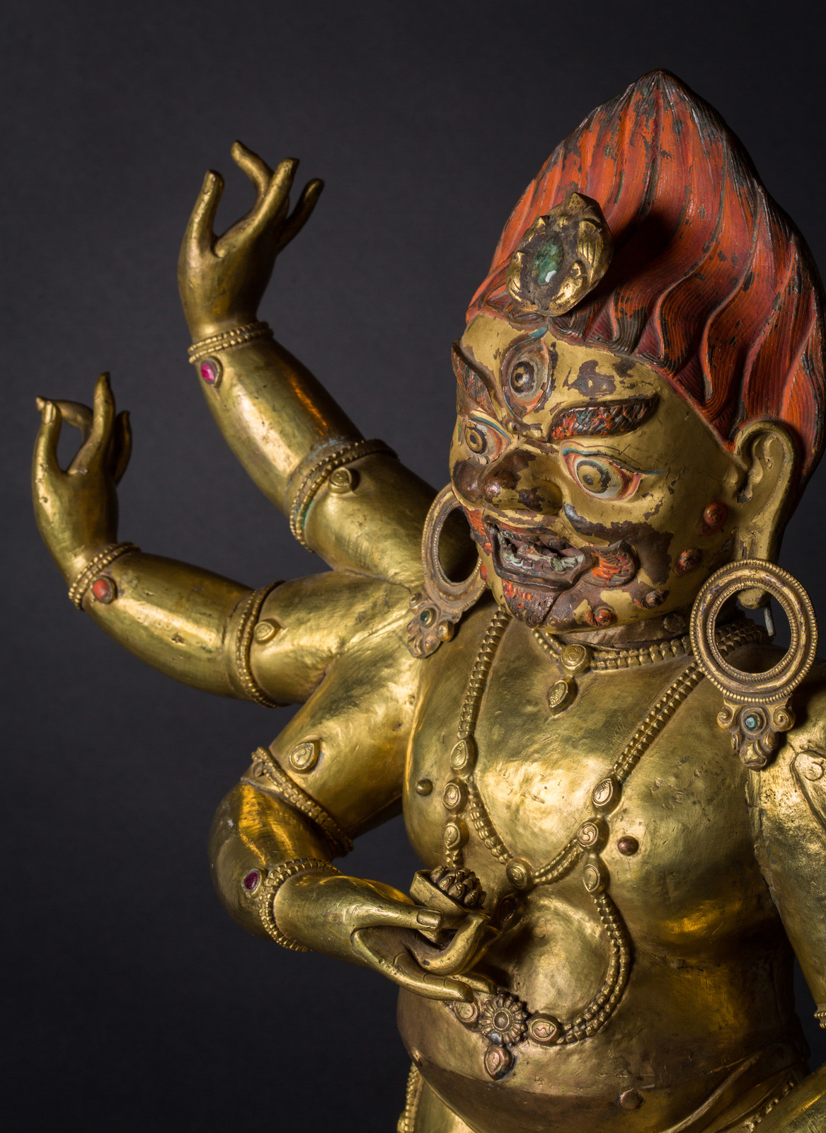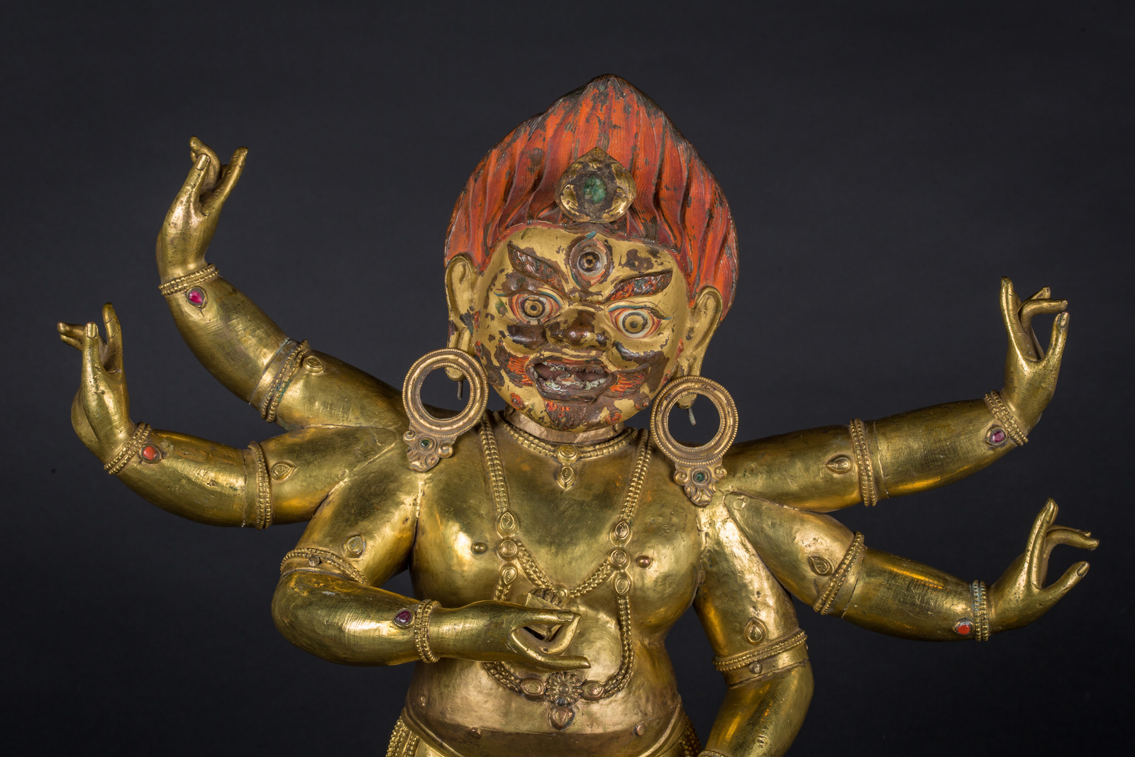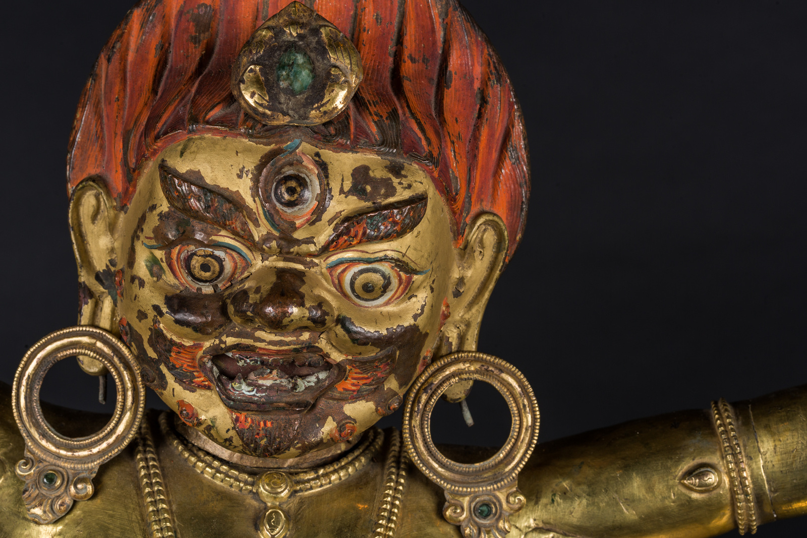 Il volto, dall'espressione irata, è interamente dipinto con pigmenti originali, presenta accenni di barba, un grande terzo occhio, fiamme che fuoriescono dalla bocca ed una capigliatura fiammeggiante con al centro un diadema in radice di smeraldo. Su caviglie, polsi e gioielli è possibile notare vetri colorati e pietre preziose, tra cui: radici di rubino e coralli, probabilmente coevi. Mani e piedi della figura sono realizzati in fusione.