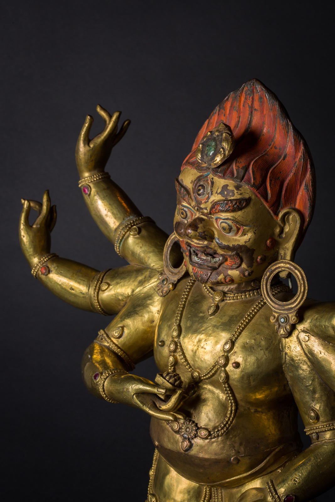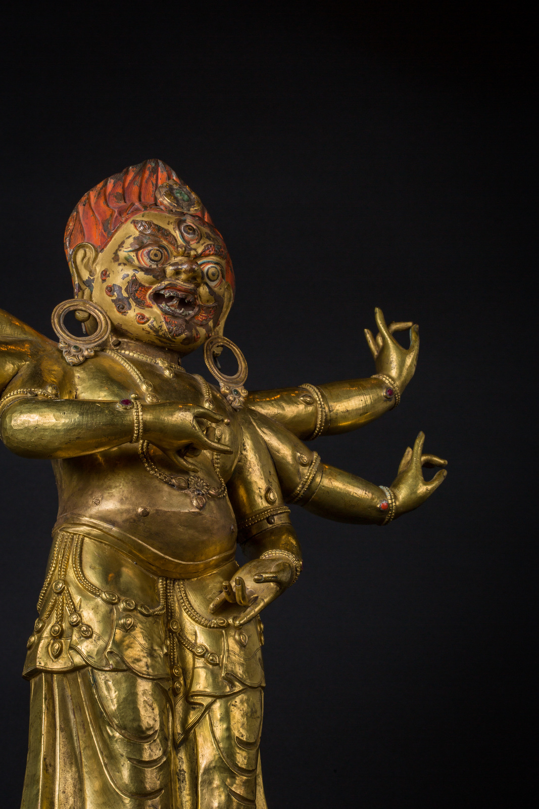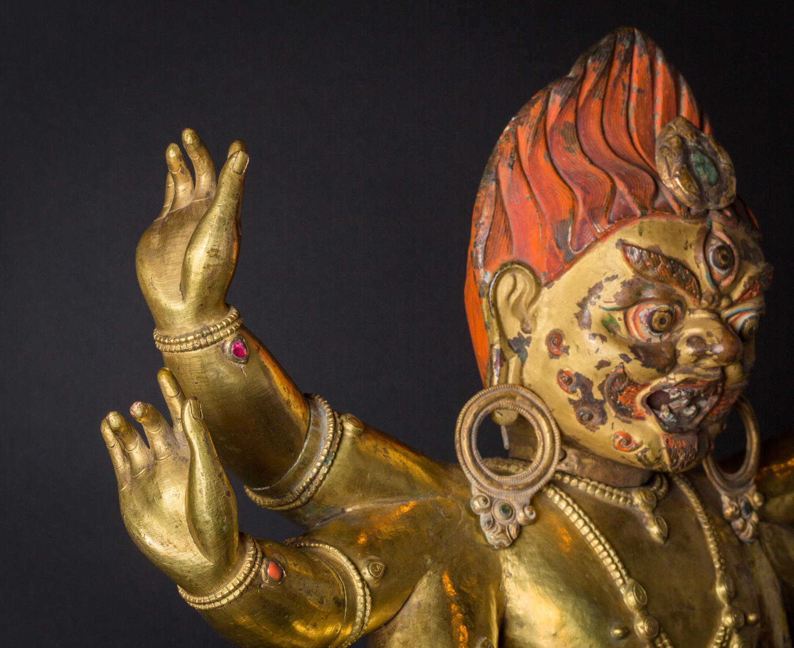 Il volto, dall'espressione irata, è interamente dipinto con pigmenti originali, presenta accenni di barba, un grande terzo occhio, fiamme che fuoriescono dalla bocca ed una capigliatura fiammeggiante con al centro un diadema in radice di smeraldo. Su caviglie, polsi e gioielli è possibile notare vetri colorati e pietre preziose, tra cui: radici di rubino e coralli, probabilmente coevi. Mani e piedi della figura sono realizzati in fusione.