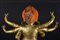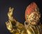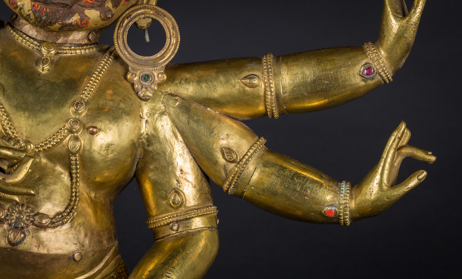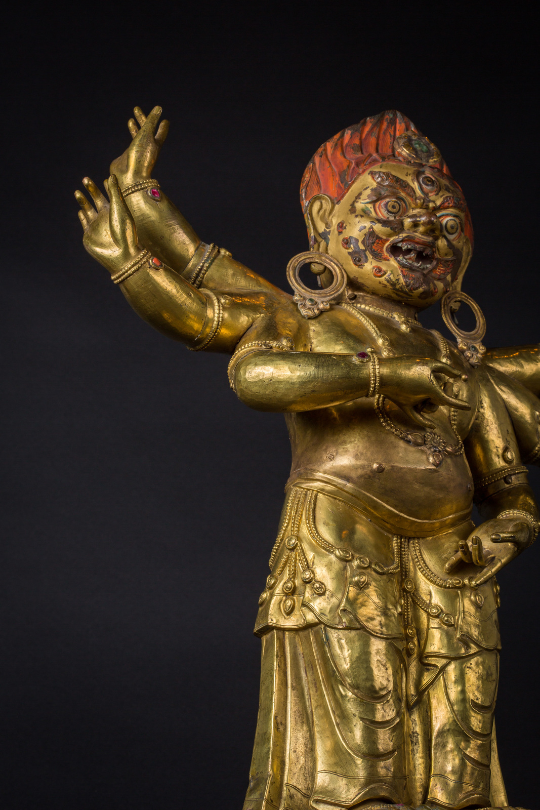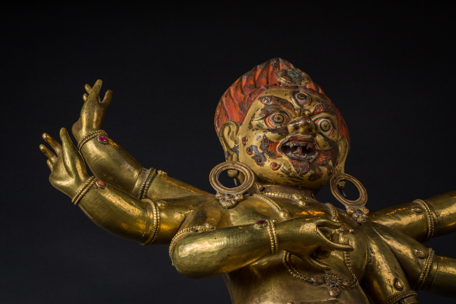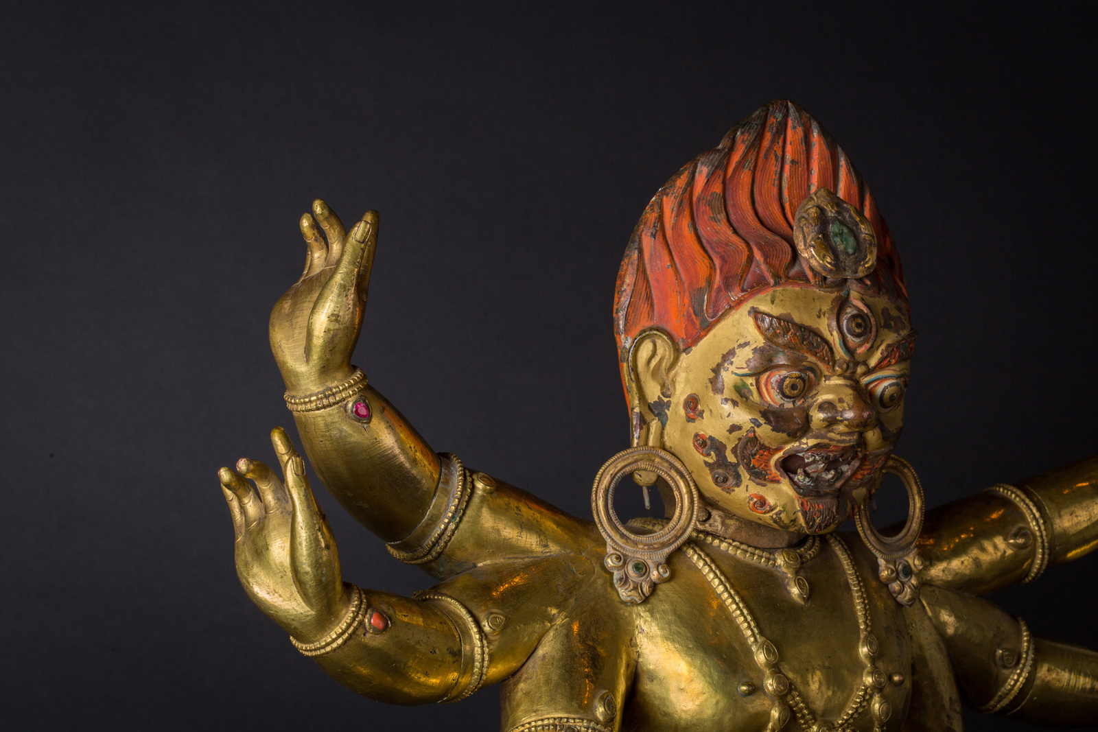 Il volto, dall'espressione irata, è interamente dipinto con pigmenti originali, presenta accenni di barba, un grande terzo occhio, fiamme che fuoriescono dalla bocca ed una capigliatura fiammeggiante con al centro un diadema in radice di smeraldo. Su caviglie, polsi e gioielli è possibile notare vetri colorati e pietre preziose, tra cui: radici di rubino e coralli, probabilmente coevi. Mani e piedi della figura sono realizzati in fusione.