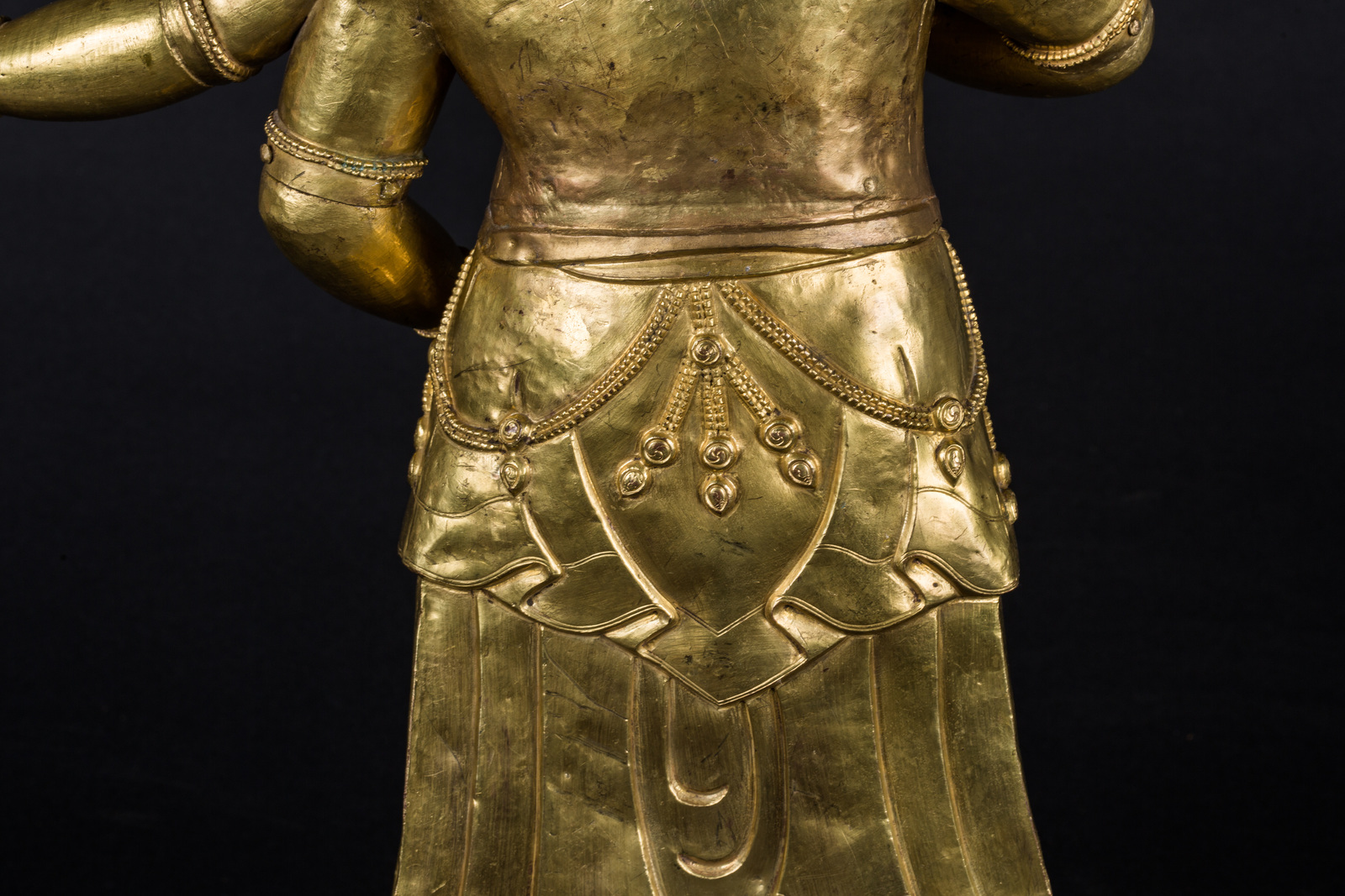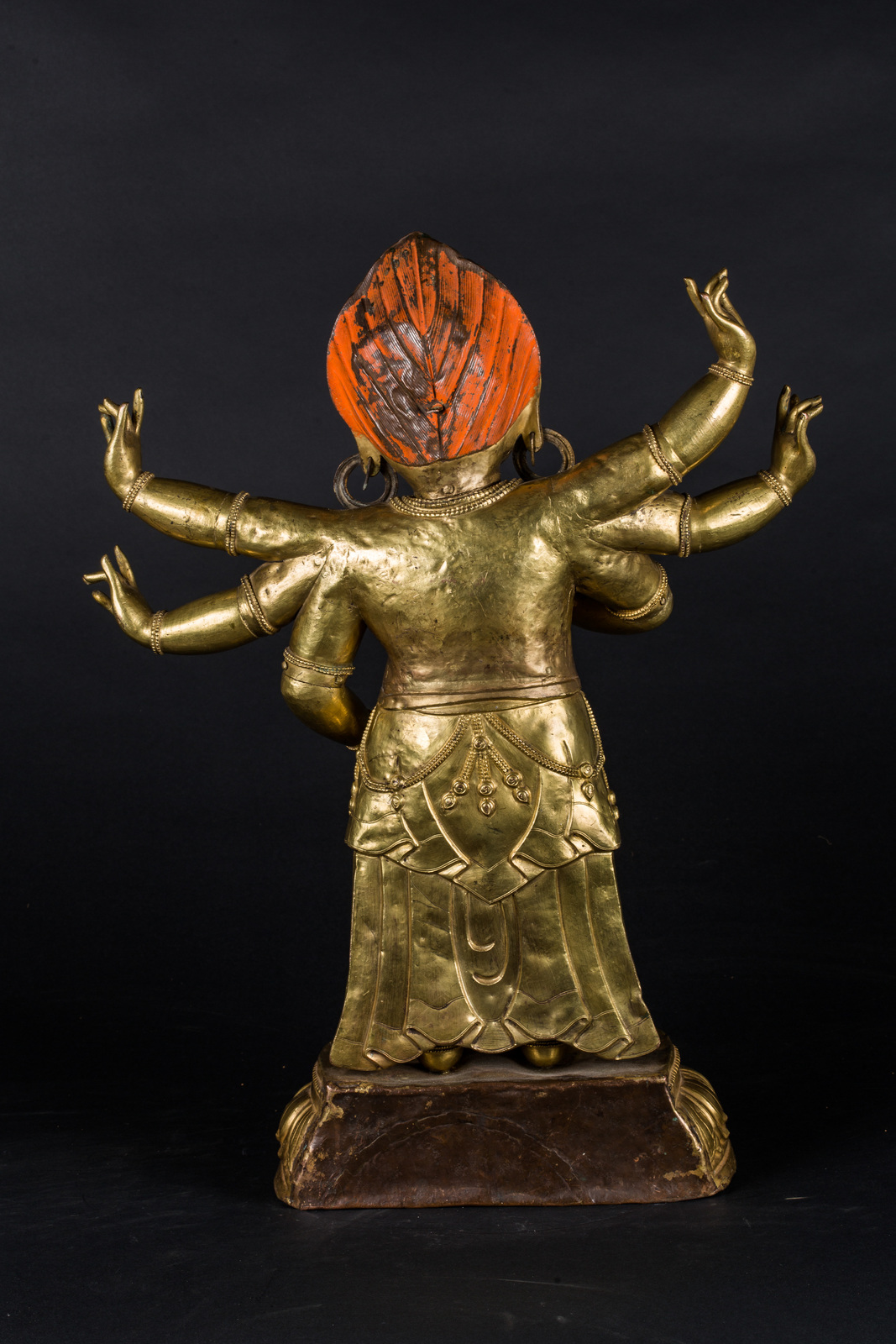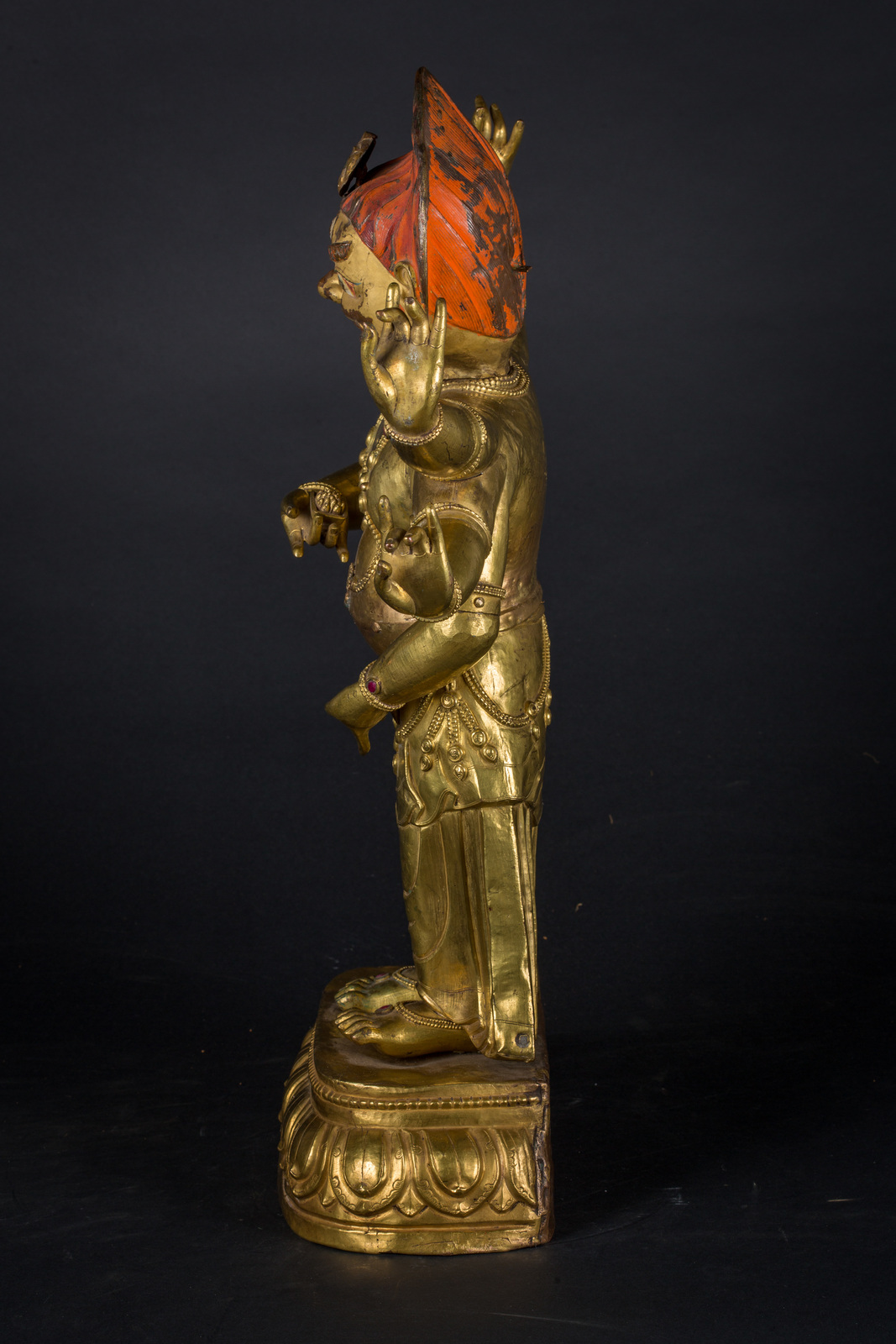 Nepal, 18th century . . Cm 30,00 x 63,00 x 45,00. Big repoussé sculpture depicting an irate White Mahakala in the six armed manifestation (Shadbhuja), standing in the samapafa position on a single lotus flower base. The figure is covered by a jeweled dothi, and each of the six hands originally held an attribute: a kapala in the main two, and a jewel (mani), a kartica, a dhvaja banner, a parasu axe and a khatvanga club in the others. Only the jewel is still in position.