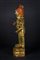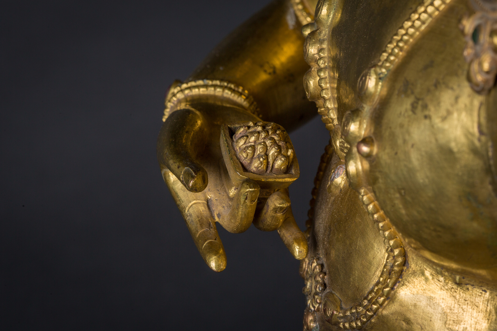 Some coeval stones, among which emeralds and rubies, are present on the feet, the wrists and the earrings. The face, irate, is covered with original pigments and shows traces of a beard, a big third eye, flames coming out from the mouth and flaming hair with a central emerald root diadem. The ankles, wrists and the jewels present colored glass and precious stones, among which ruby root and corals, likely coeval. Hands and feet are cast.