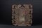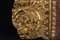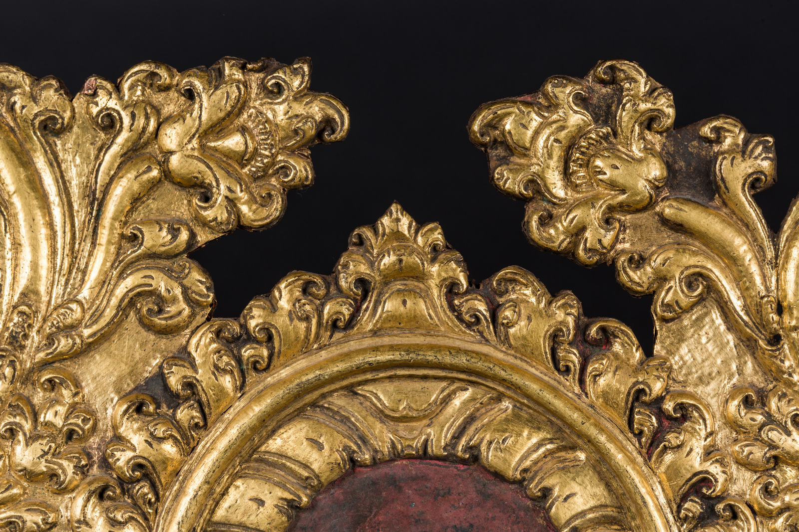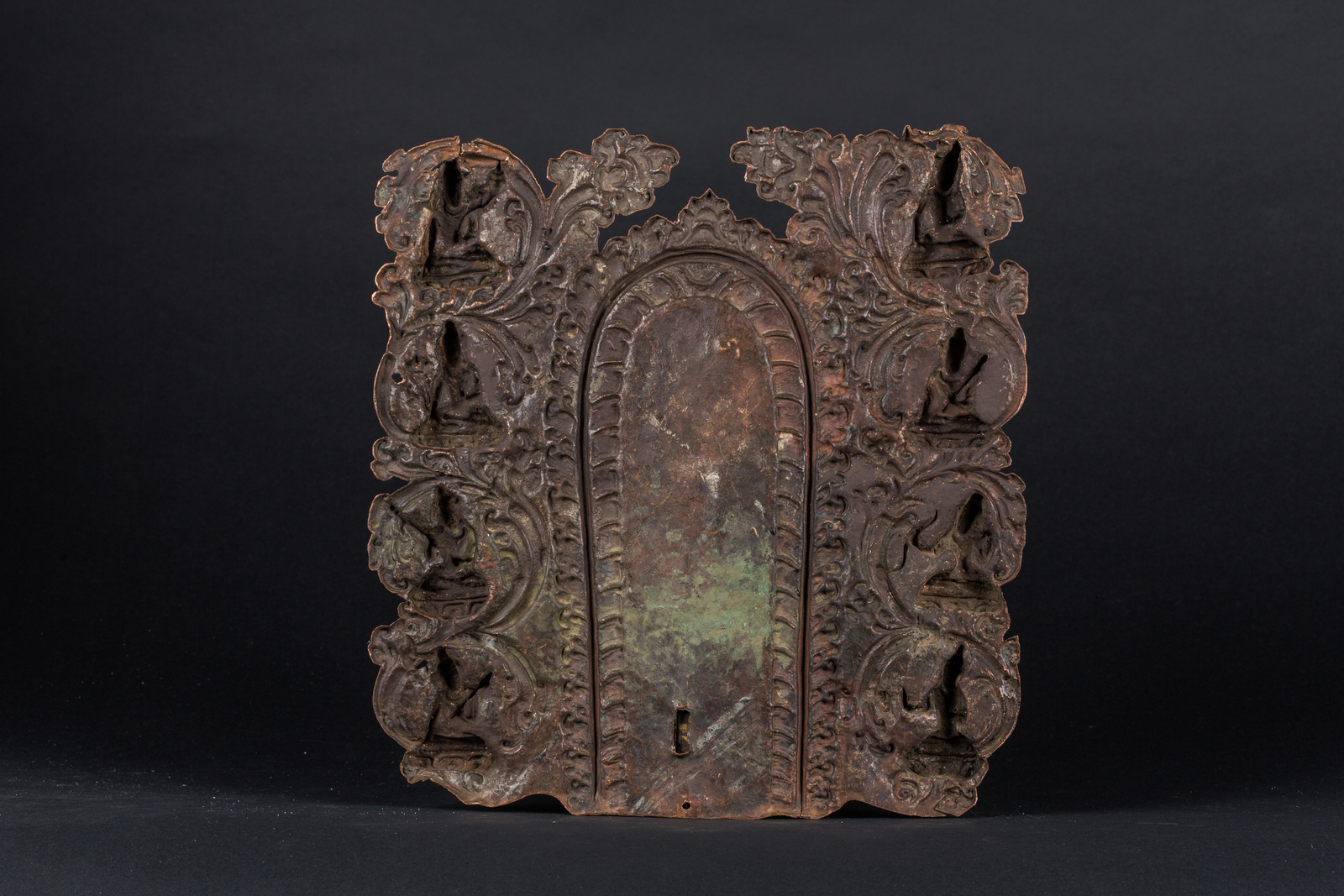 Tibet, 13th-14th century . . Cm 34,00 x 35,00. Big embossed gilded copper prabha, adorned with vegetal motifs and portraying eight characters grouped in round phytomorphic spirals. In the center is an oblong niche painted with red pigment, designed to hold the owner of the prabha. The eight characters portrayed might conceivably be the eight Dikpala, guardians of the cardinal points: Kubera, Yama, Indra, Varuna, Isana, Agni, Vayu, Nirriti. If this interpretation is correct, the main character was in all likelihood the bodhisattva Vjrapani in his standing manifestation. Noteworthy is the style of the work, which makes its possible origin the temple of Densatil. In the niche is also visible a carved syllable.