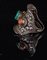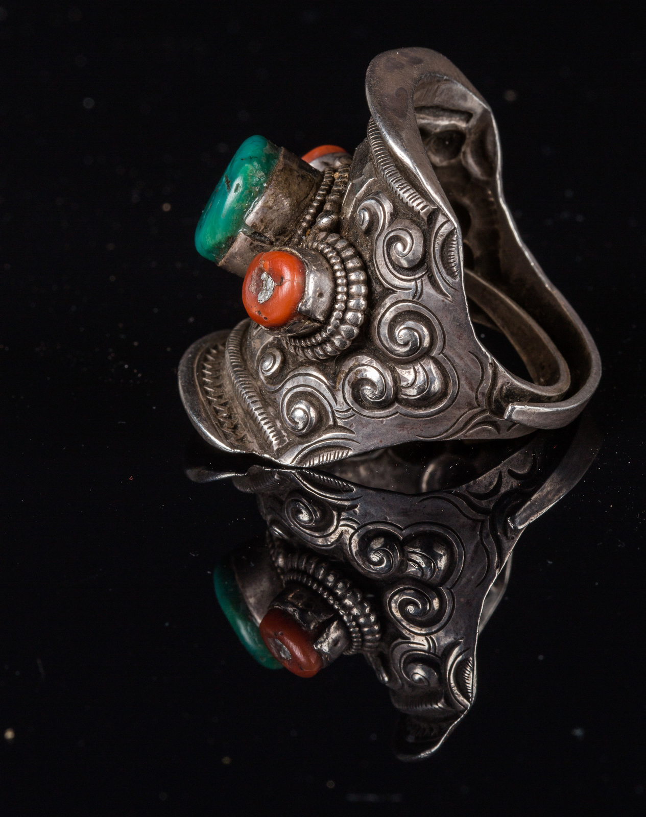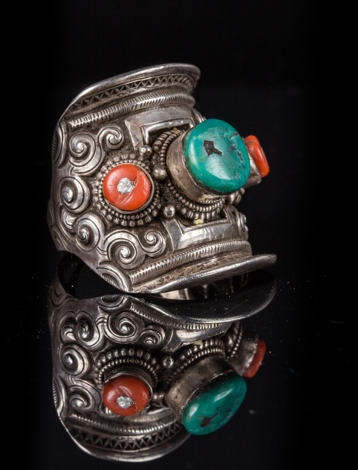 Tibet, XIX secolo . -. Cm 3,00 x 4,00. Grande anello a sella per acconciature finemente sbalzato a volute e arricchito da due grandi coralli ed una turchese.