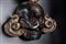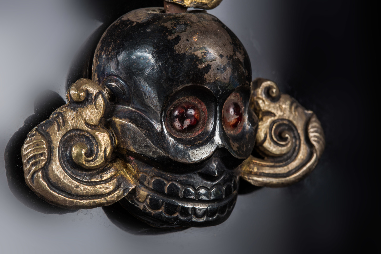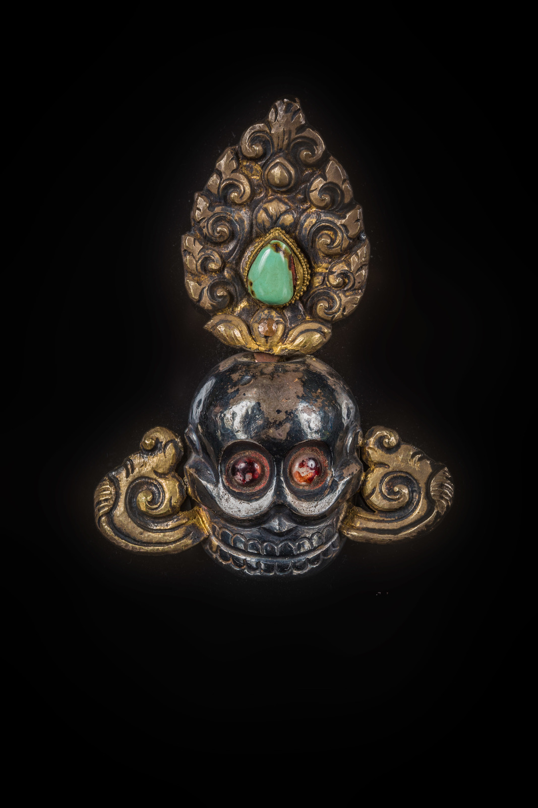 Tibet, XVIII-XIX secolo . -. Cm 7,50 x 9,50. Elemento realizzato in argento e bronzo raffigurante teschio del personaggio chitipati. In mezzo alla fronte è possibile notare una turchese, nelle orbite due vetri colorati di rosso. L'oggetto, in origine, faceva probabilmente parte di uno scettro o di un copricapo rituale.