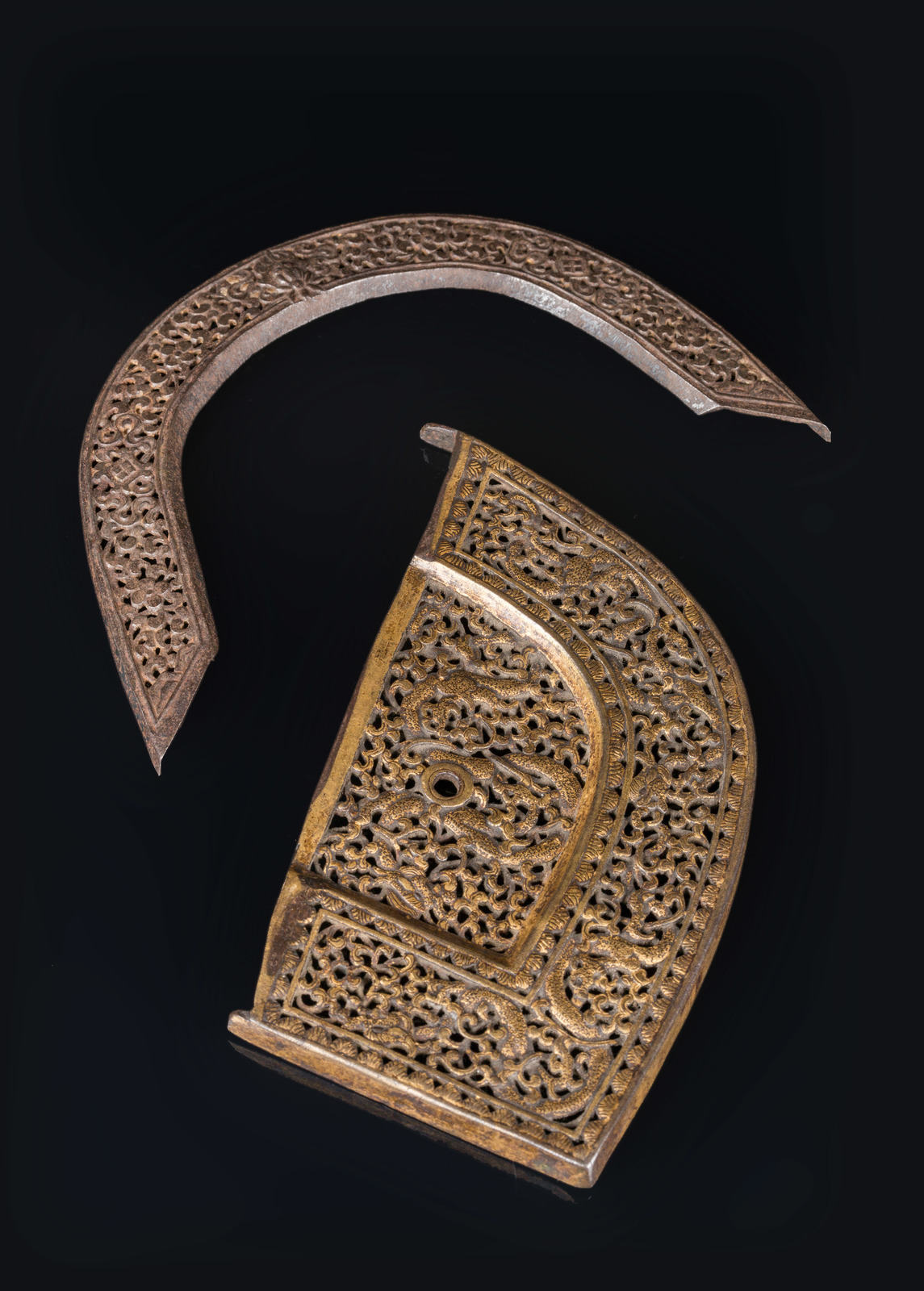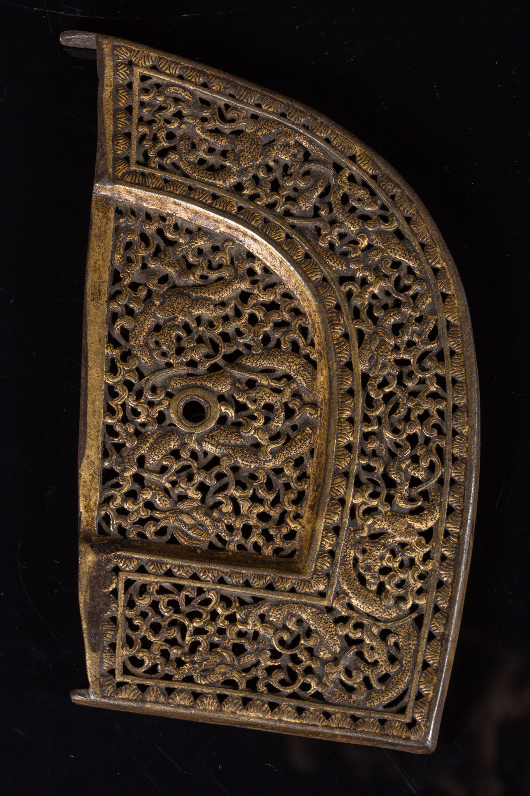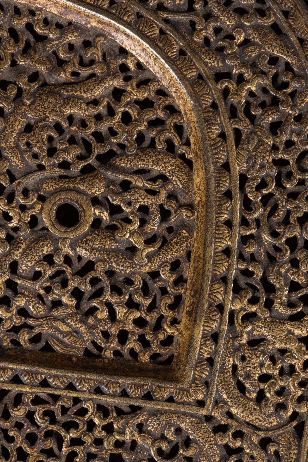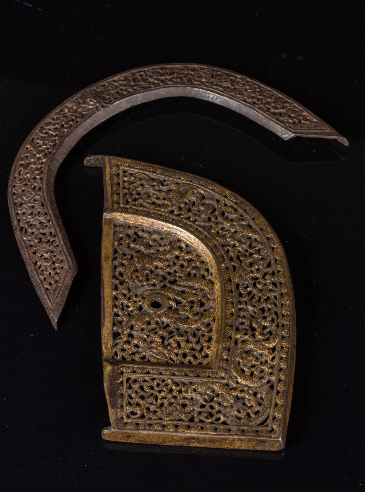 Tibet, XVIII - XIX secolo . . Cm 16,00. Uno è un frammento di prabha in bronzo dorato e lavorato a traforo con decori fitomorfi e draghi (h.14 cm); l'altro è un pezzo di sella in bronzo traforato con motivo vegetale, losanghe e cintamani.