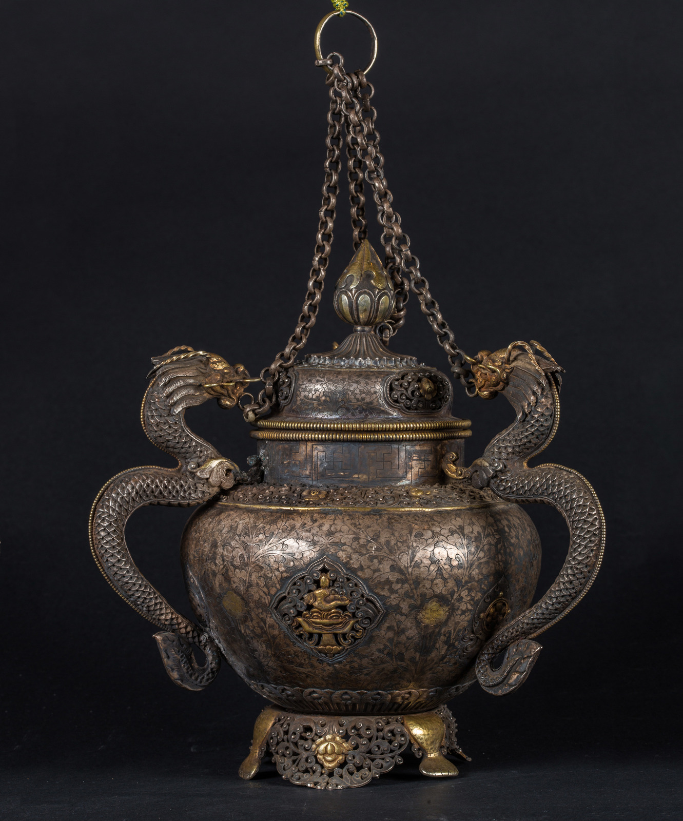 Tibet, metà XIX secolo . -. Cm 20,00 x 30,00 x 30,00. Incensiere da soffitto in argento 950, decorato a motivi fitomorfi e corredato di tre bracci in forma di drago. Sono presenti riserve traforate sul corpo e sul tappo.