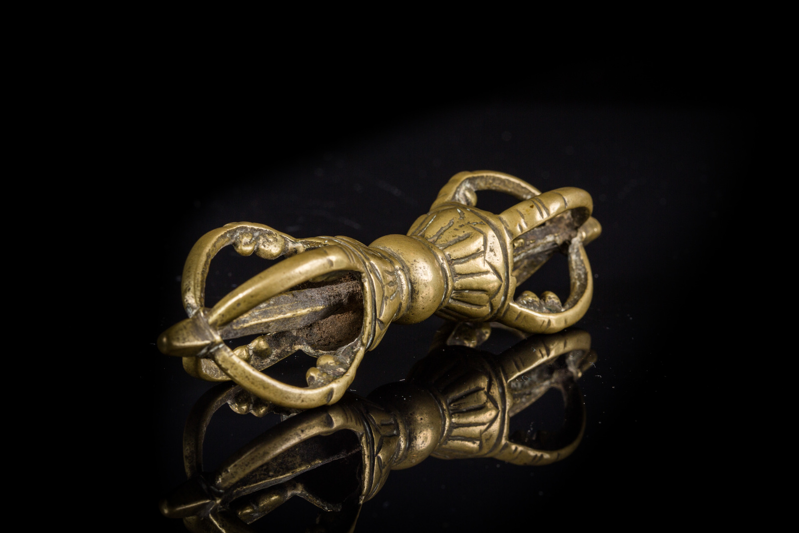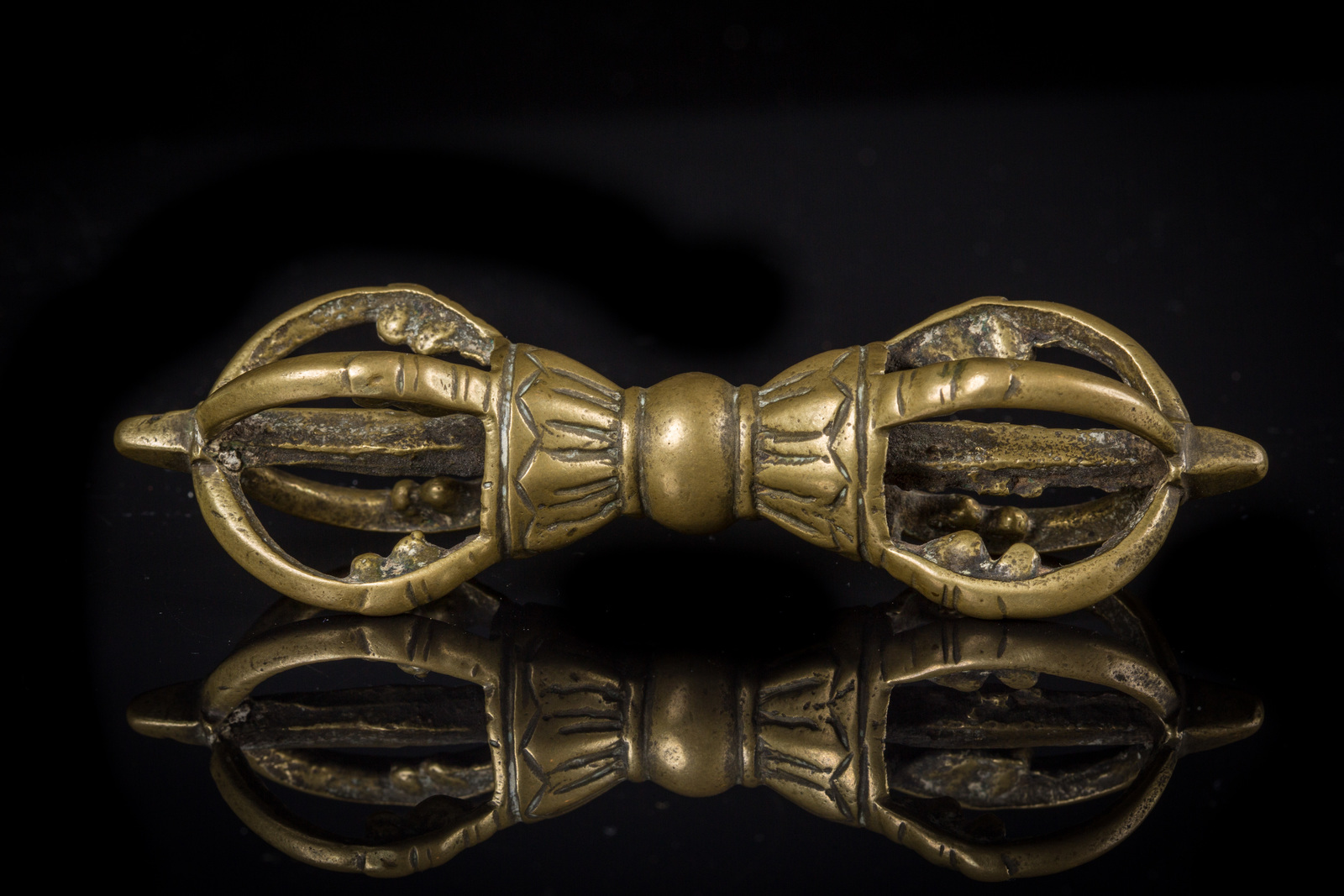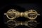 Arte Himalayana Vajra in ottone Tibet, XIX secolo . -. Cm 11,50. Strumento liturgico con corpo decorato a fiore di loto e le due estremità caratterizzate da quattro braccia ciascuna.