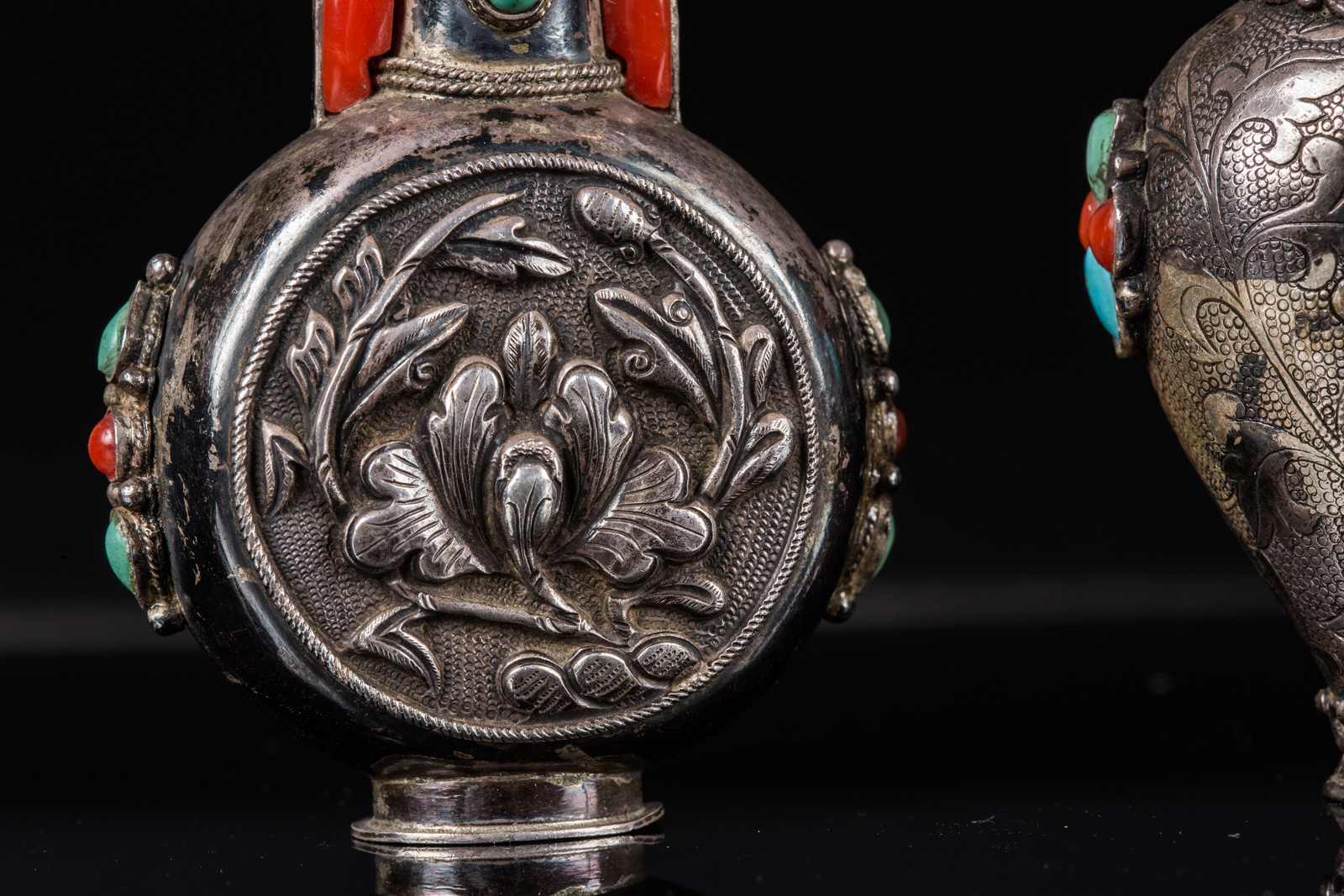 Arte Cinese Lotto di tre tabacchiere mongole in argento incrostato con turchesi e coralli