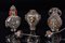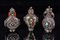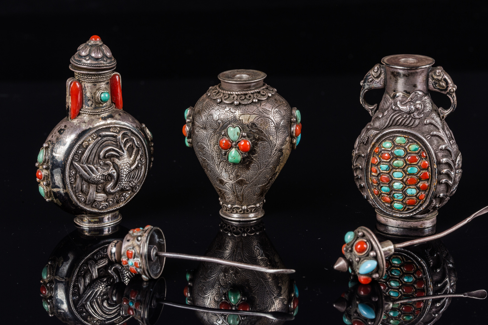 Arte Cinese Lot of three silver snuff bottles encrusted with coral and turquoise