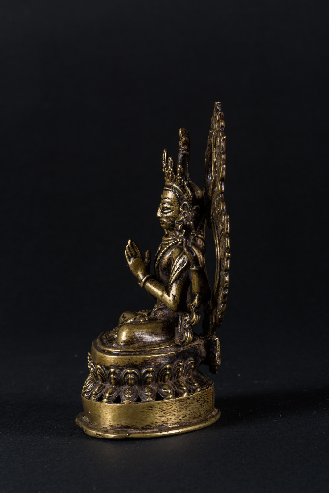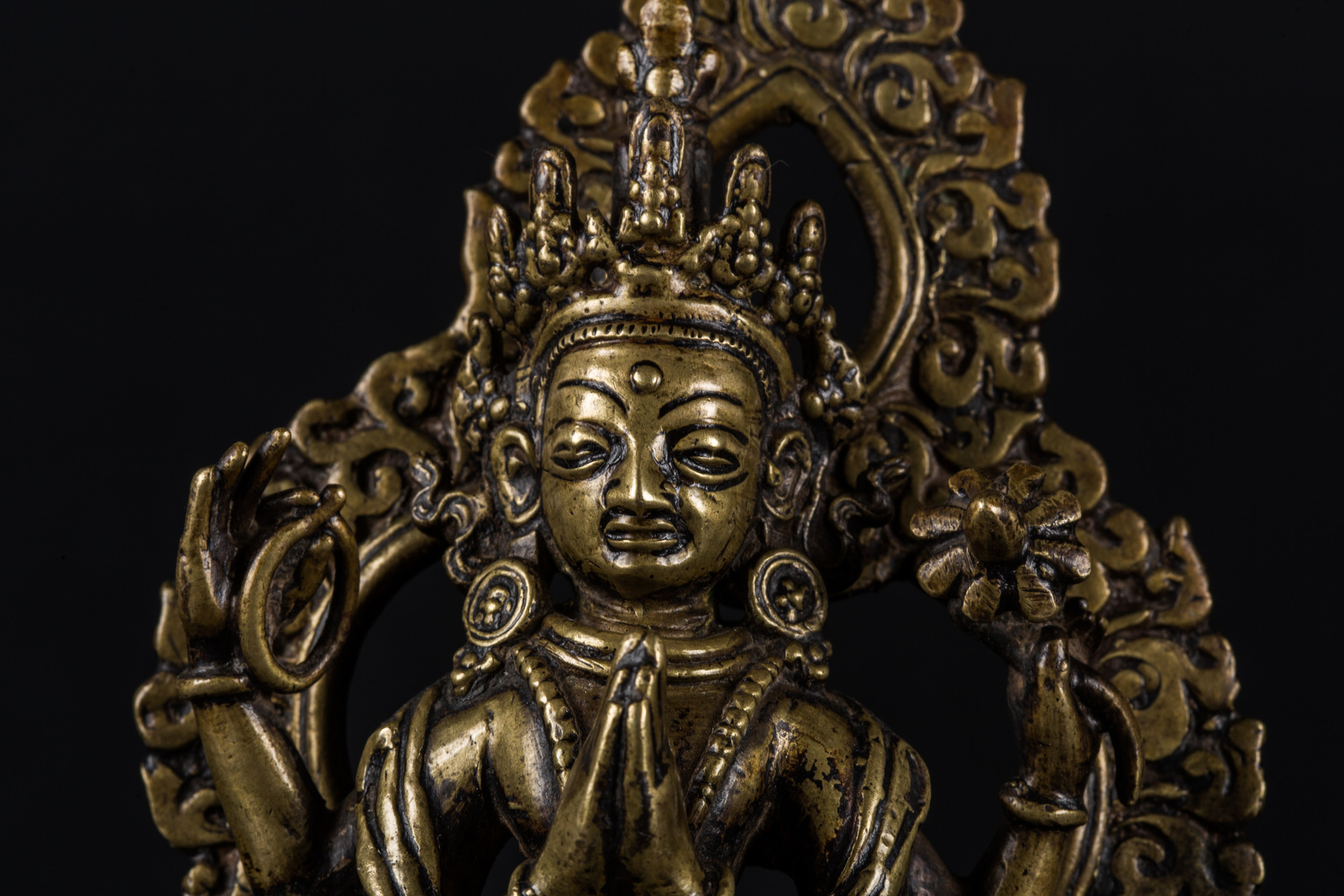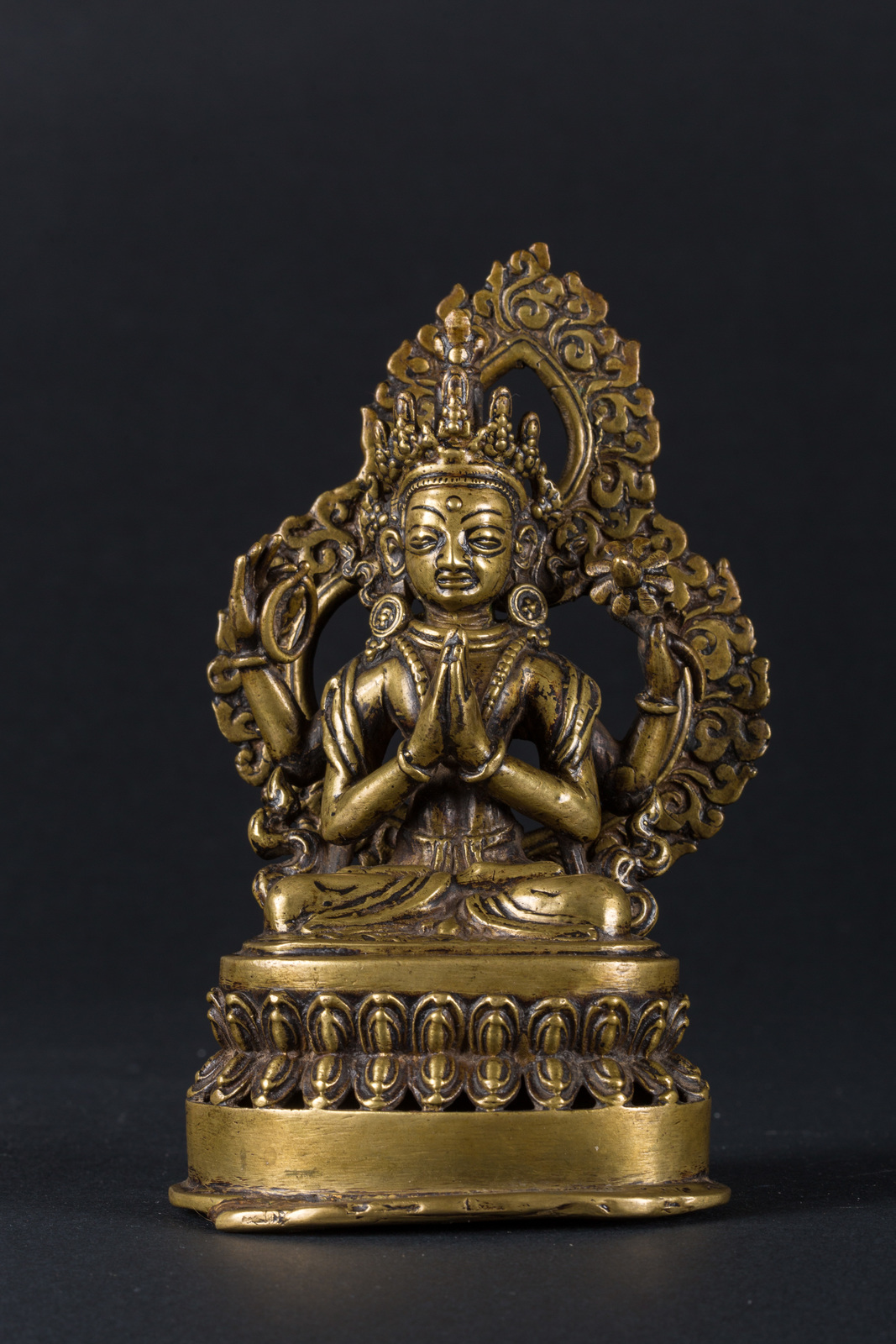 Nepal, XVIII secolo. -. Cm 9,00 x 16,50. Fusione raffigurante il bodhisattva trascendente che in questa manifestazione prende il nome di Sadaksai-Lokesvara o Chenrezig, seduto in posizione padmasana su un'alta base a doppio fiore di loto, mostra gioielli e corona a cinque punte che lo identificano come appartenente al suo ordine. In questa forma ha quattro braccia: due frontali giunte in manidharamudra, atte a contenere il gioiello cintamani, e due secondarie che stringono il fiore di loto ed il rosario. Aureola mobile retrostante.