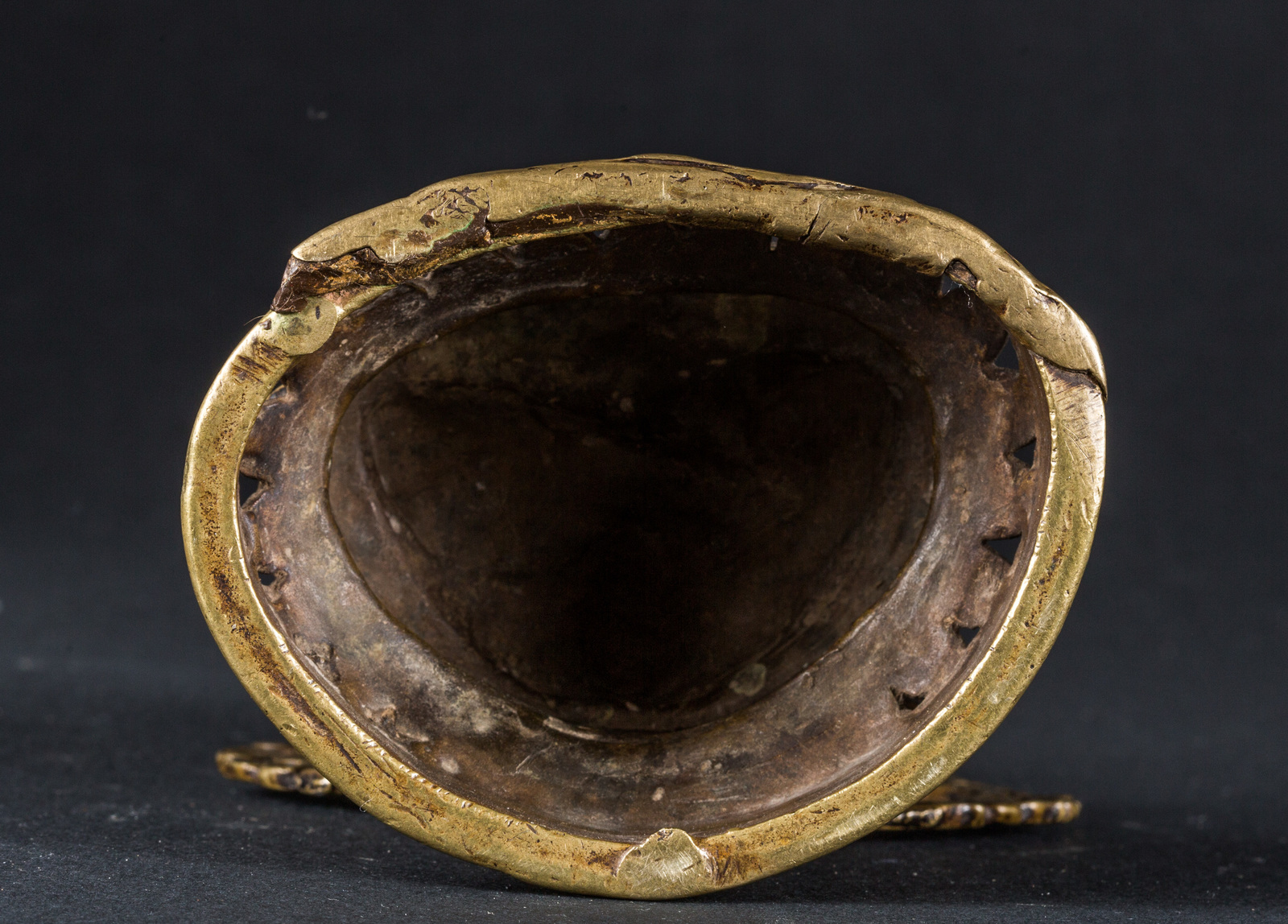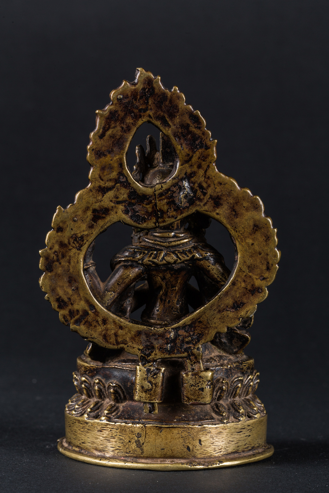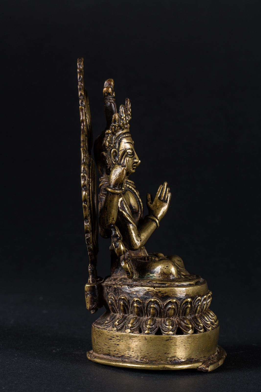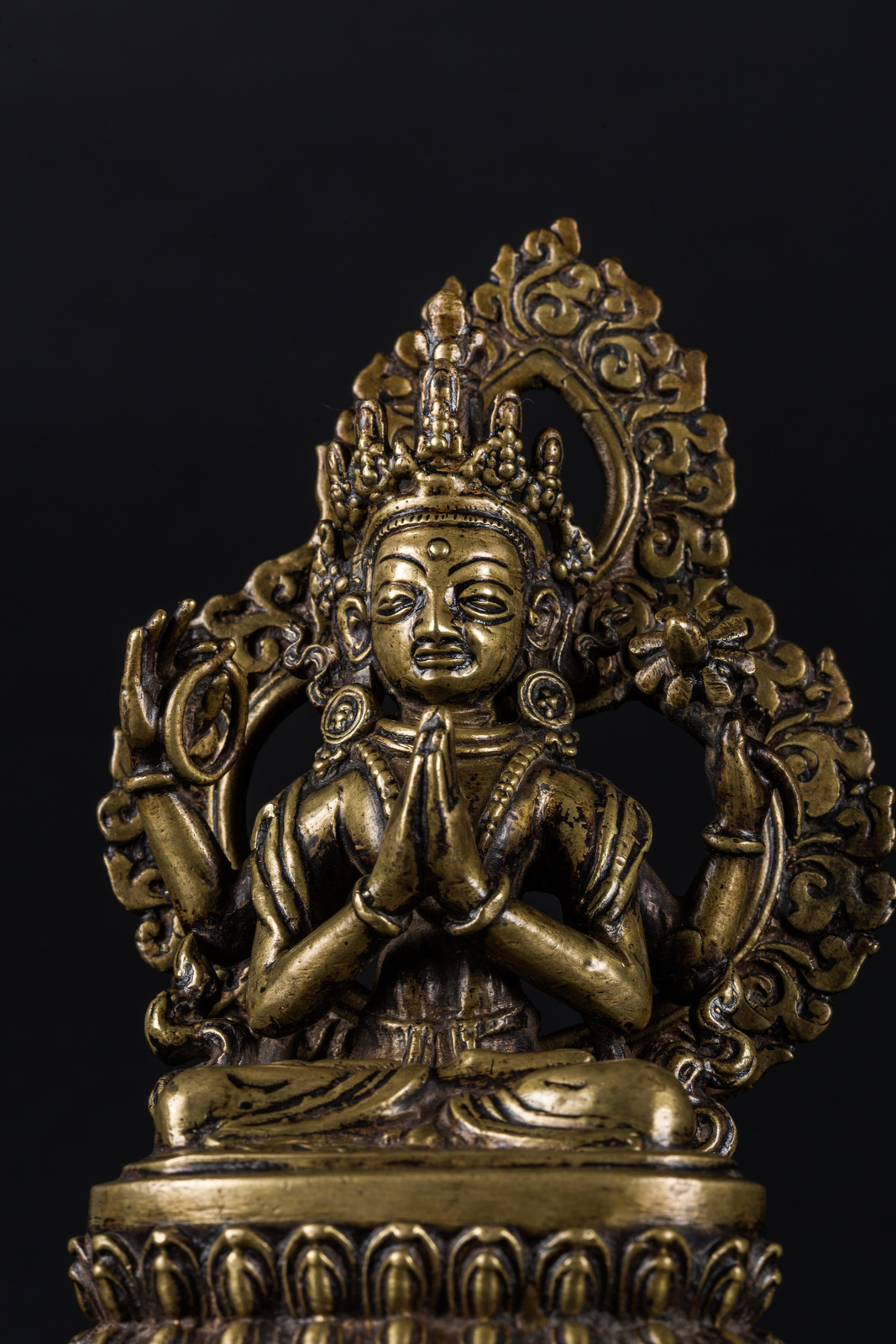 Nepal, XVIII secolo. -. Cm 9,00 x 16,50. Fusione raffigurante il bodhisattva trascendente che in questa manifestazione prende il nome di Sadaksai-Lokesvara o Chenrezig, seduto in posizione padmasana su un'alta base a doppio fiore di loto, mostra gioielli e corona a cinque punte che lo identificano come appartenente al suo ordine. In questa forma ha quattro braccia: due frontali giunte in manidharamudra, atte a contenere il gioiello cintamani, e due secondarie che stringono il fiore di loto ed il rosario. Aureola mobile retrostante.