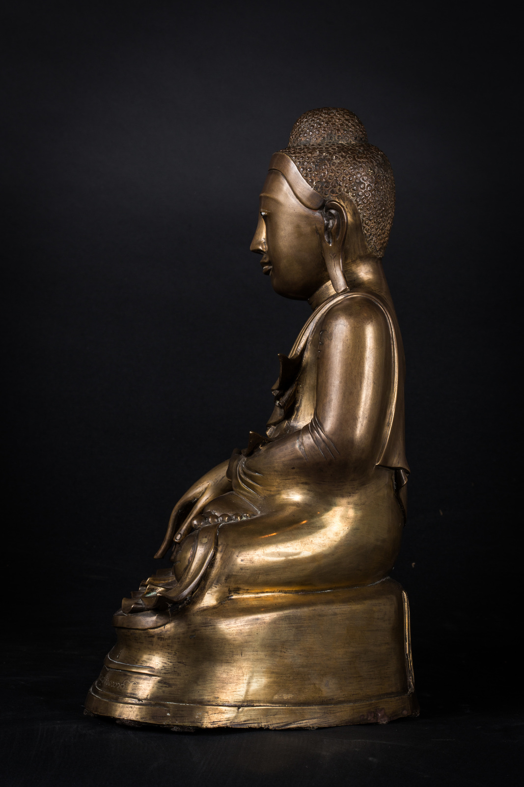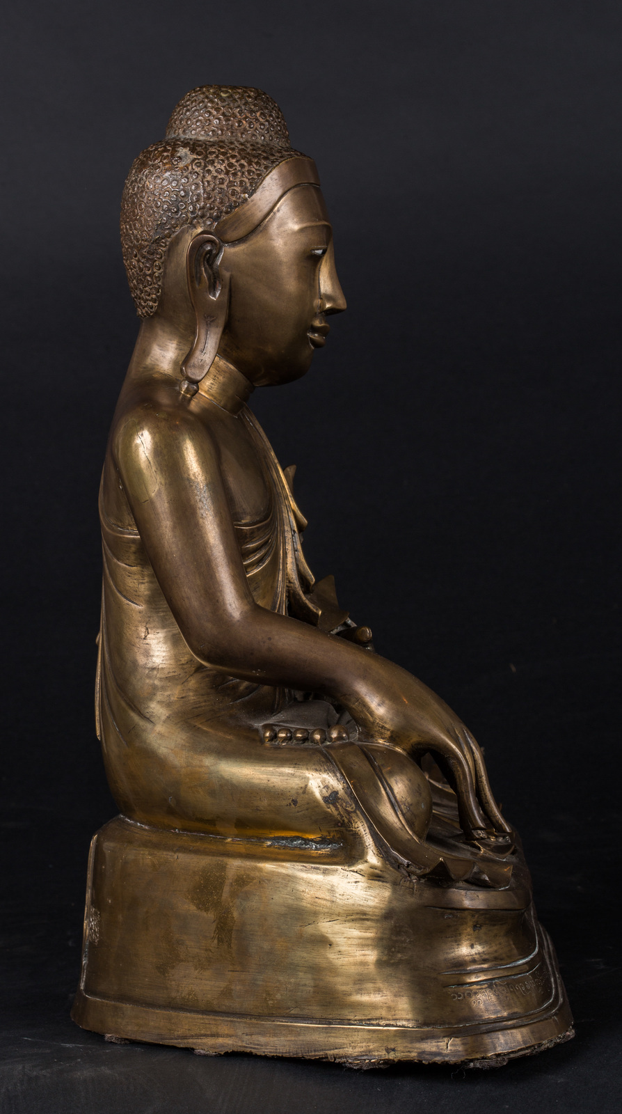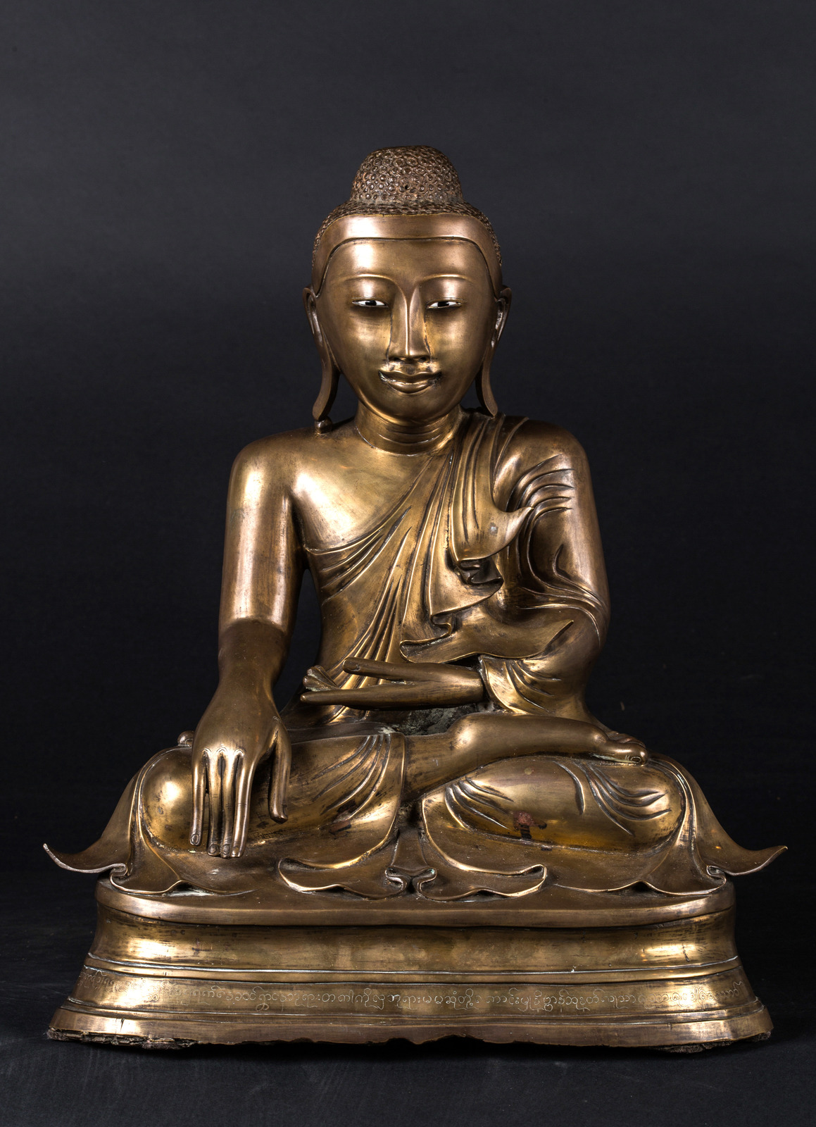 Arte Sud-Est Asiatico Scultura in bronzo raffigurante Buddha Birmania, XIX secolo . -. Cm 35,00 x 44,00. Fusione in bronzo raffigurante il Buddha storico seduto in padmasana su una base, la mano destra in bhumisparsamudra e la sinistra in avakasamudra. Occhi in pasta di vetro. Il fronte della base riporta un'iscrizione, probabilmente posteriore alla fattura della statua, forse un ex-voto di chi ha donato l'opera ad un tempio.