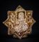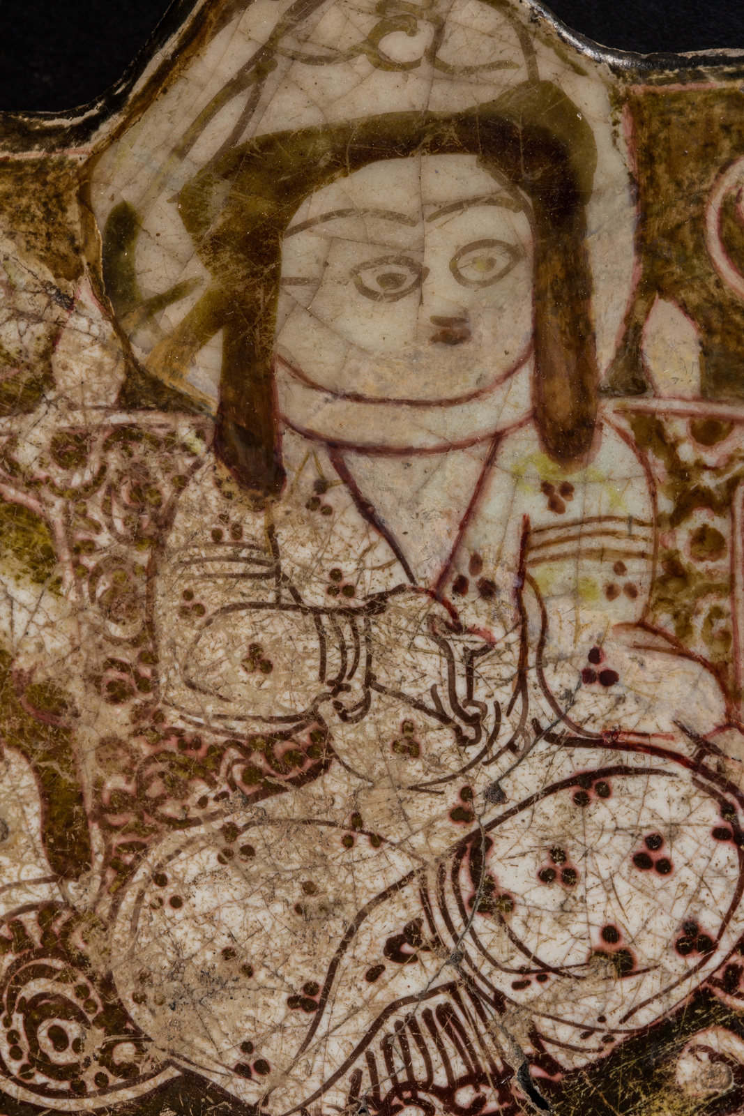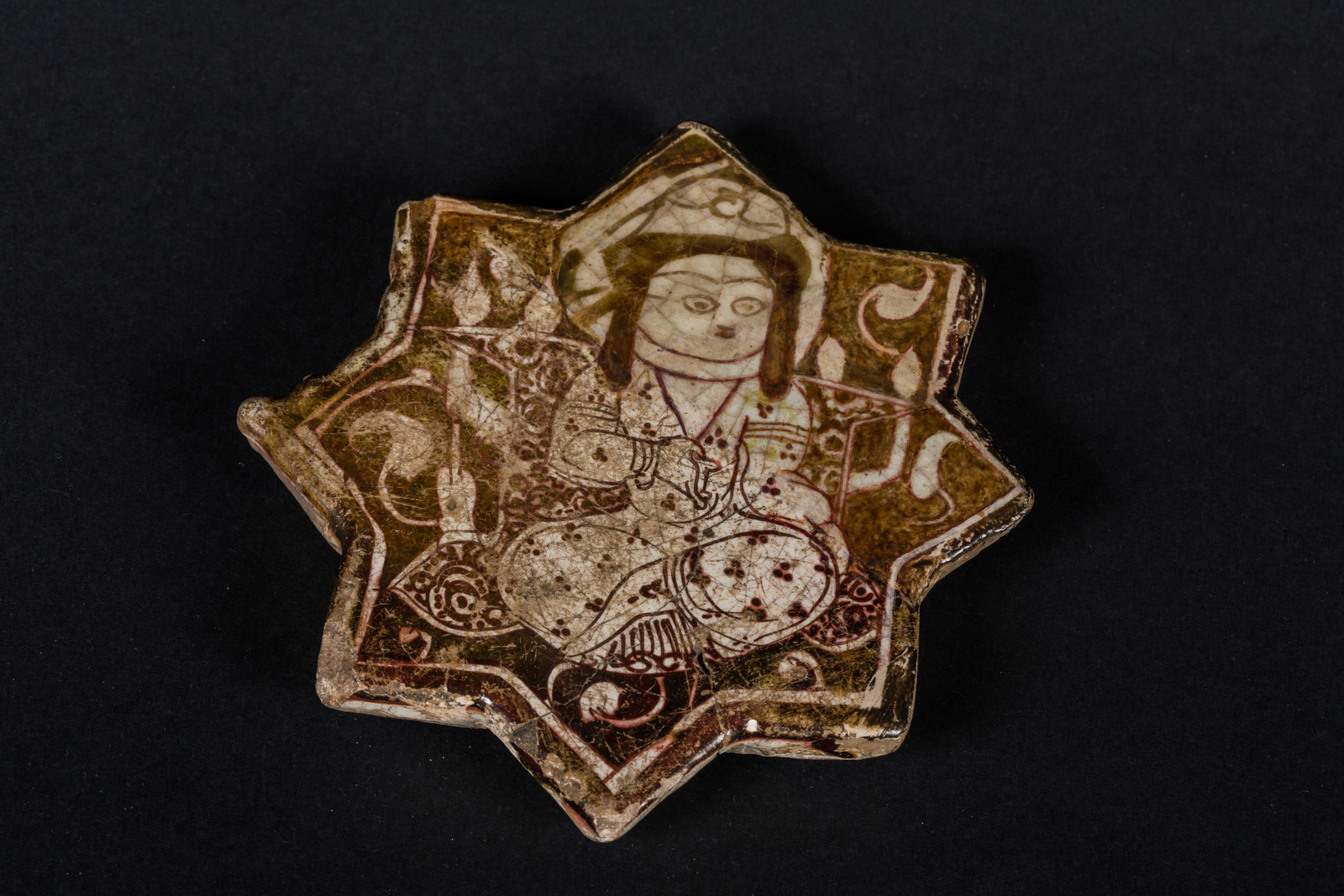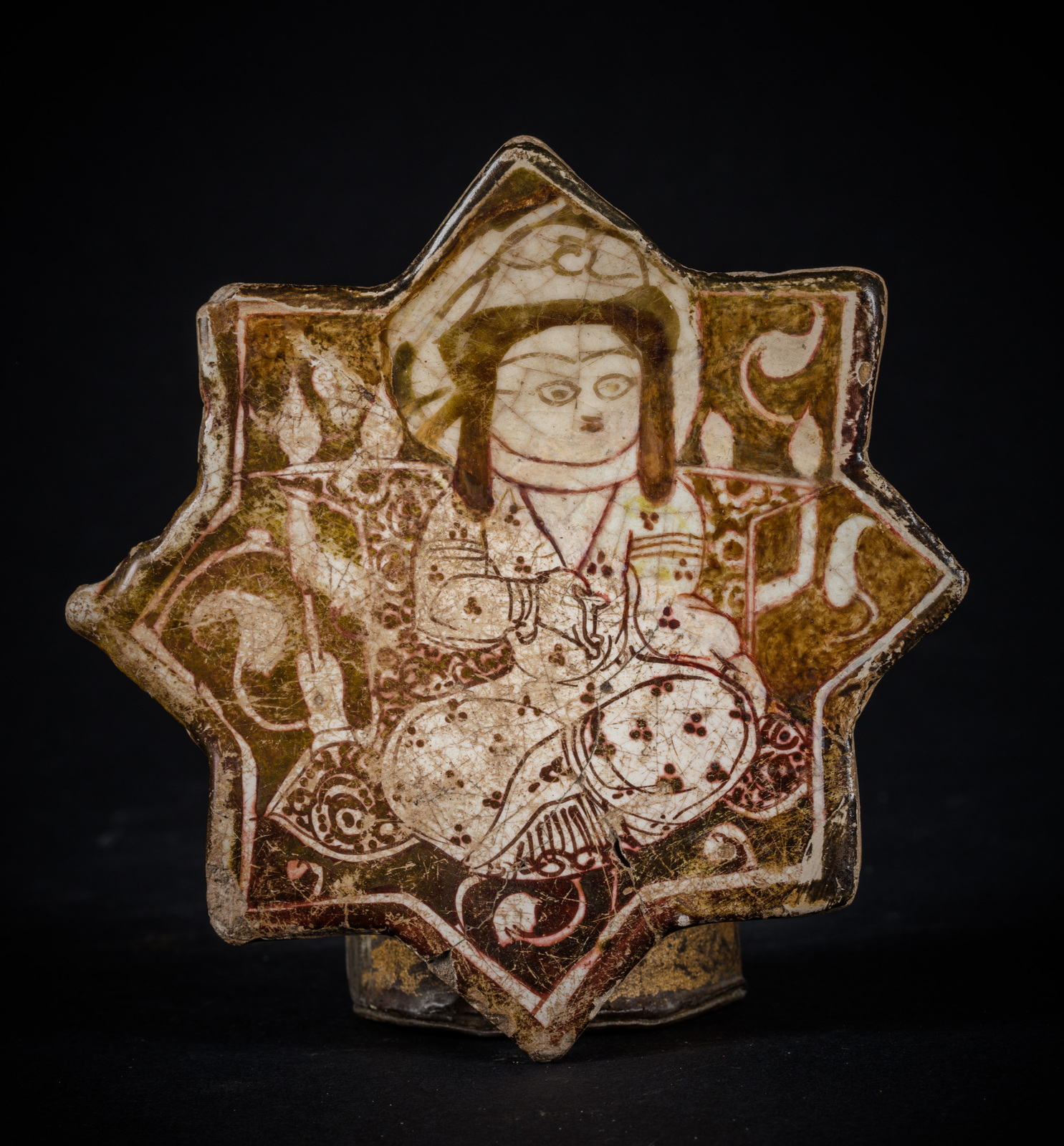 ARTE ISLAMICA A Kashan lustreware star shaped tile Iran, Kashan, 12th - early 13th century . . Cm 14,00 x 14,00. Fritware tile, in the shape of an eight-pointed star, decorated with a seated figure amid floral scroll-work in white on a brown lustre ground. Restored.