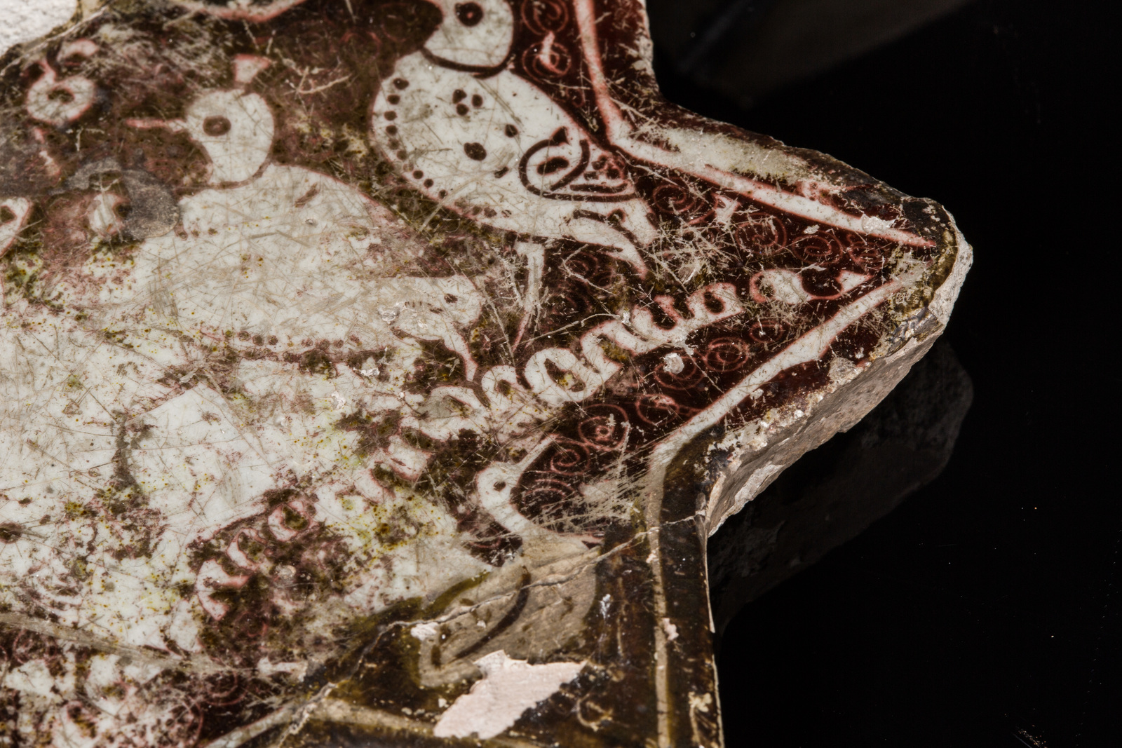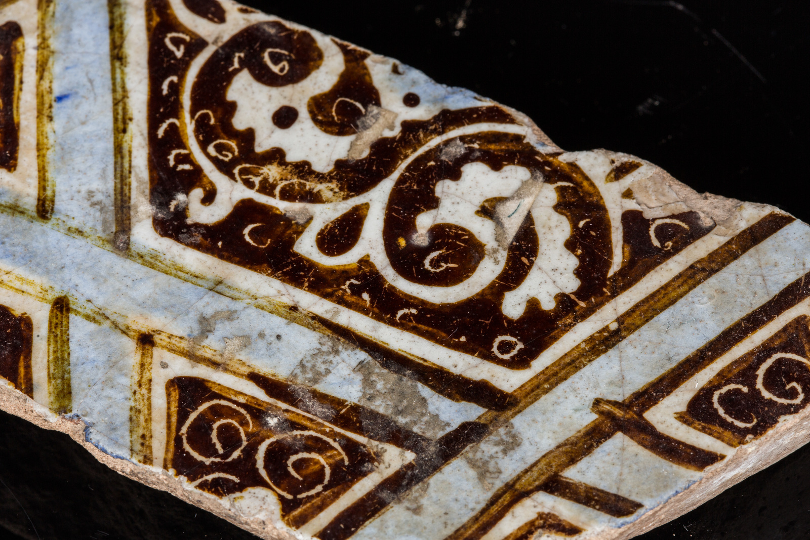Iran, XII- XIV secolo . -. Cm 12,00. L'una intera, seppur restaurata, raffigurante degli uccelli in riserva su lustro nel tipico stile Kashan (h. 10,5 cm), la seconda mezza mattonella con tre punte con bordi turchesi ed interno monocromo color crema (11 X 8,5 cm); la terza è un frammento di un fregio più grande caratterizzato da elementi vegetali e spiraliformi in riserva su lustro bruno (12,5 X 6 cm).