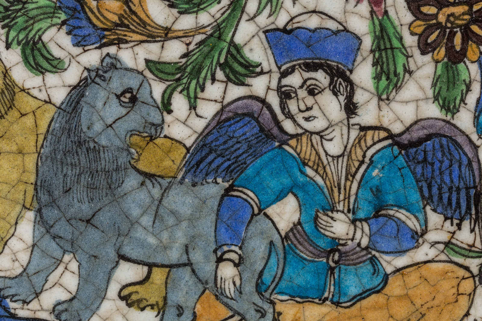 Iran, epoca Qajar, XIX secolo . -. Cm 39,50. Raffigurante figura alata e due leoni su sfondo floreale.