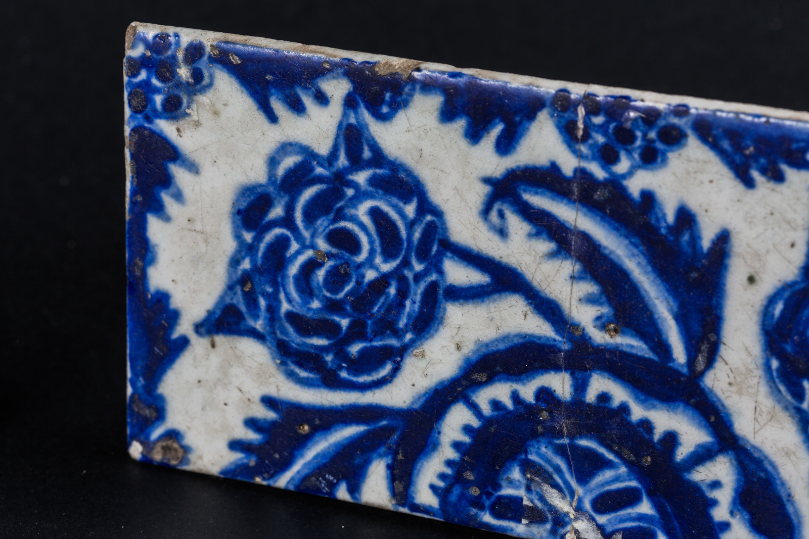 Turchia, Kutahya, XVI secolo . -. Cm 22,00 x 10,00. Mattonelle rettangolari da bordo dipinte in blu cobalto sotto invetriatura trasparente con motivi floreali entro sottili bande a chevron.