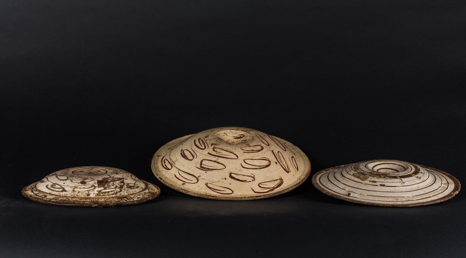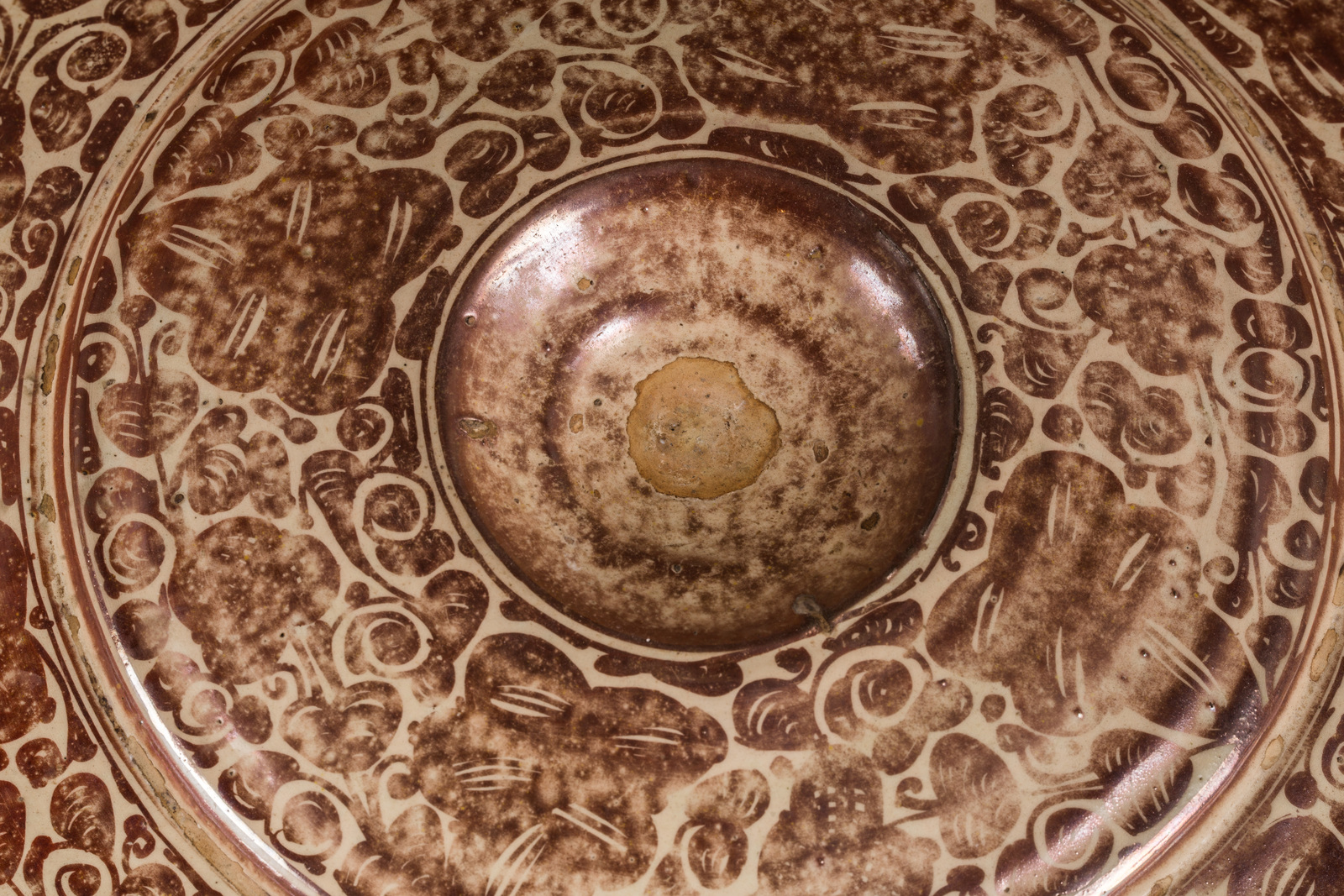Spagna, probabilmente Manises, XVII - XVIII secolo . -. Cm 38,00. Lotto composto da una conca umbonata dipinta a lustro bruno (diam. 38 cm); un piatto umbonato dipinto a lustro color oliva (diam. 34 cm); un piatto con decorazione a squame di pesce su fondo bianco (diam. 31 cm).