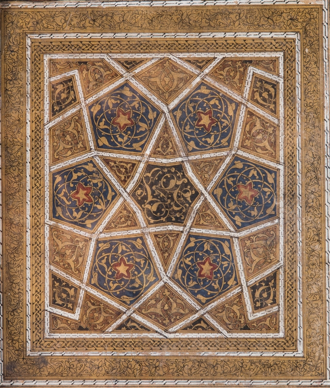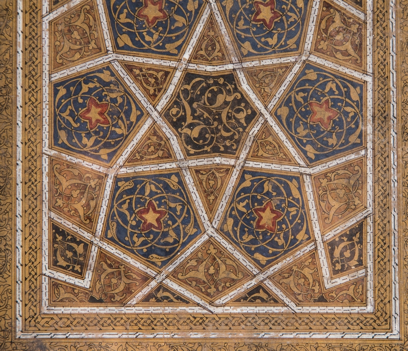 Egitto o Levante, XIV secolo . -. Cm 20,00 x 23,00. Pagina decorata con cinque cornici concentriche di ampiezza variabile: tre su fondo bianco con semplici motivi geometrici; la più ampia su fondo dorato dipinta con motivi floreali concatenati ed una seconda su fondo dorato decorata con una variante del motivo del nodo infinito. La decorazione principale prevede l'intersezione di figure geometriche tra cui pentagoni, triangoli e rombi, colorate con diversi colori, tra cui spiccano il blu cobalto e l'ocra, ed ornate con mezze palmette dorate arrangiate suggerendo un movimento rotatorio. La composizione che si viene a creare si sviluppa intorno alla stella a sei punte centrale di cui viene suggerita la propagazione e continuazione anche se, di fatto, i margini tagliano alcune figure. Questo espediente è comune nell'arte Islamica e necessario per rendere visivamente una delle virtù esclusive di Dio, ovvero l'infinito.