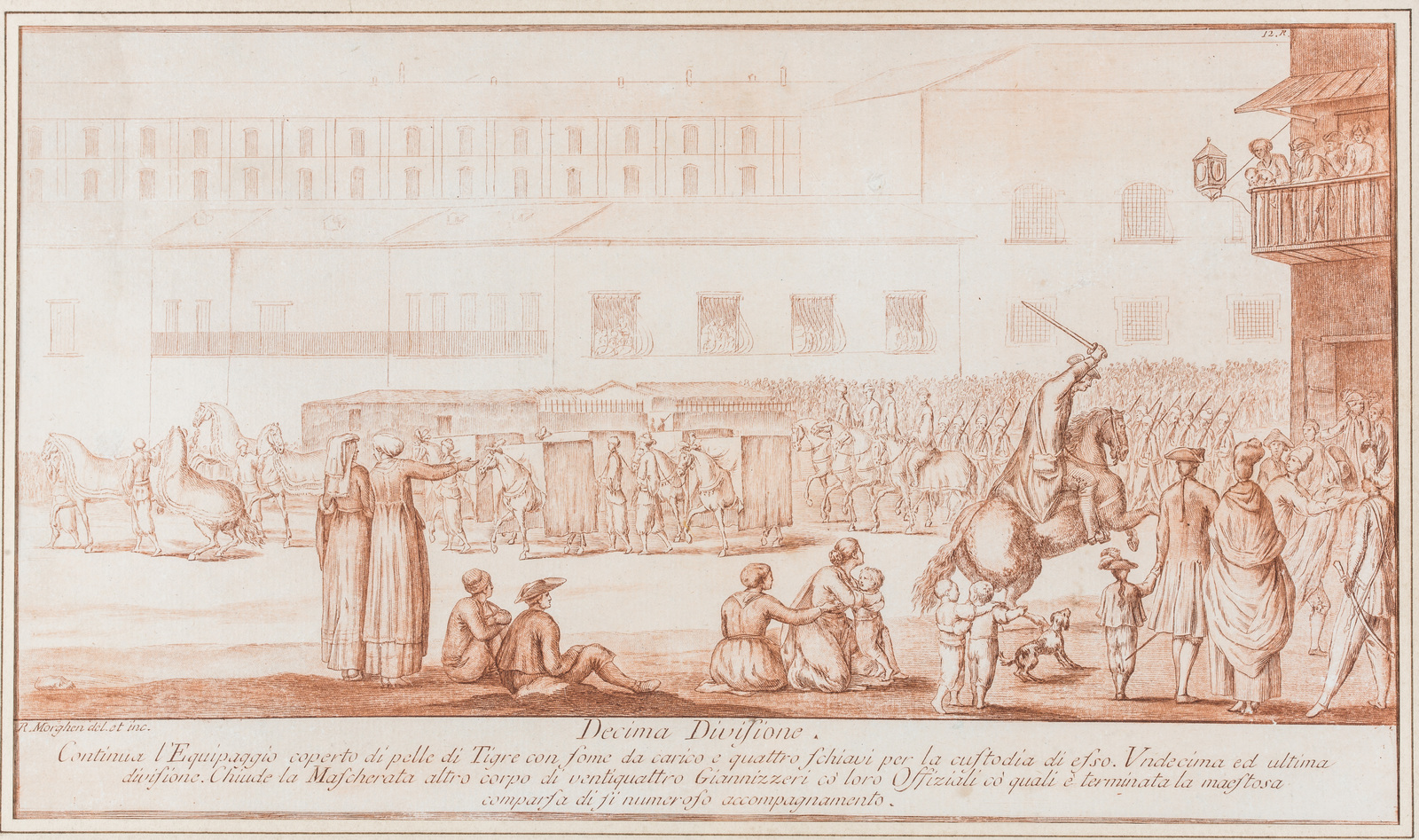 Decima divisione: Continua l'equipaggio coperto di pelle di tigre con some da carico e quattro schiavi per la custodia di esso. Undecima ed ultima divisione chiude la mascherata altro corpo di ventiquattro giannizzeri co loro ufficiali con i quali è terminata la maestosa comparsa di si numeroso accompagnamento.