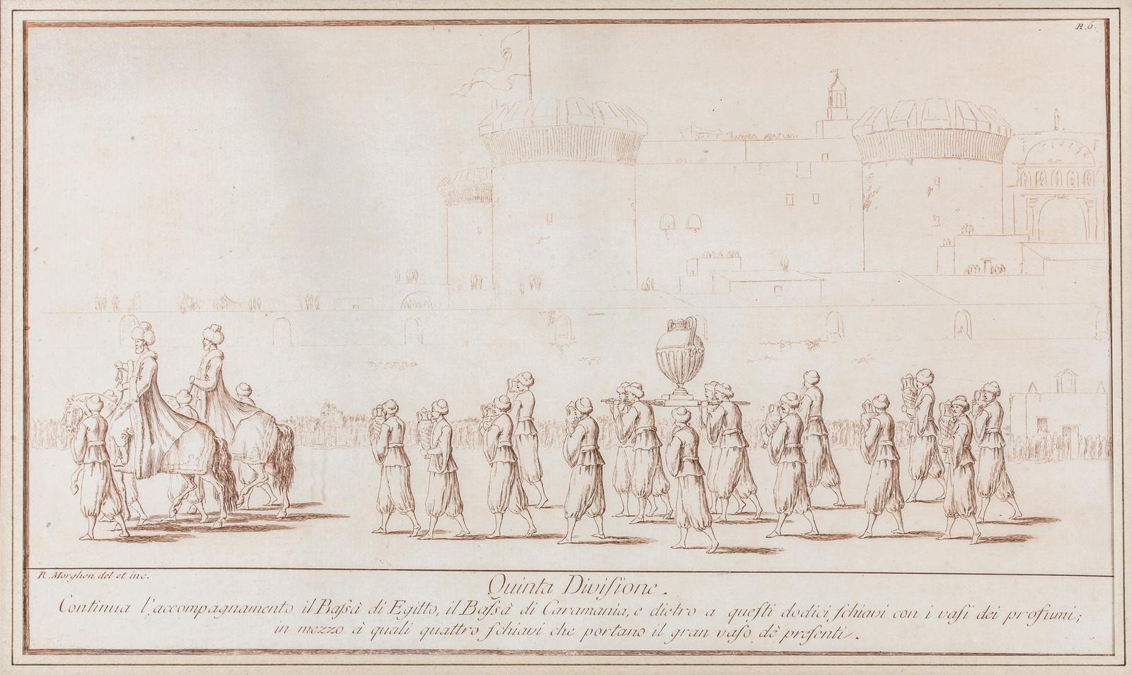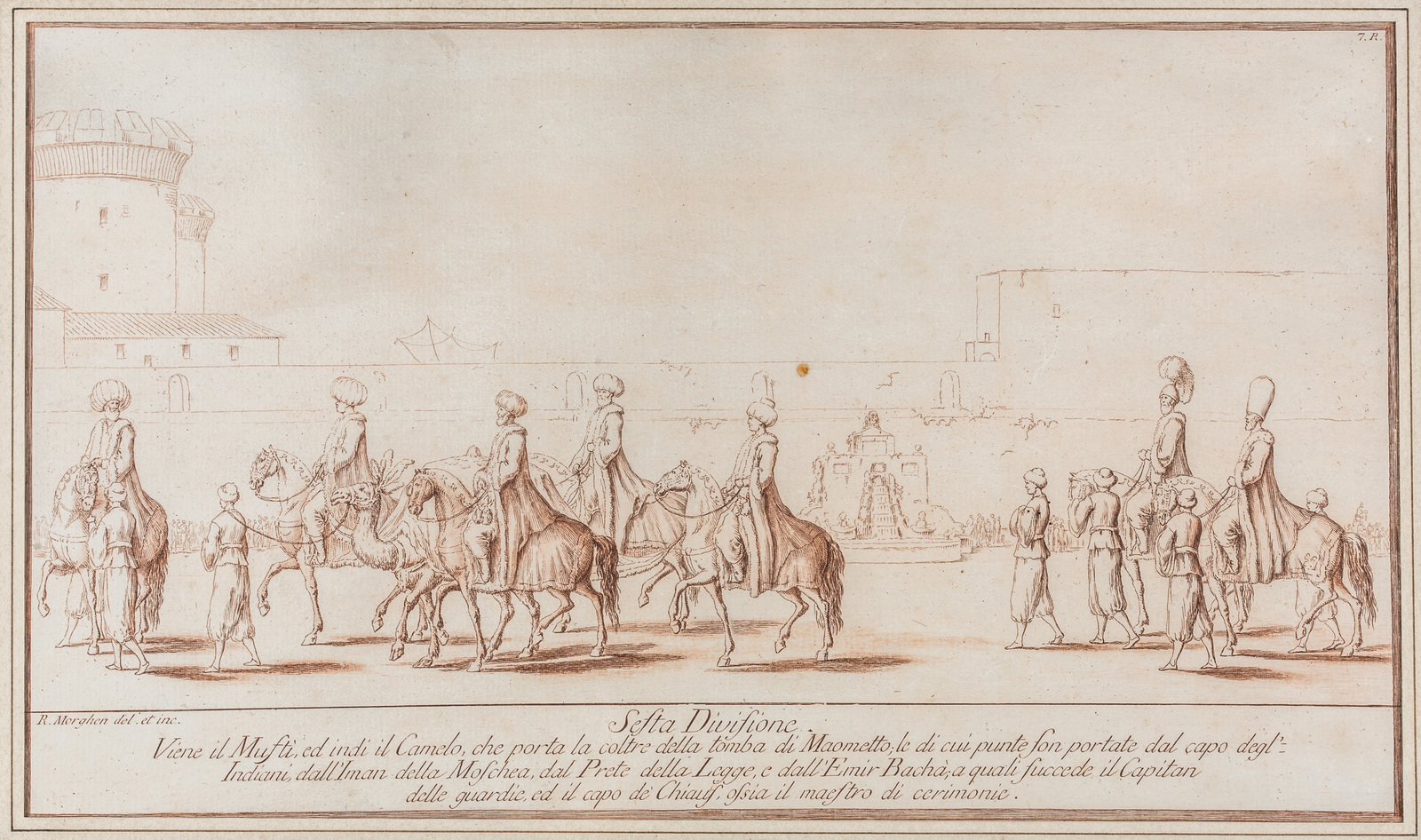 Sesta divisione: viene il Mufti ed indi il Camelo che porta la coltre della tomba di Maometto le di cui punte son portate dal capo degl'indiani dall'Imam della moschea, dal prete della legge e dall'Emir Bacha ai quali succede il capitano delle guardie ed il maestro delle cerimonie;