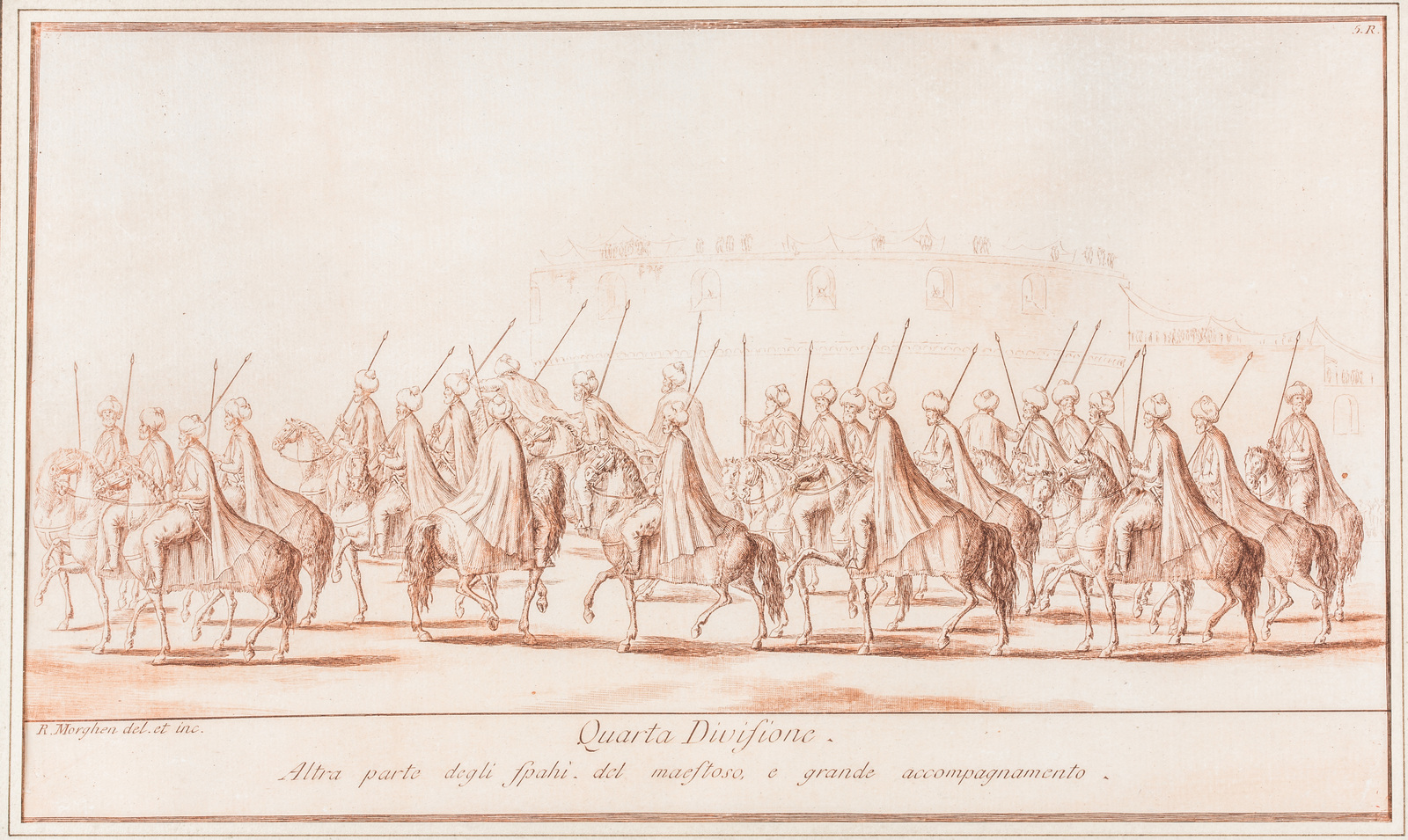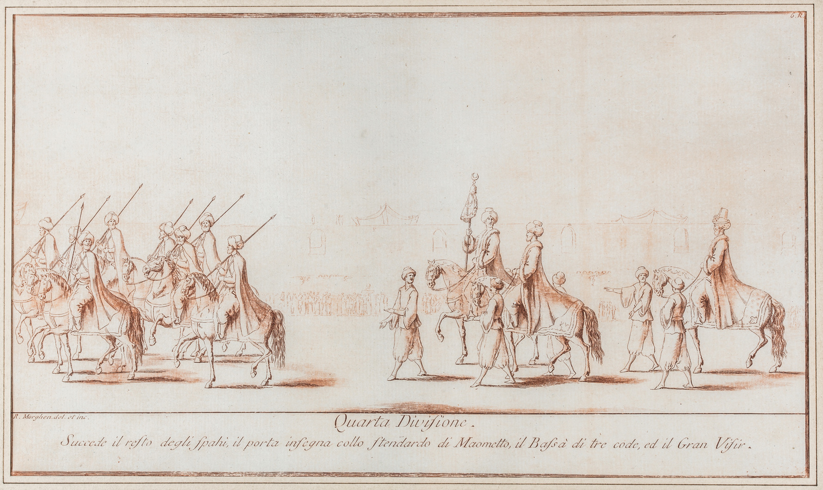 Quarta divisione: Succede il resto degli spahi, il porta insegna collo stendardo di Maometto, il Bafsà di tre corde ed il Gran Visir;