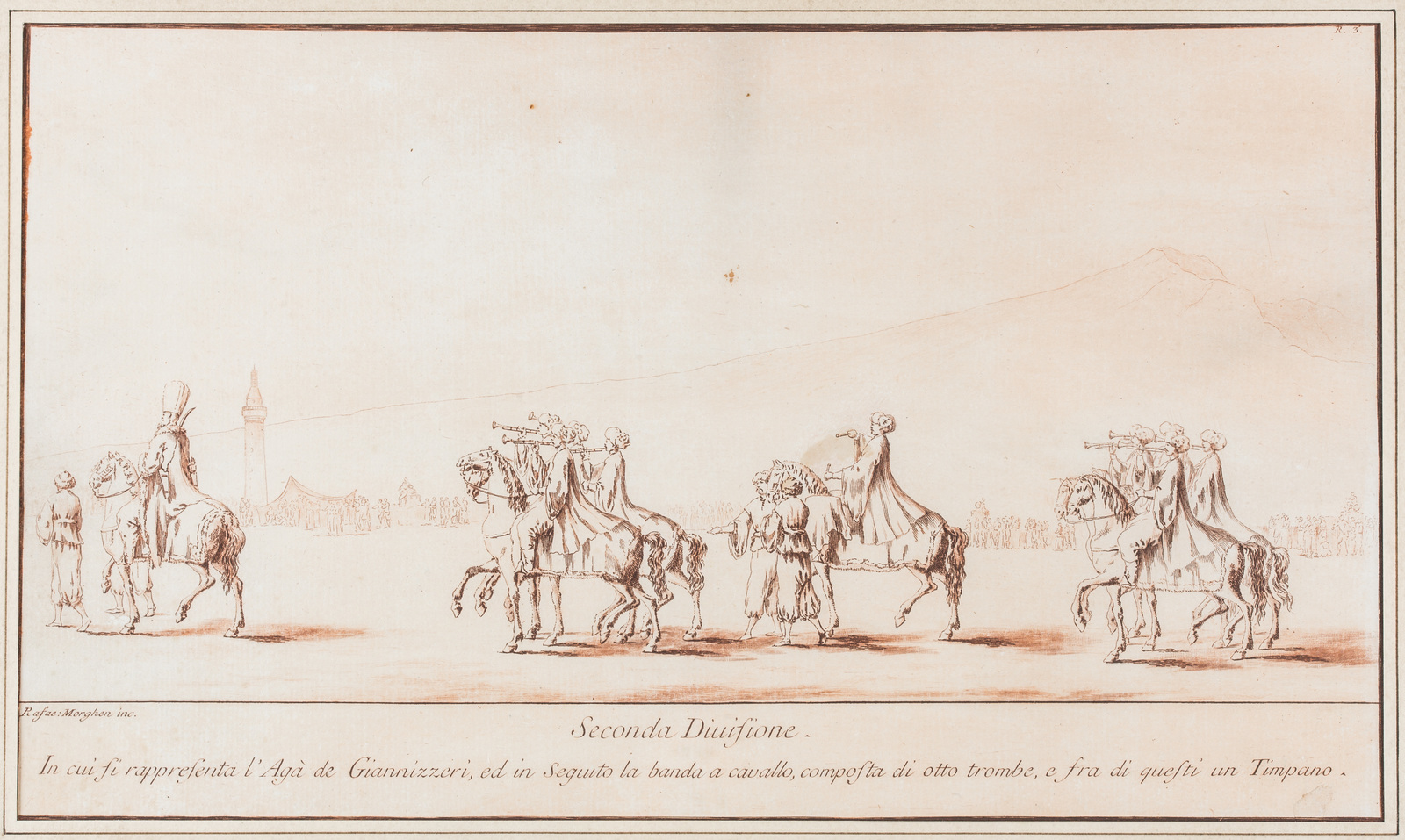 Seconda divisione: In cui fi rappresenta l'Agà de Gianizzeri ed in seguito la banda a cavallo, composta di otto trombe. e fra di questi un timpano;