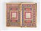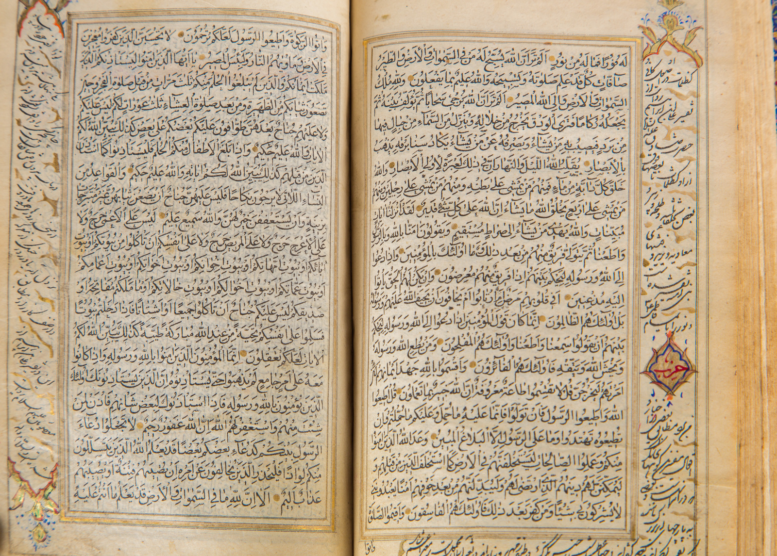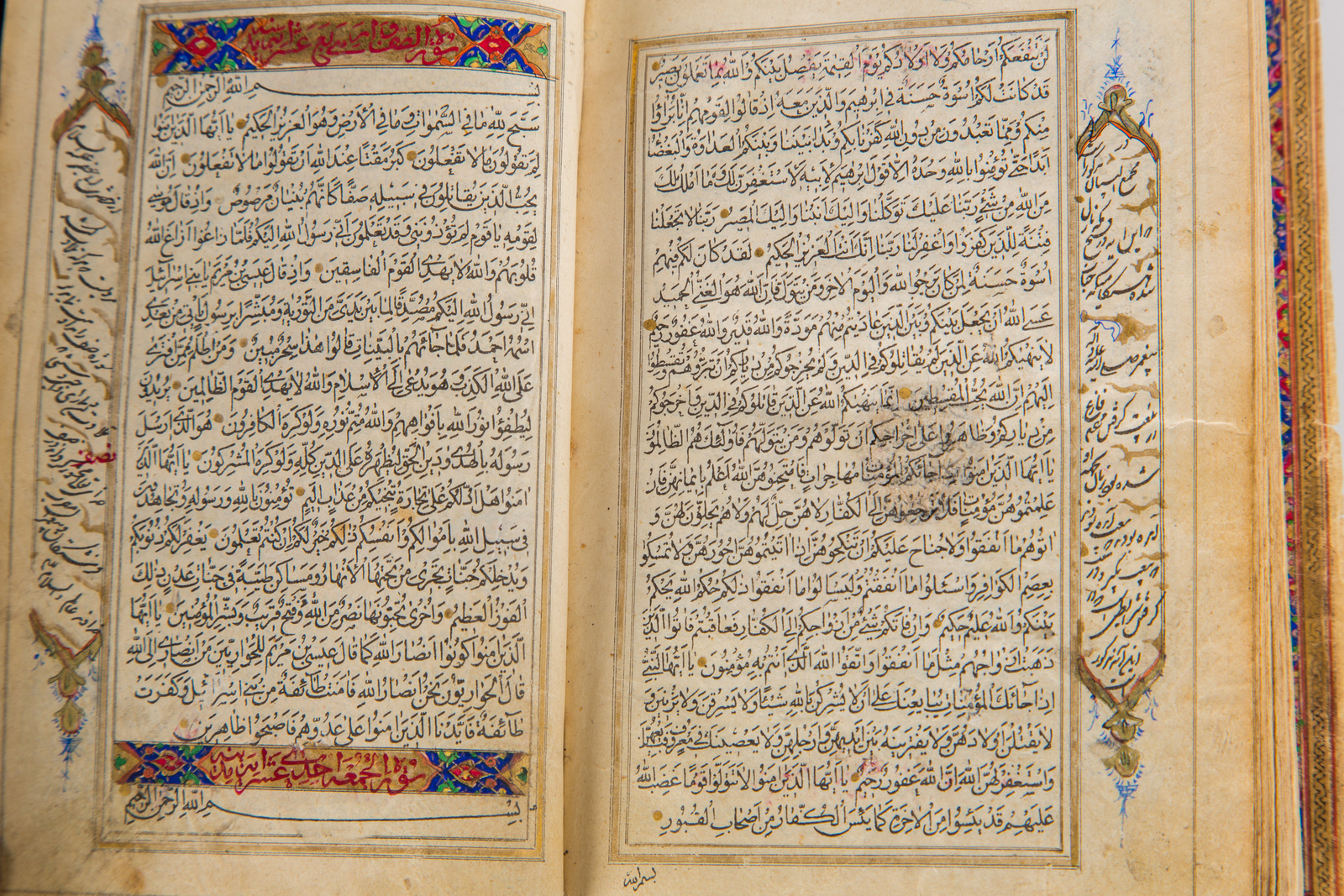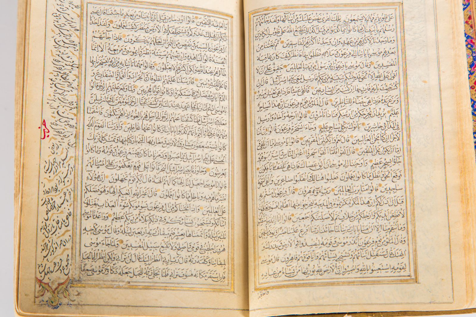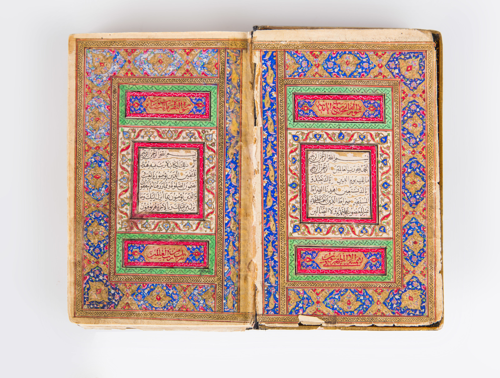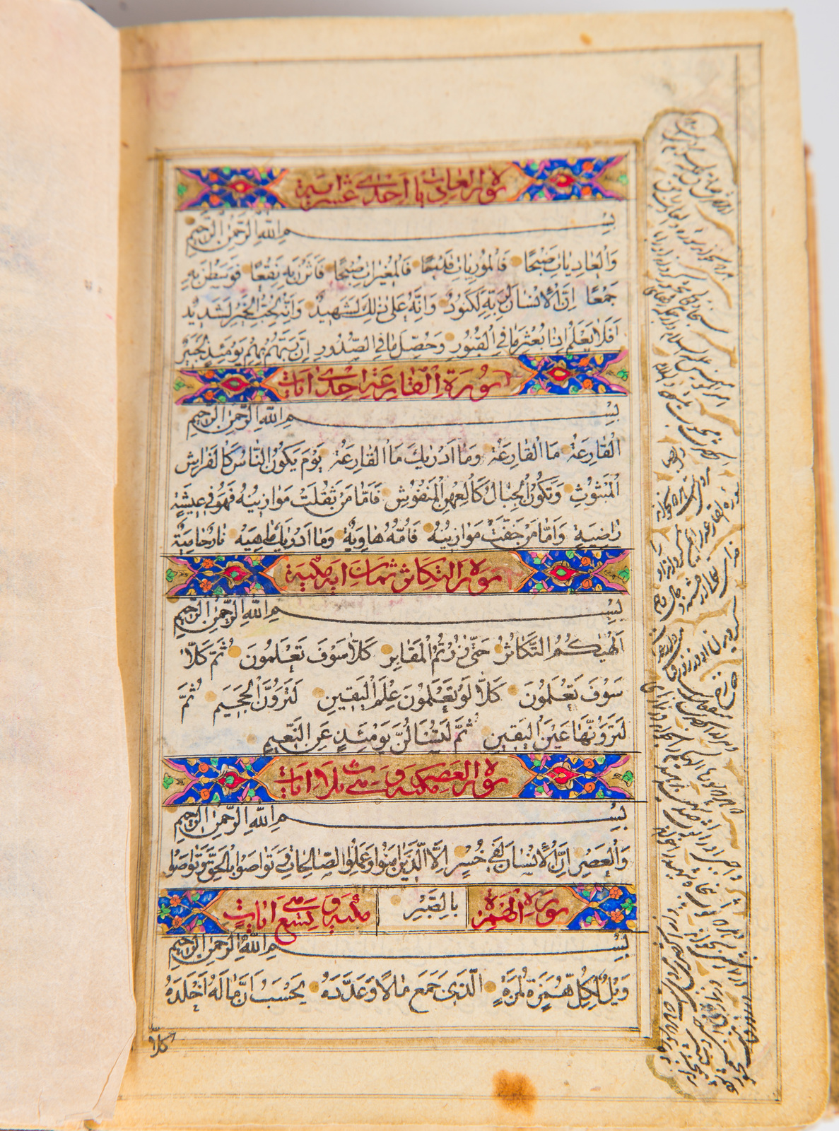 . -. Cm 9,50 x 14,50. Copia litografica in arabo su carta, composta da 150 carte, specchio di scrittura 110 X 60 mm delimitato da triplo filetto nero e contenente 21 righe con marcatori testuali a disco, titoli delle sura manoscritti in inchiostro rosso entro cartiglio su sfondo dorato terminante con arabeschi su sfondo blu cobalto. I margini di molte pagine sono arricchiti da cartigli lobati e dorati con note in persiano shikaste e dettagli in rosso e blu cobalto. Doppio frontespizio finemente illuminato e dorato. Rilegatura coeva in papier maché raffigurante fiori su sfondo rosso.