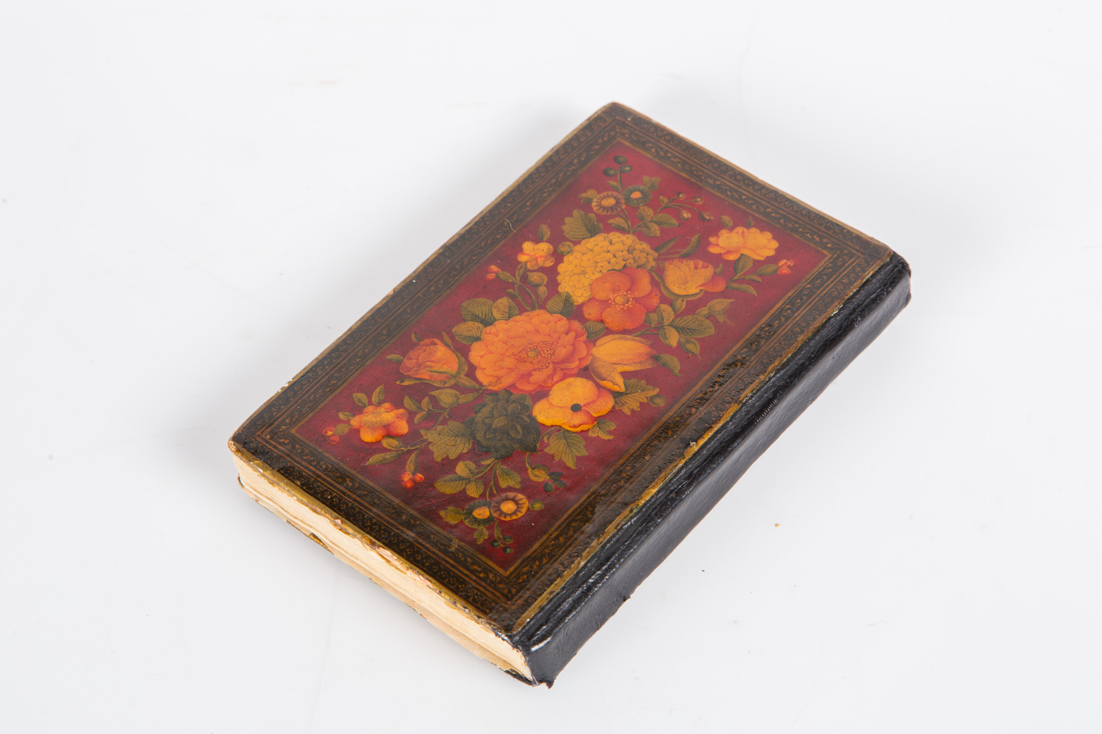 Persia, 19th century . . Cm 9,50 x 14,50. A litographic copy on paper, composed of 150 folios with 21 lines to the page separated by roundels. Surah headings in red over golden ground within lobed cartouches with arabesque finials. Persian notes in the margins, double finely illuminated opening page. Papier maché binding decorated with flower over red ground.