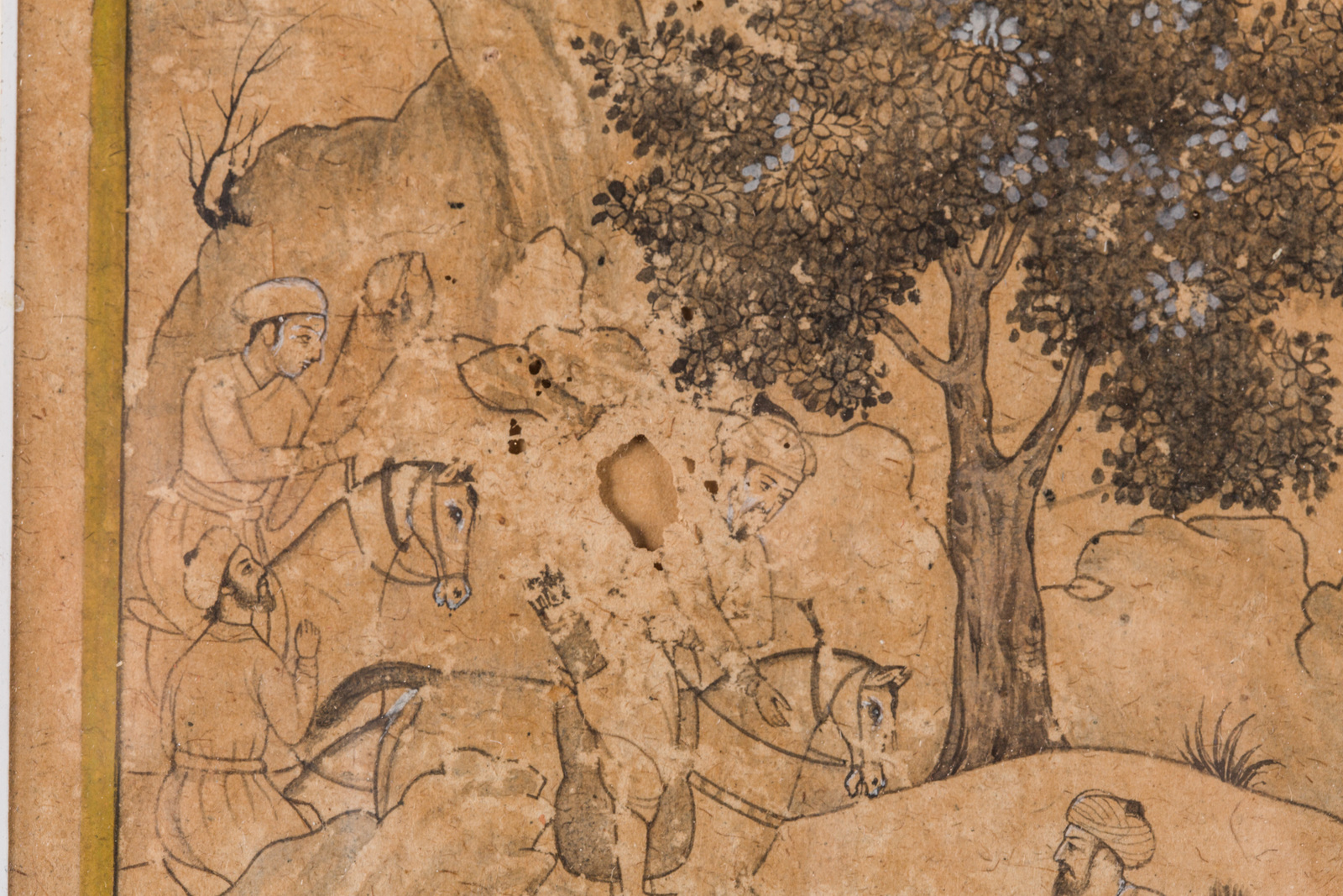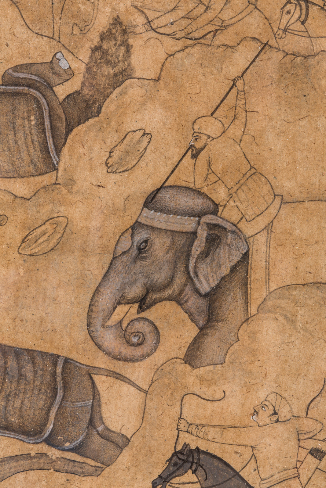 . -. Cm 14,00 x 24,00. di formato verticale raffigurante una concitata scena di caccia alla quale partecipa anche un mahot in sella ad un elefante. Gli alti orizzonti sono caratterizzati da una resa tipica della scuola Mughal.