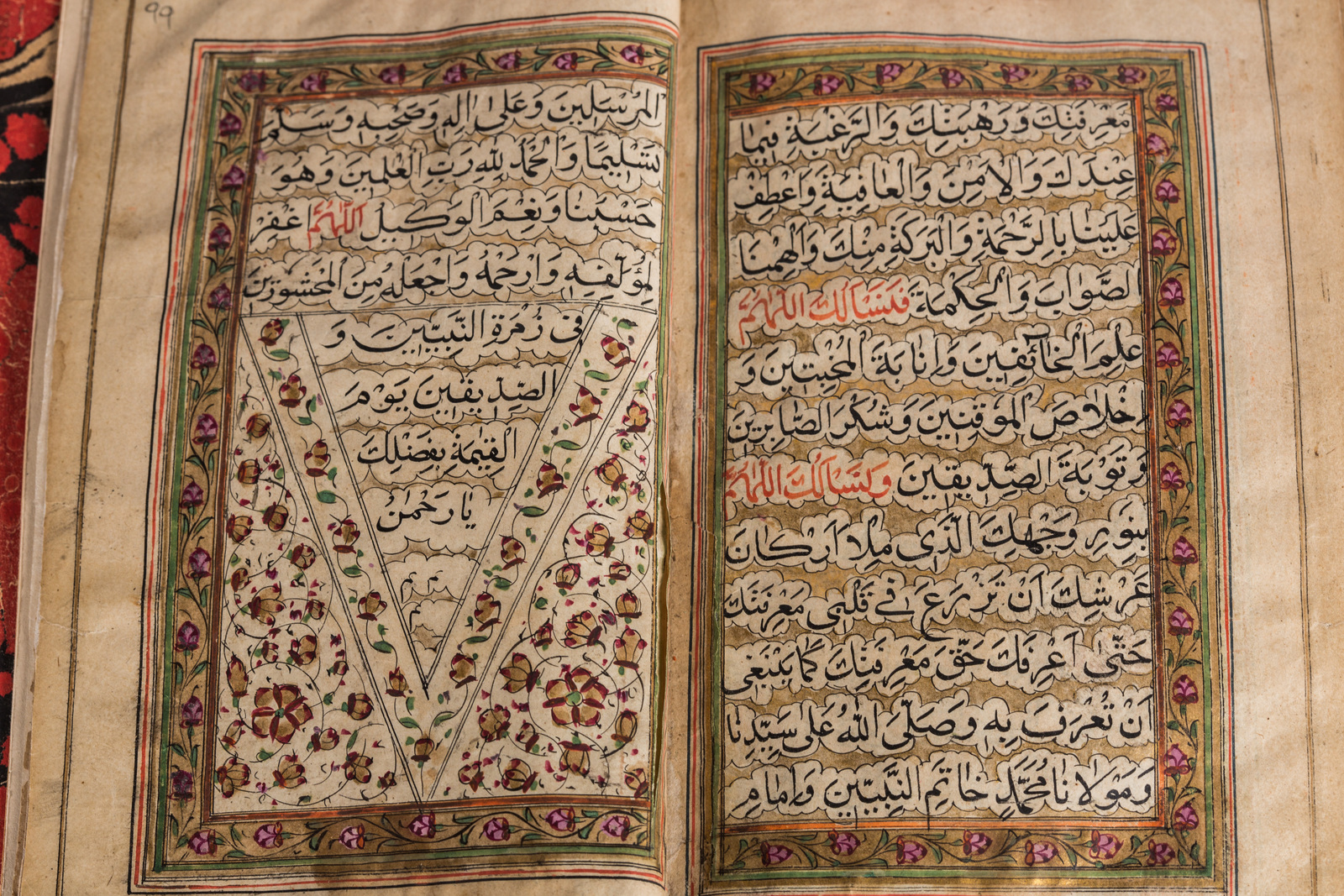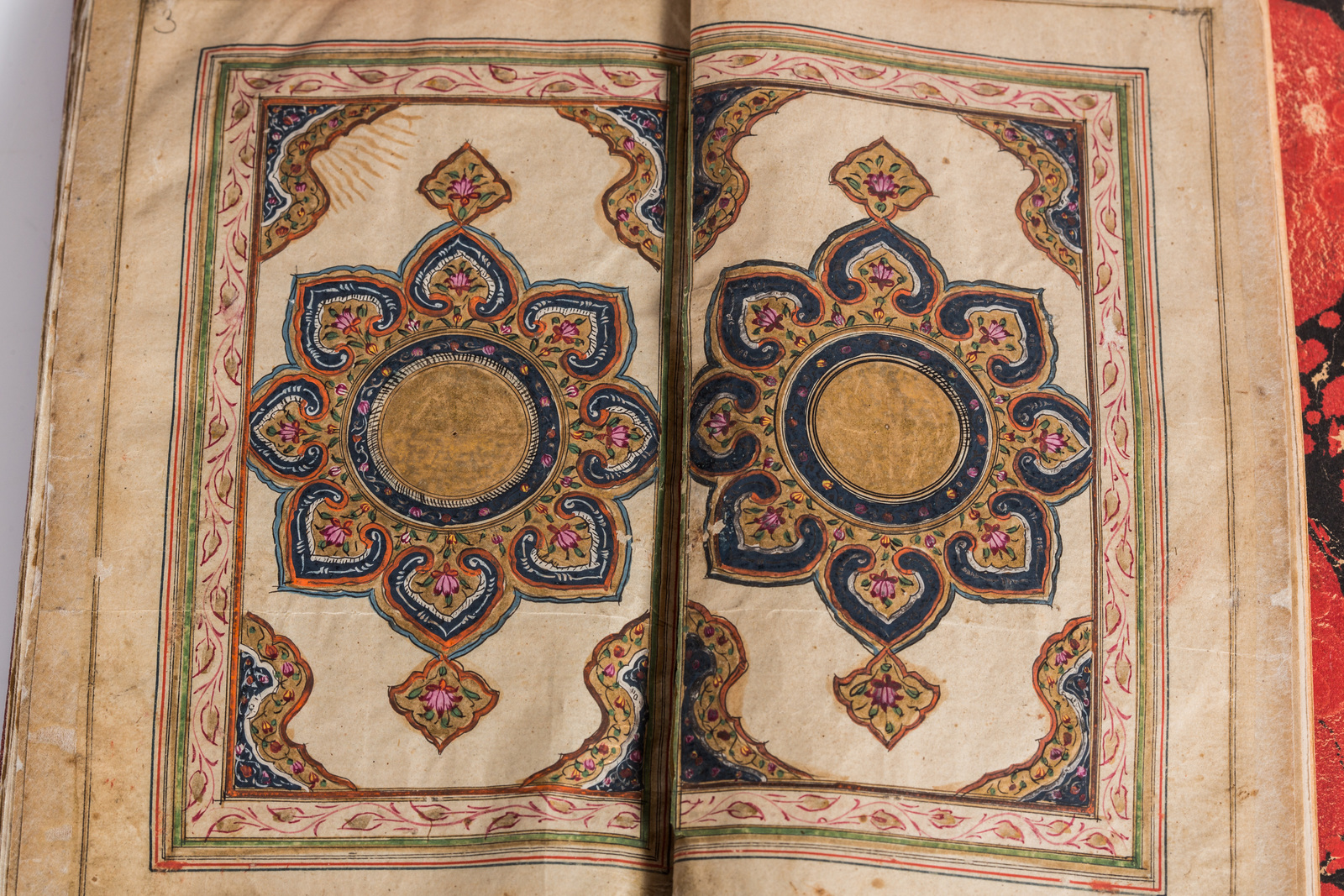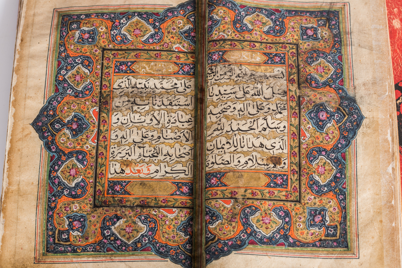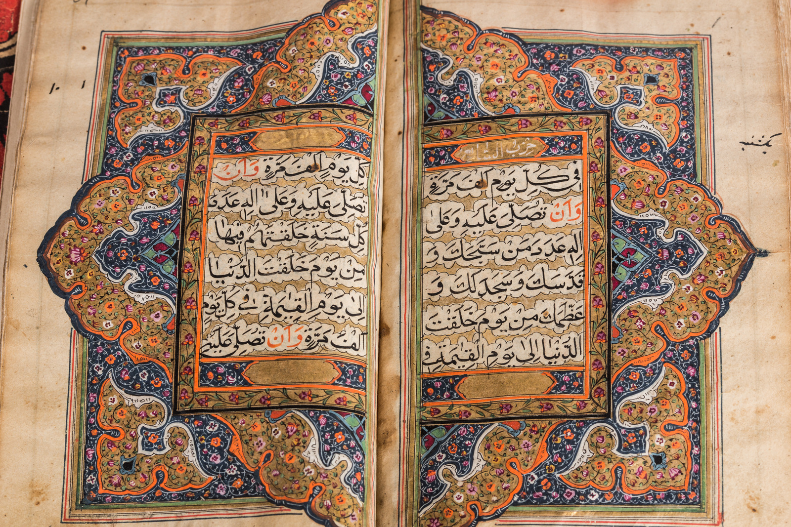 India, XIX - XX secolo . -. Cm 10,00 x 16,50. Manoscritto in arabo su carta composto 97 carte e due bianche in principio e fine. Specchio di scrittura 124 X 72 mm delimitato da triplo filetto e fine cornice floreale su fondo oro. Testo scritto in inchiostro nero con parole significative in rosso, arrangiato in colonna singola su 12 righe intervallate da sfondo oro. Doppio frontespizio miniato in oro, rosa, arancione e blu e doppia miniatura di Mecca e Medina. Legatura in pelle rossa con applicazioni stampate in cuoio.
