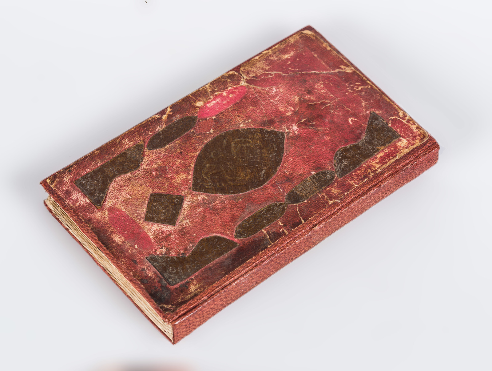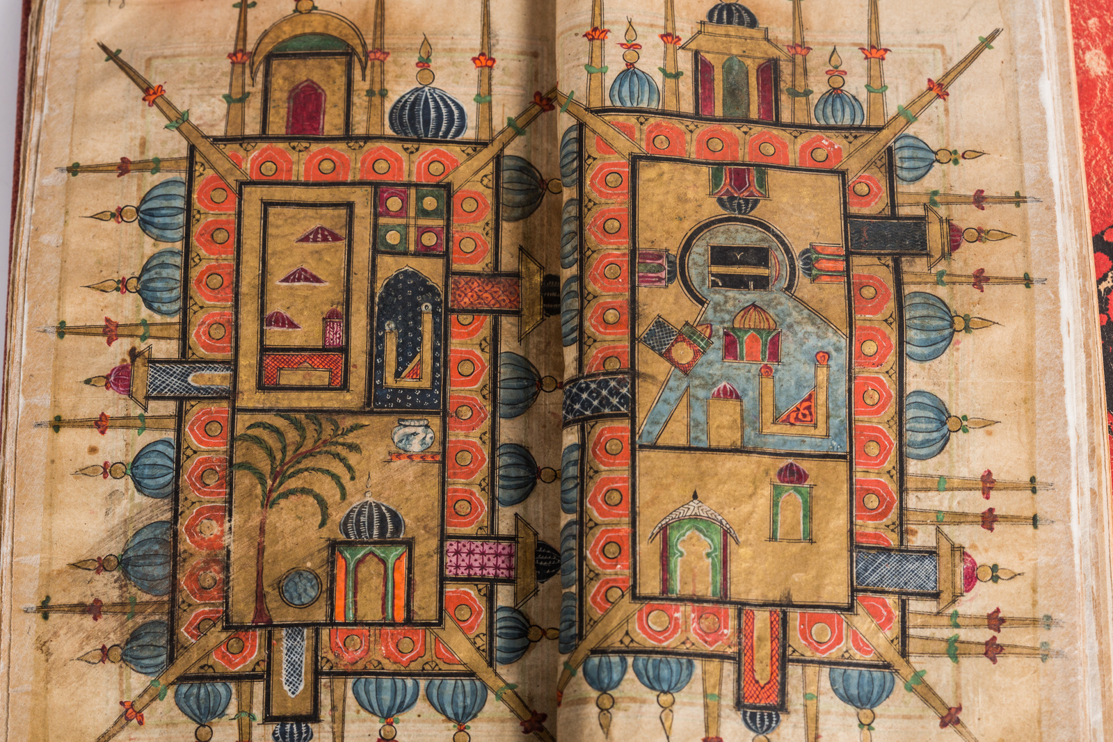 India, 18th - 19th century . . Cm 10,00 x 16,50. Arabic manuscript on paper composed of 97 folios and 4 fly leaves. 12 lines to the page on single colomn in black ink intersperesd by gold ground. Double illuminated opening page and painting of Mecca and Medina. Red leather binding with impressed leather applications.