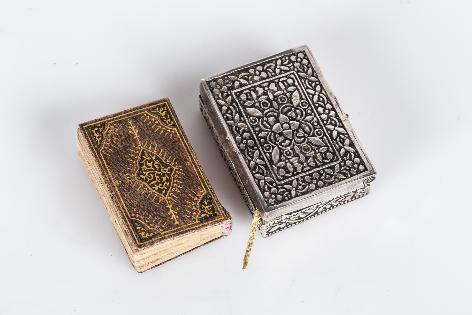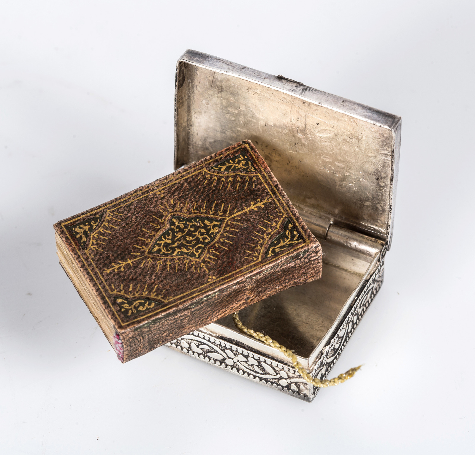 Islamic Art Small pocket Quran written in gold, copied by a woman, Fatemeh Bent Al Ostad Yahya Halmi within its silver case, dated 1299 (1882 AD) . . Cm 3,50 x 5,00. An extremely fine Arabic manuscript on paper composed of 124 folios and 3 fly leaves. Folio 45 X 27 mm, gilded text on single colomn of 43 lines to the page. Surah headings written in red over golden ground and golden section marks. Double finely illuminated opening page. Cut leather binding and silver box decorated with vegetal motifs.