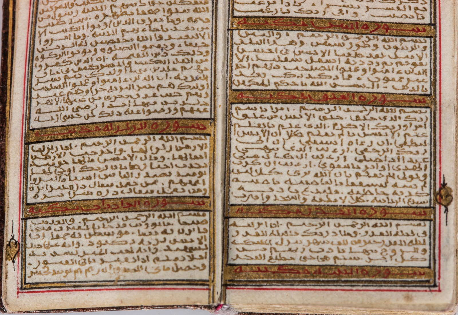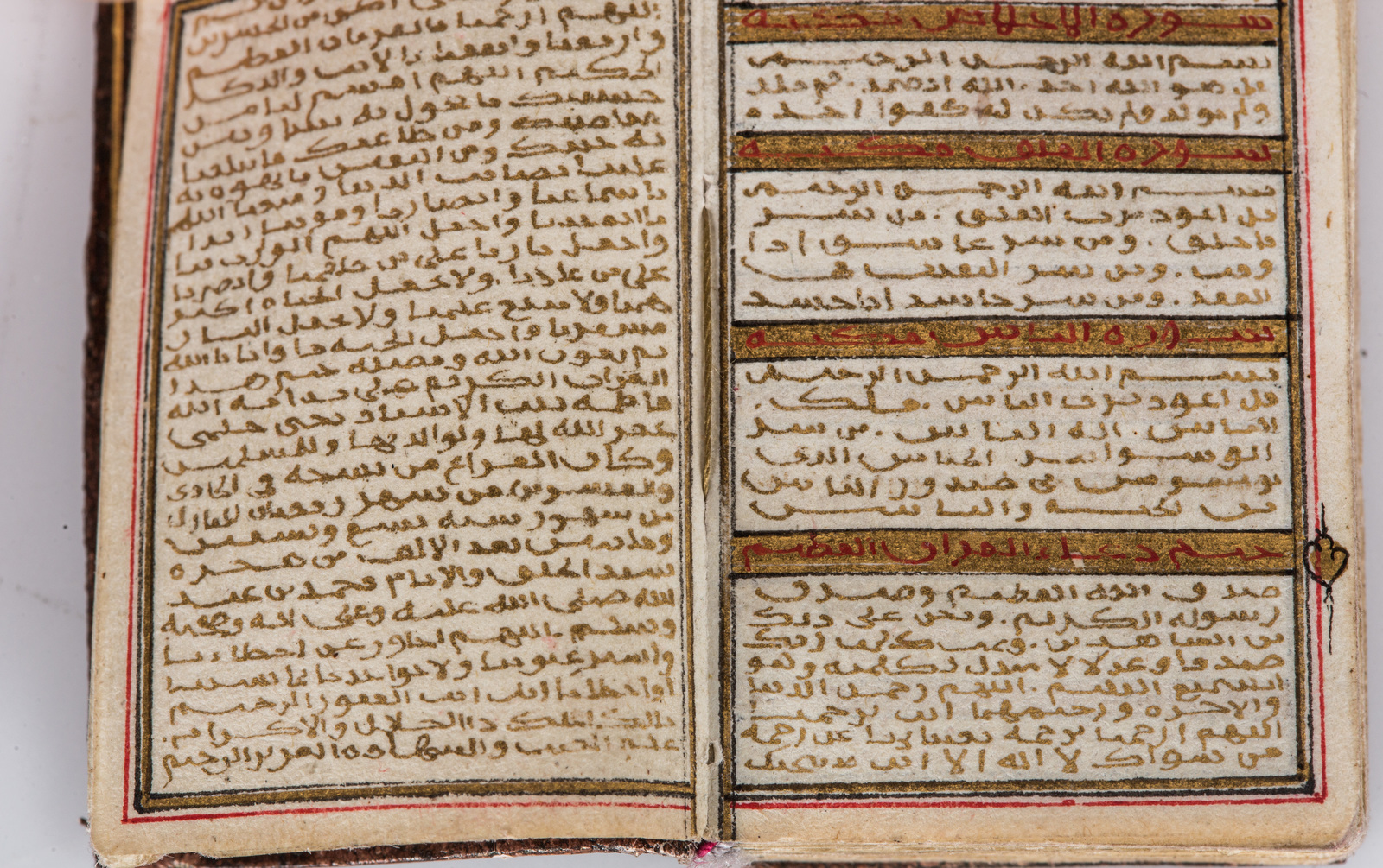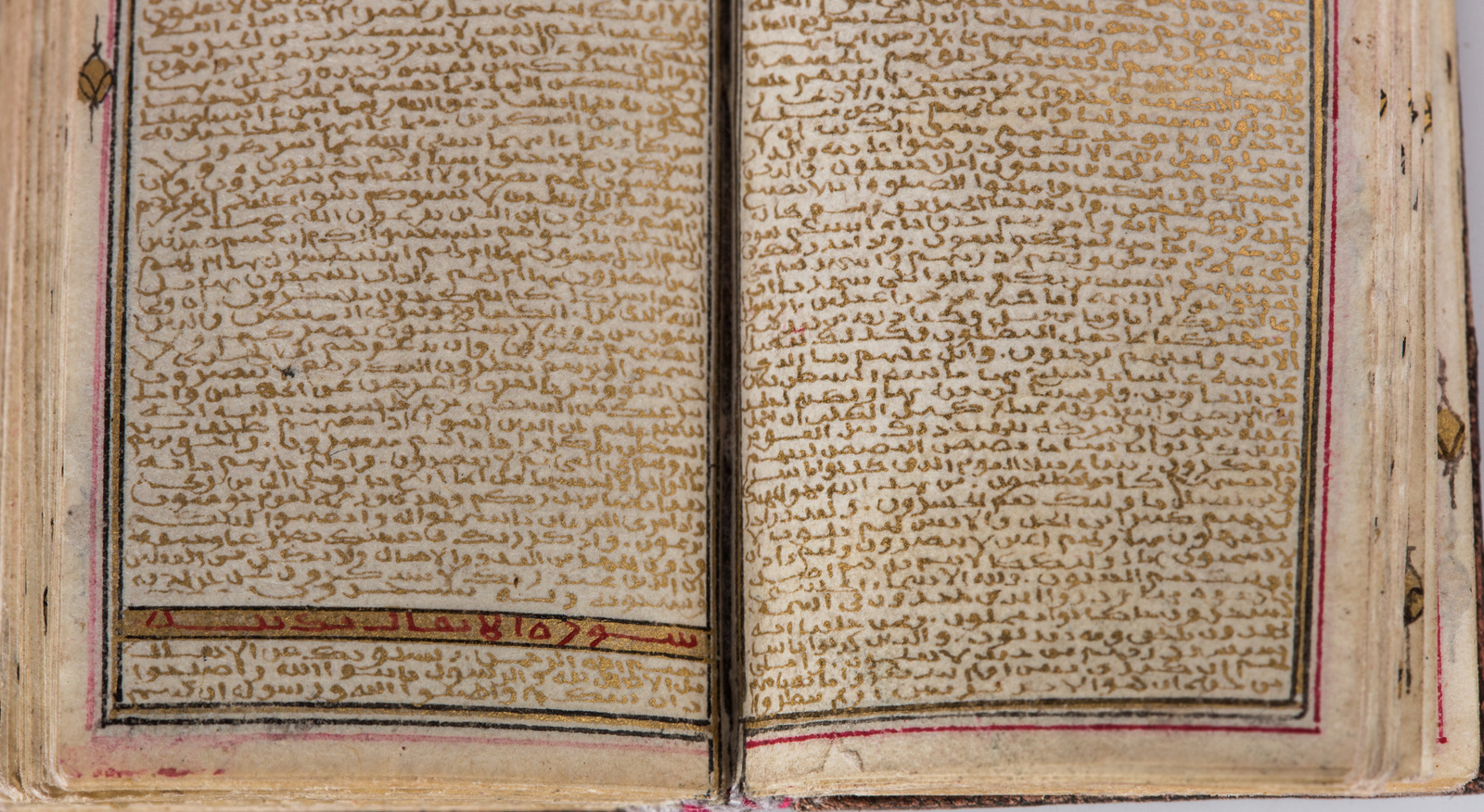Datato 1299 (1882 AD). -. Cm 3,50 x 5,00. Finissimo manoscritto in arabo su carta, composto da 124 carte e 3 carte bianche in principio e fine. Dimensioni del foglio 45 X 27 mm, specchio di scrittura 38 X 25 mm delimitato da triplo filetto, testo scritto in oro, disposto su colonna singola contenente 43 righe, titoli delle sura in rosso su sfondo oro e marcatori di sezione dorati. Doppio frontespizio finemente illuminato con arabeschi intrecciati su fondo blu cobalto.