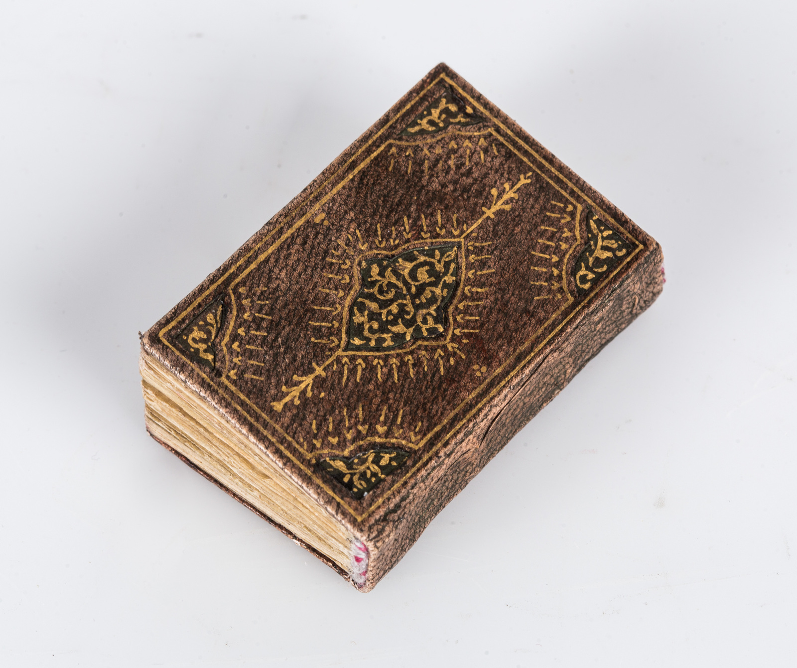 Rilegatura in pelle intagliata con medaglione centrale e cantonali dipinti con mezze palmette dorate su fondo verde.