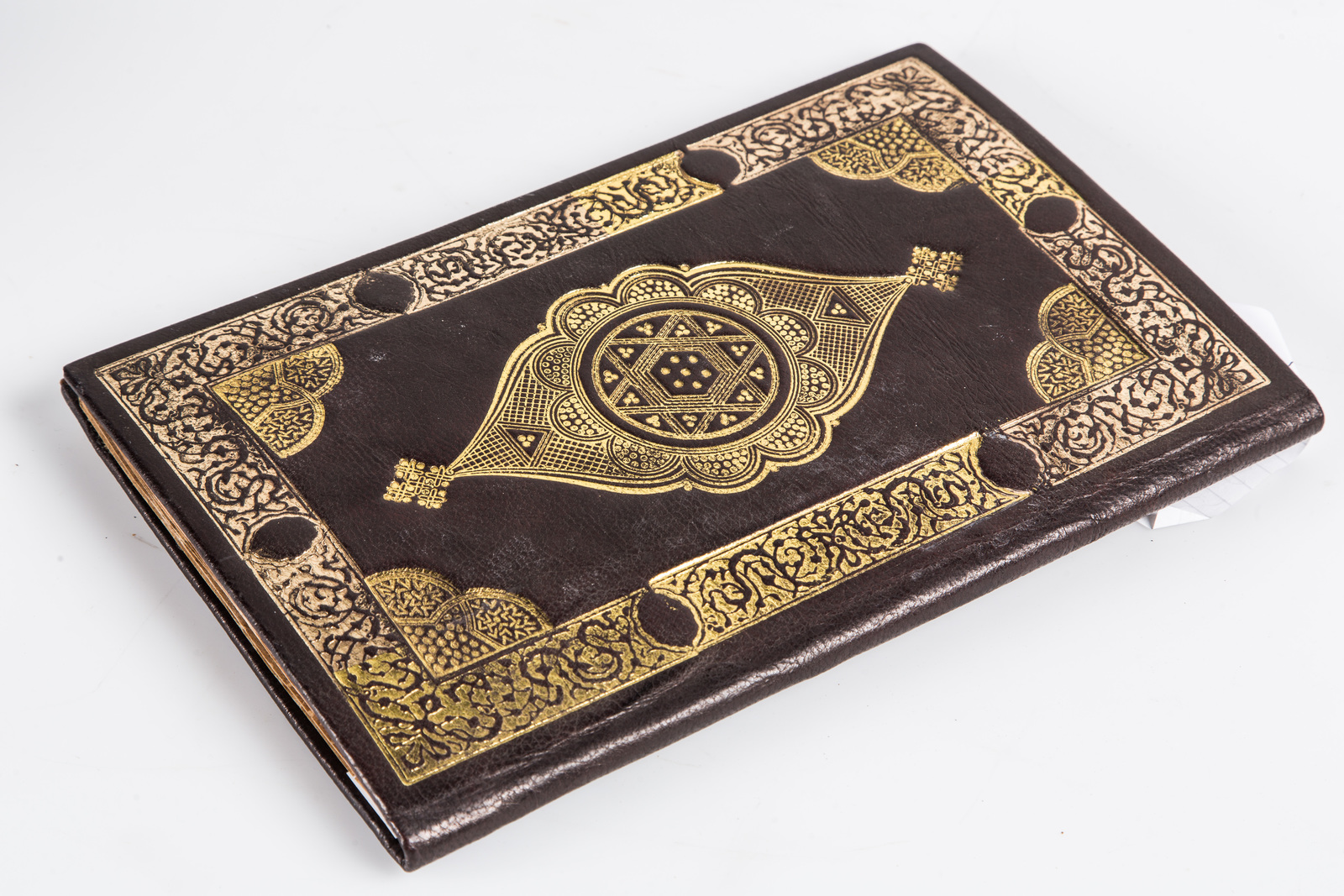Arabic manuscript on paper, composed of 17 folios and 4 fly leaves. 17 lines to the page written in Eastern Kufic script on single colomn with drop shaped textual marks and rosette section marks in the margins. Yellow Surah headings. Later leather cover.
