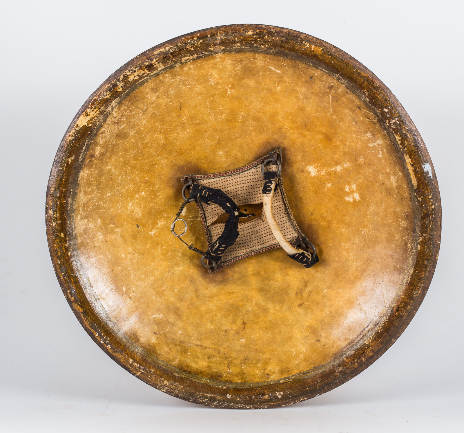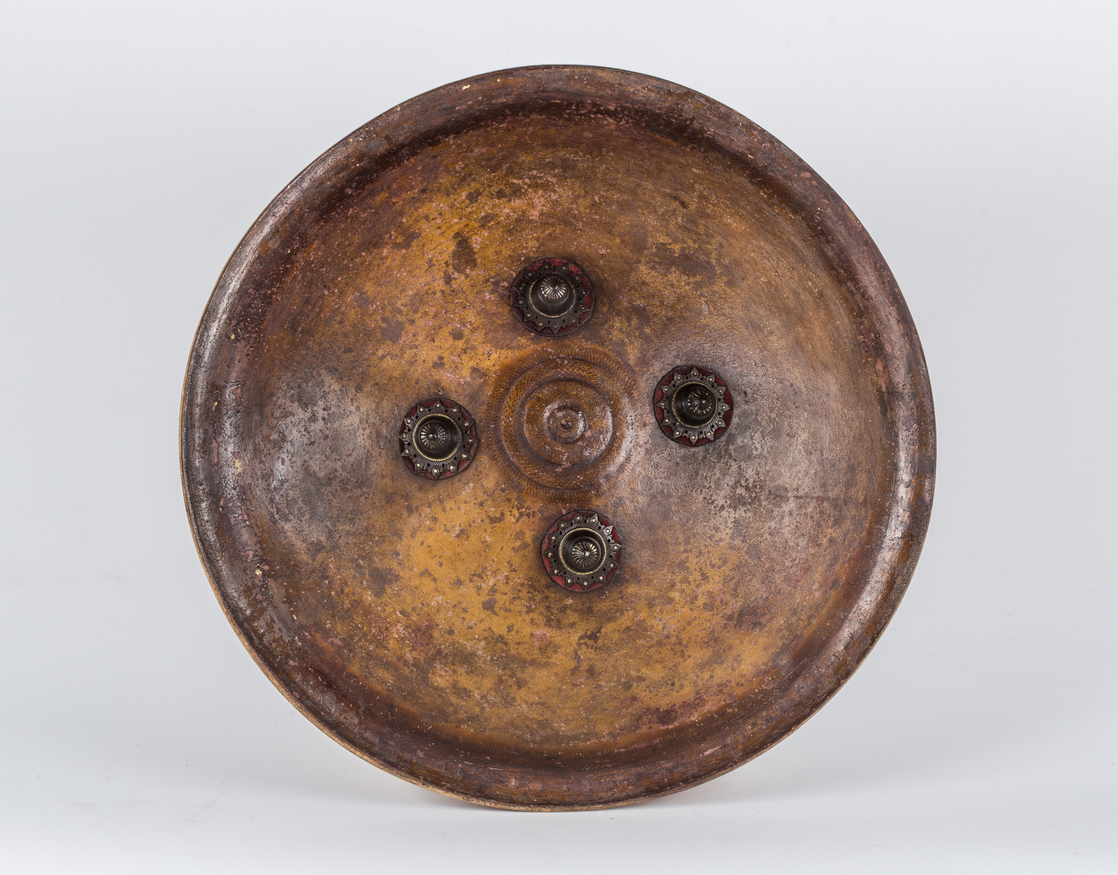 India, XVIII secolo . -. Cm 55,00. dalla forma circolare ricurva con quattro umboni centrali e impugnatura sul retro.
