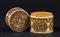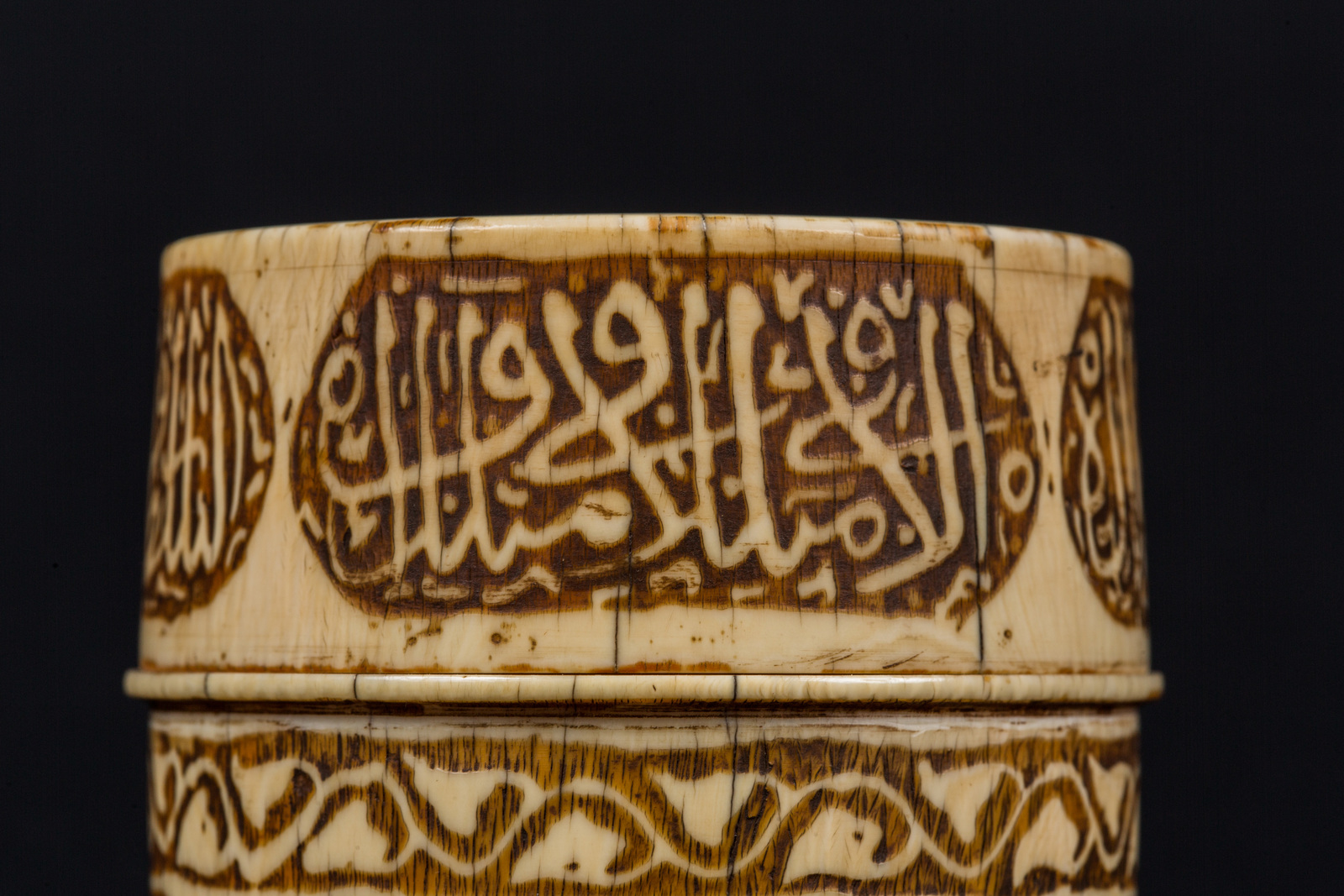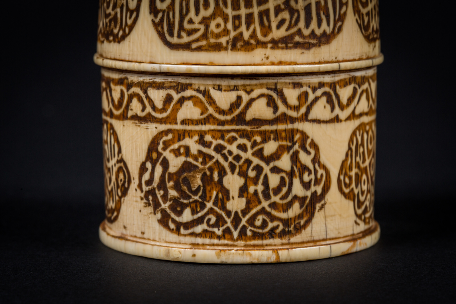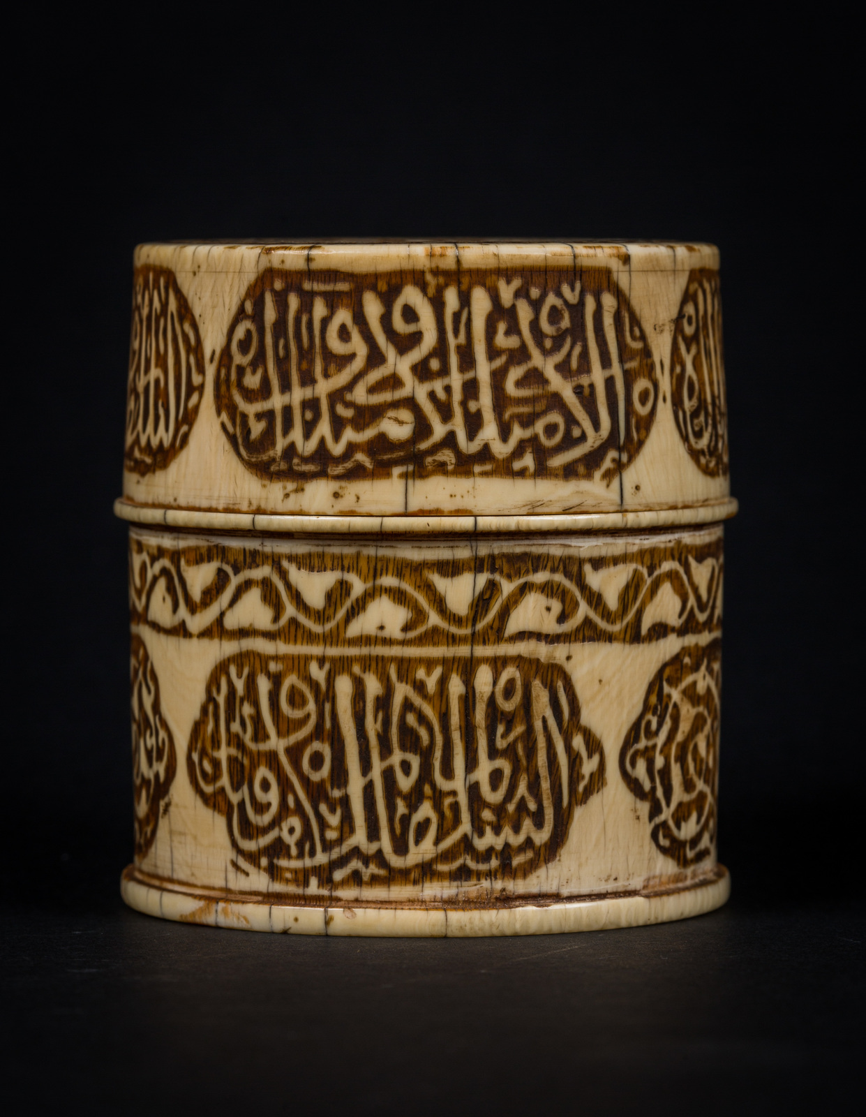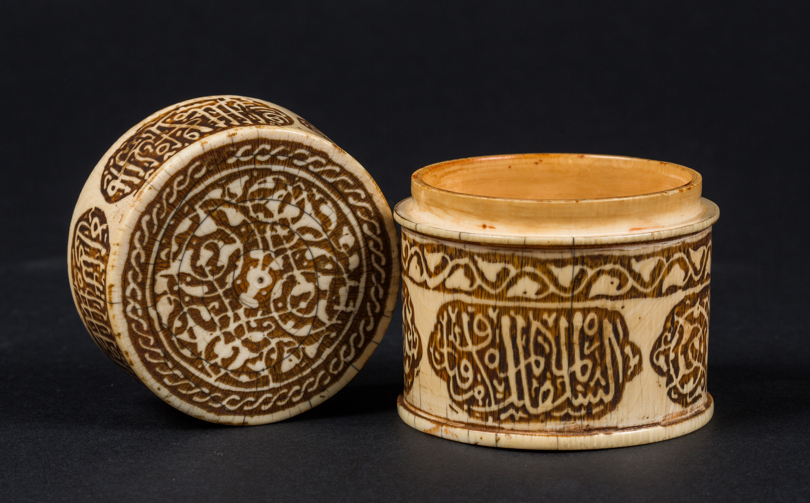 Ottoman empire, possibly 16th century. . Cm 7,00 x 8,00. Round body and lid, both carved with floral wheels and cartouches containing religious calligraphic inscriptions in Arabic. The lid is finely carved with intertwined arabesques resting within a round medallion circumscribed by a chain shaped decor.