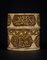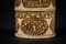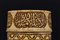 Il coperchio è finemente intagliato con arabeschi intrecciati entro medaglione circolare delimitato da decoro a catena.